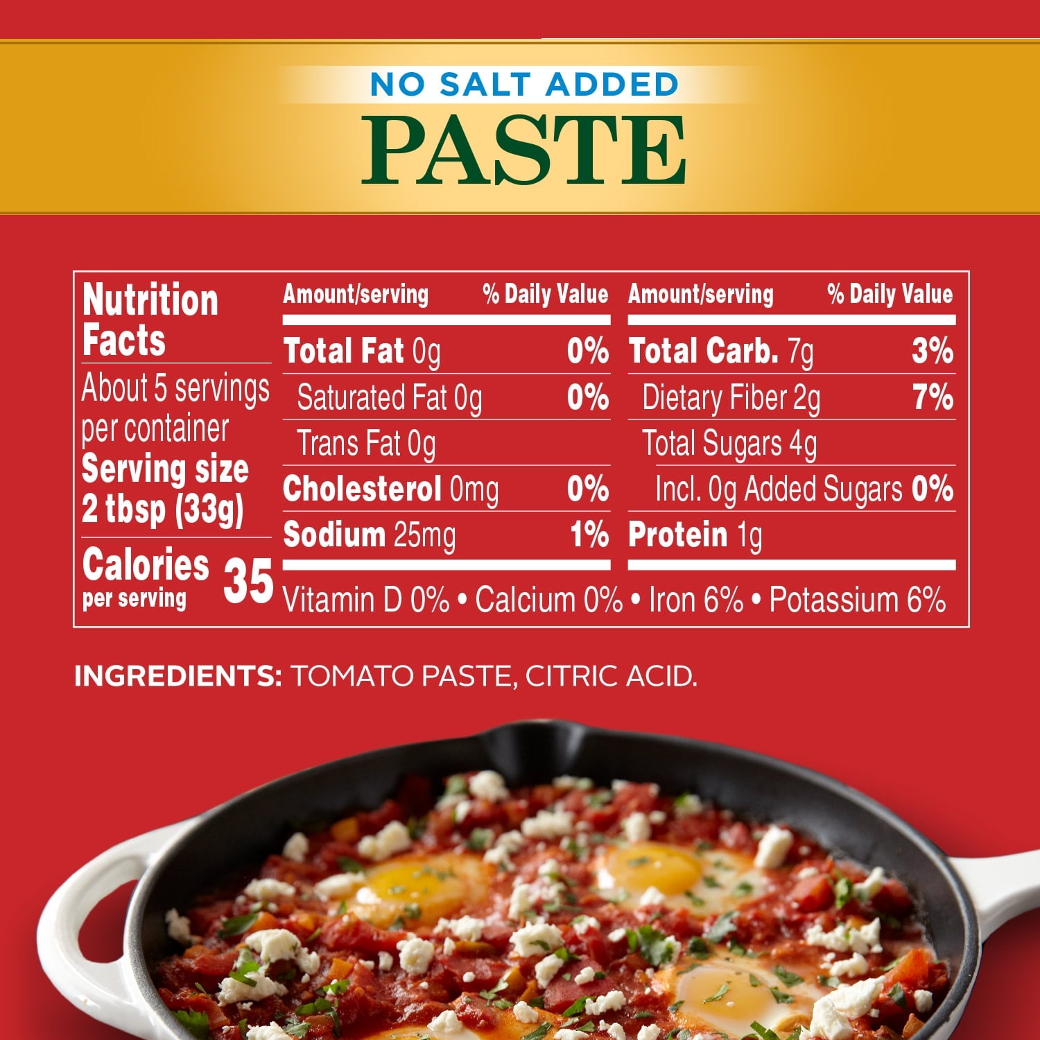 Enjoy the rich flavor of Hunt's without the added sodium with Hunt's Tomato Paste, No Salt Added. Simmered with natural spices, Hunt's no-salt-added tomato paste is perfect in low-sodium chili, soups, and stews. Add body to sauces with the extra-thick and rich texture, made using concentrated, strained tomatoes. No compromise, Hunt's Tomato Paste is 100% natural, with no artificial preservatives. Hunt's Tomato Paste adds a burst of rich tomato flavor to your recipes. Contains 6 oz of paste; 30 calories per serving. Hunt's tomatoes are picked at the peak of ripeness, because great tasting meals start with great ingredients.