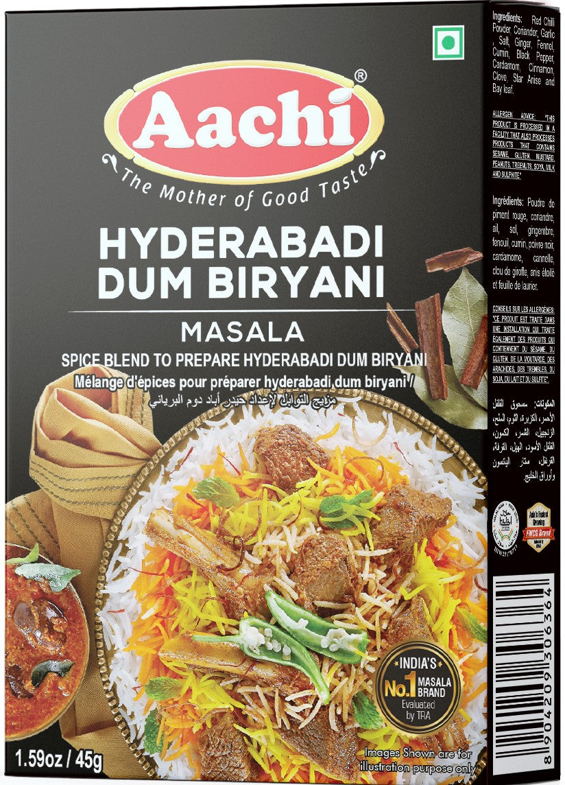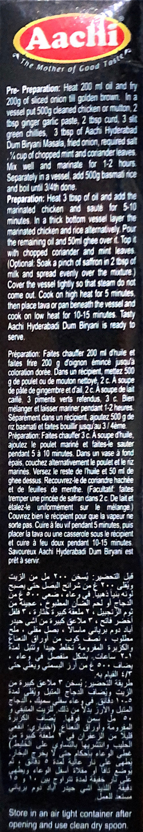 Heat 200ml oil and fry 200g of sliced onion until golden brown. In a vessel, put 500g cleaned chicken or mutton, 2 tbsp ginger galic pasta, 2 tbsp curd, 3 slit green chillies, 3 tbsp of Aachi Hyderabadi Dum Biryani Masala, fried onion, required salt, 1/4 cup of chopped mint and coriander leaves. Mix well and marinate for 1-2 hours. Seperately in a vessel , add 500g of basmati rice and boil until 3/4th done.
