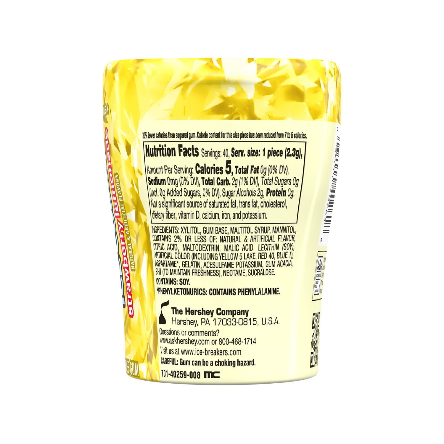 Contains one (1) 3.24-ounce, 40-piece cube bottle filled with ICE BREAKERS ICE CUBES Strawberry Lemonade Flavored Sugar Free Chewing Gum