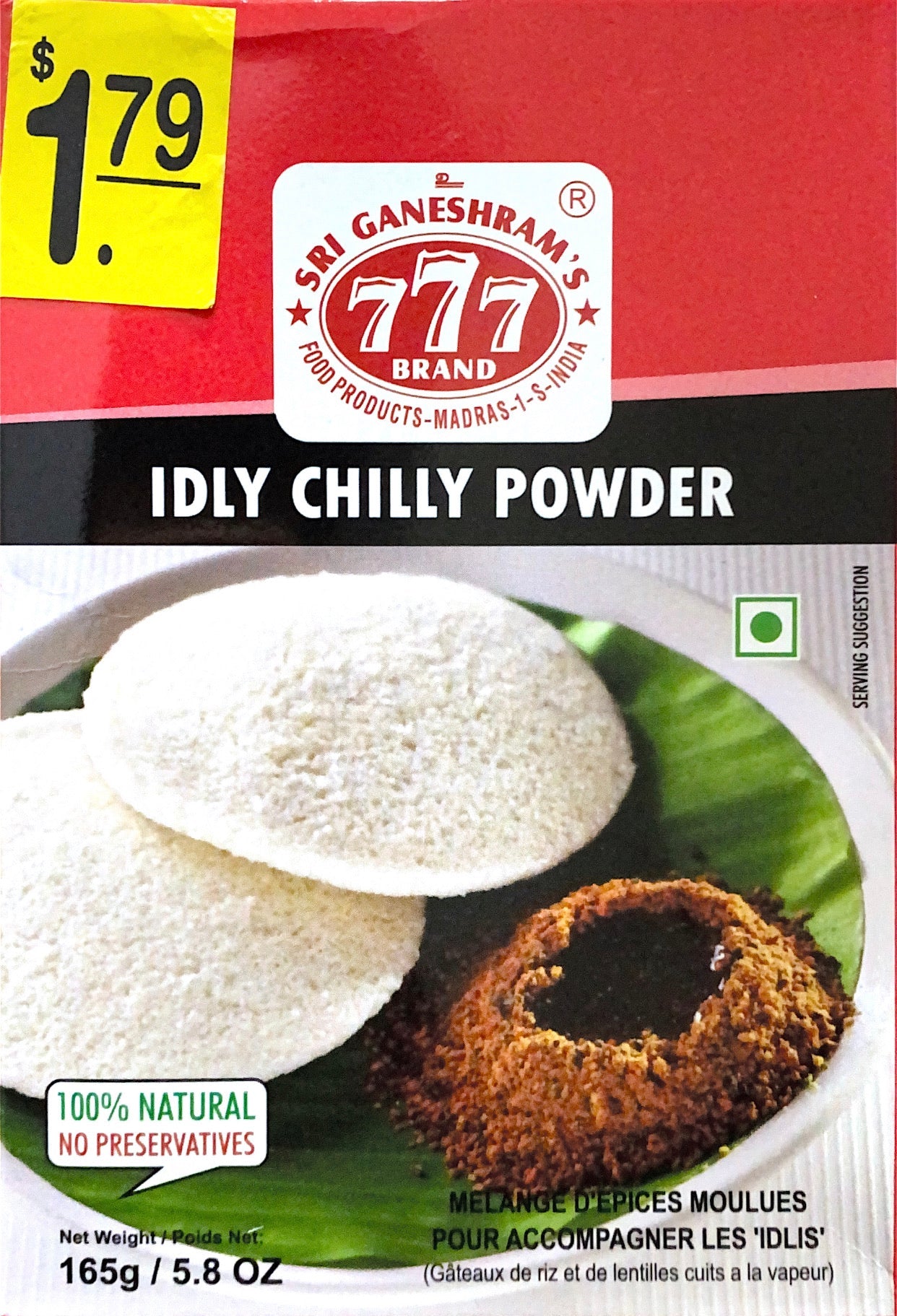 777 Idly Chilly Powder (Idly molagha podi) is a delicious preparation of careful blends of lentils, spices and Red chillies to give it just the right flavour and taste. It is a very good combination for idlies, dosai, oothappam and even for Adai. Idly Chilly Powder is served with Sesame Oil or Desi Ghee.