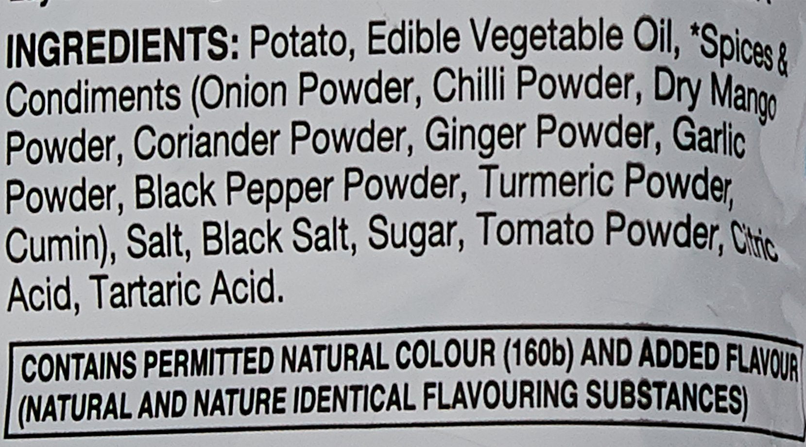 • Ingredients: Potato flakes, edible vegetables, spices & condiments, (onion powder, chilli powder, dry mango powder, coriander powder, ginger powder, garlic powder, black pepper powder, turmeric powder, cumin), salt, black salt, sugar, tomato powder, citric acid, tartaric acid.