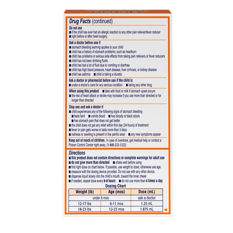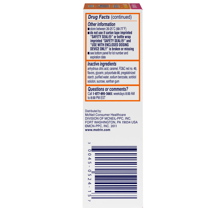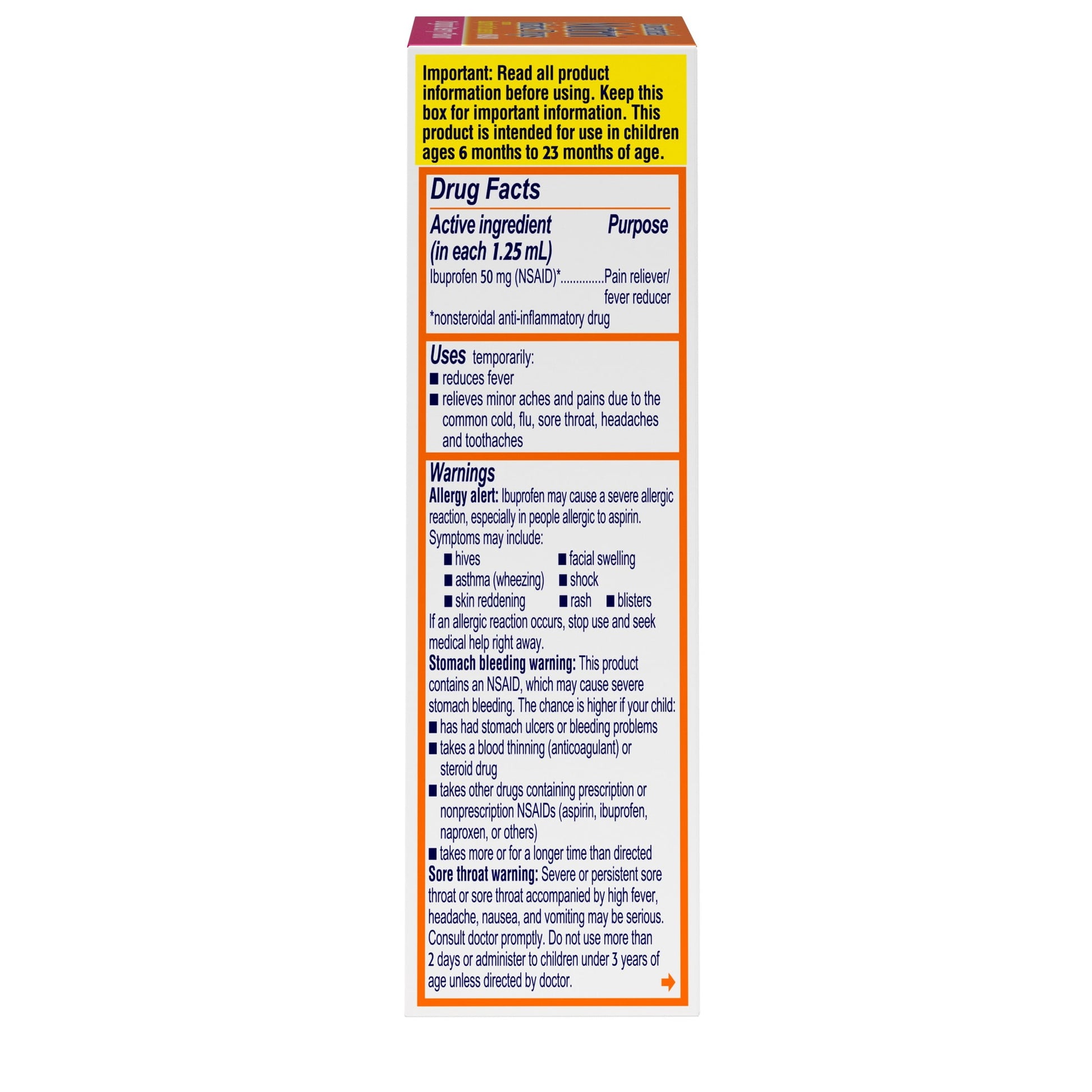 Help your little one feel better with Infants' Motrin Concentrated Drops. Containing 50 milligrams of ibuprofen per 1.25-milliliter dose, these pediatrician-recommended drops provide up to eight hours of relief from minor aches and pains due to the common cold, flu, sore throat, headaches, and toothaches. This berry-flavored formula is free of alcohol and is for use in infants 6-23 months.