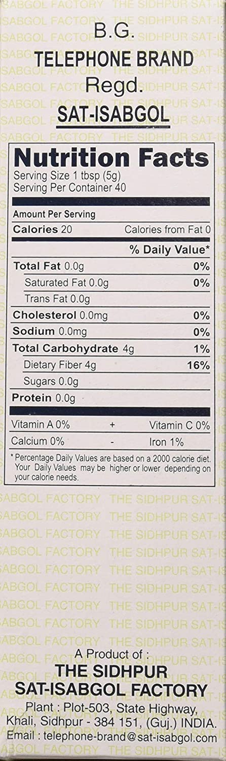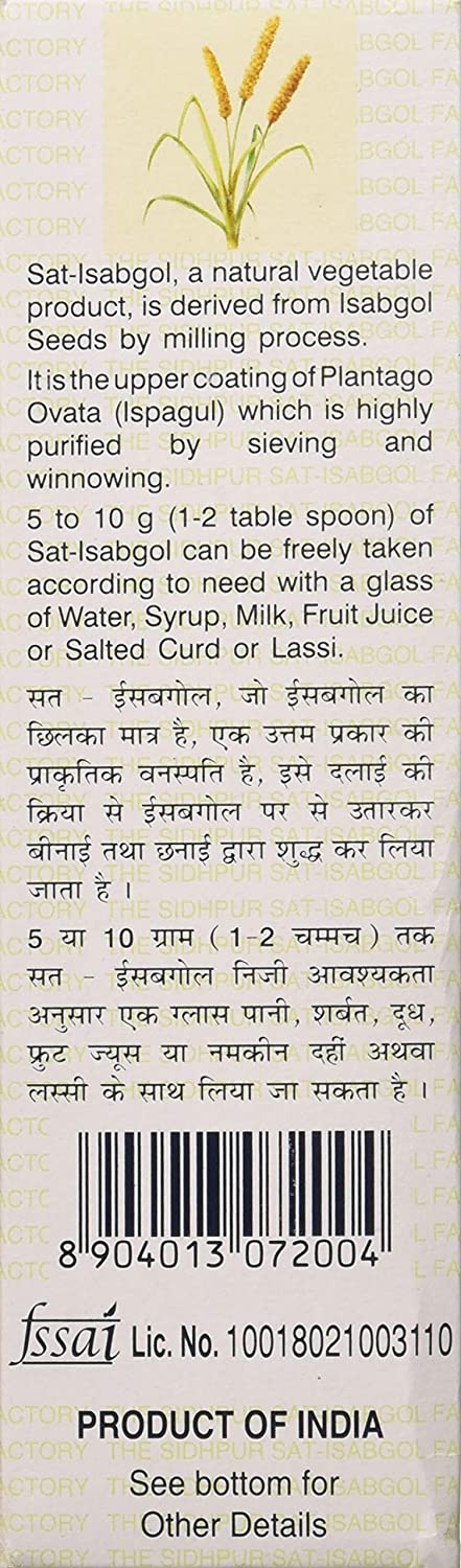 Registered Sat-Isabgol is a natural vegetable product that is derived from Isabgol seeds by milling process. Can be taken with a glass of water, syrup, milk, fruit juice or salted curd. PRODUCT SPECIFICATIONS Net Wt. 200g (7oz) Product of India Packaging: Box Product Type: Ingredients: Psyllium Husk - Sat Isabgol