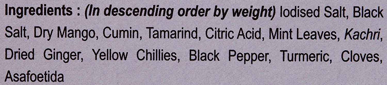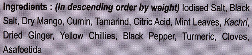Ingredients : Iodised Salt, Black Salt, Dry Mango, Cumin, Tamarind, Citric Acid, Mint Leaves, Kachri, Dried Ginger, Yellow Chillies, Black Pepper, Turmeric, Cloves, Asafoetida.
