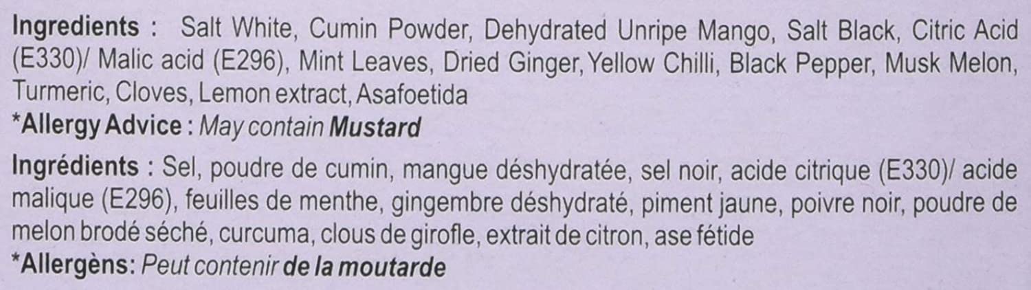 Ingredients : Iodised Salt, Black Salt, Dry Mango, Cumin, Tamarind, Citric Acid, Mint Leaves, Kachri, Dried Ginger, Yellow Chillies, Black Pepper, Turmeric, Cloves, Asafoetida.