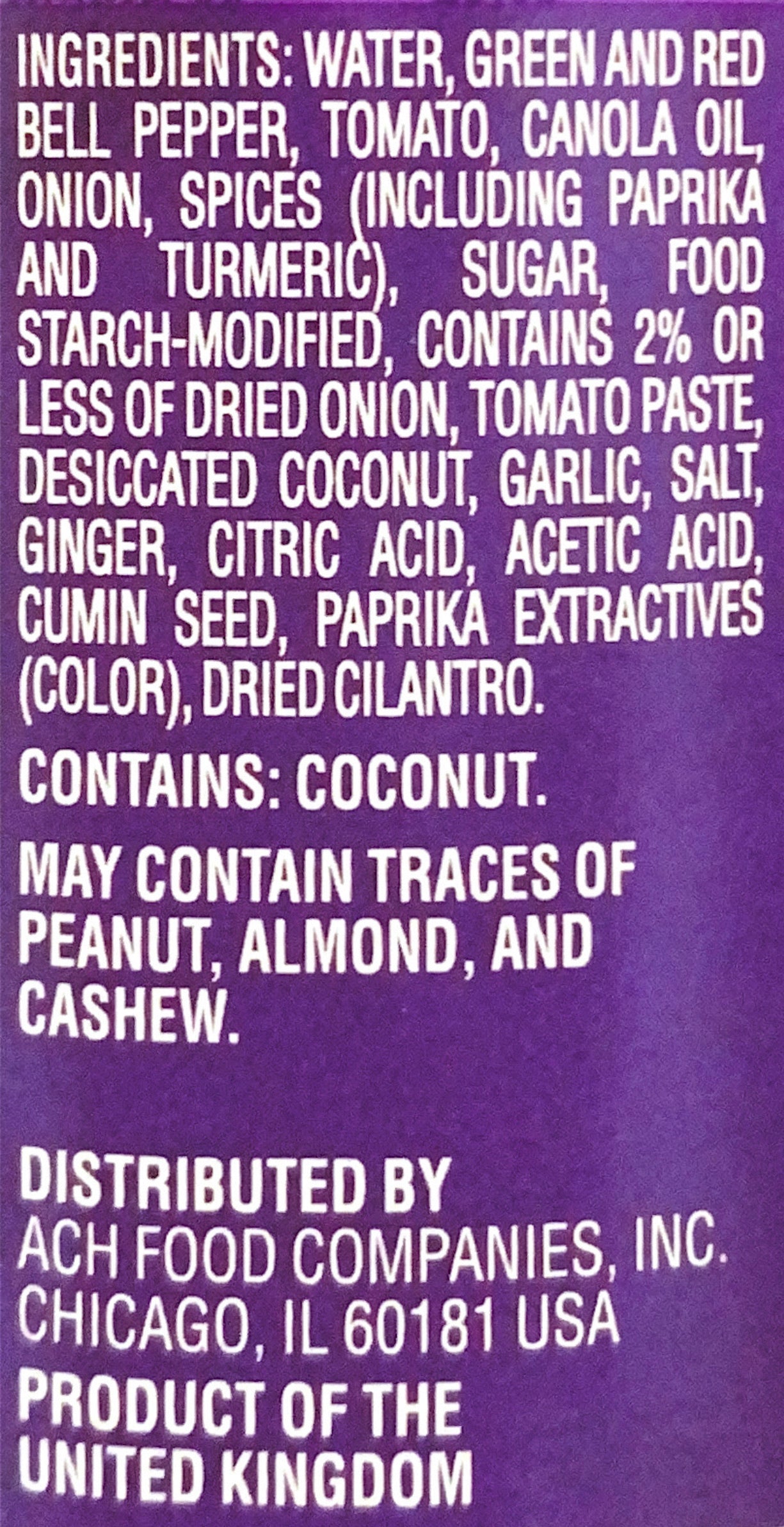 INGREDIENTS: WATER, GREEN AND RED BELL PEPPER, ONION, TOMATO, CANOLA OIL, SPICES (INCLUDING PAPRIKA, TURMERIC AND MUSTARD), SUGAR, FOOD STARCH-MODIFIED, CONTAINS 2% OR LESS OF TOMATO PASTE, DESICCATED COCONUT, GARLIC, SALT, GINGER, CITRIC ACID, ACETIC ACID, CUMIN SEED, PAPRIKA OLEORESIN (COLOR) DRIED CILANTRO.