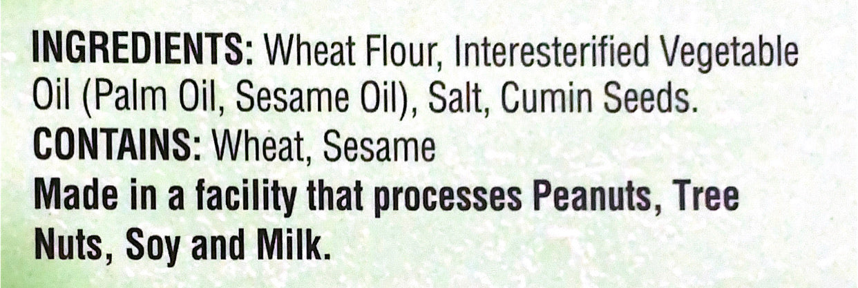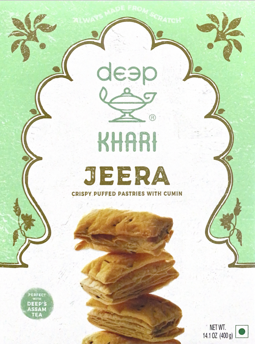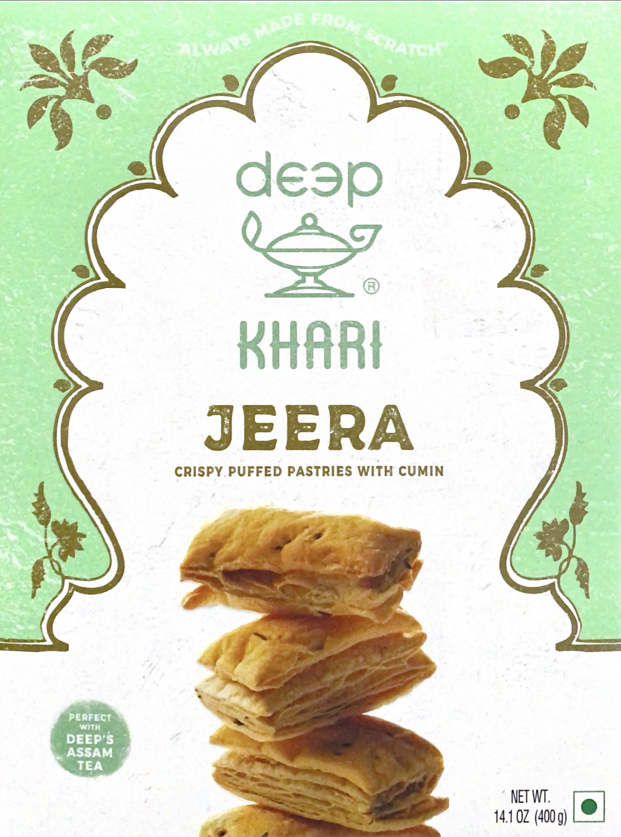 Crispy yet soft, these jeera puff pastries make tea time more enjoyable. Very popular in India, these large laired jeera biscuits are ideal for coffee/tea time. Made from whole wheat flour and spices. This product is the cumin flavour variety.
