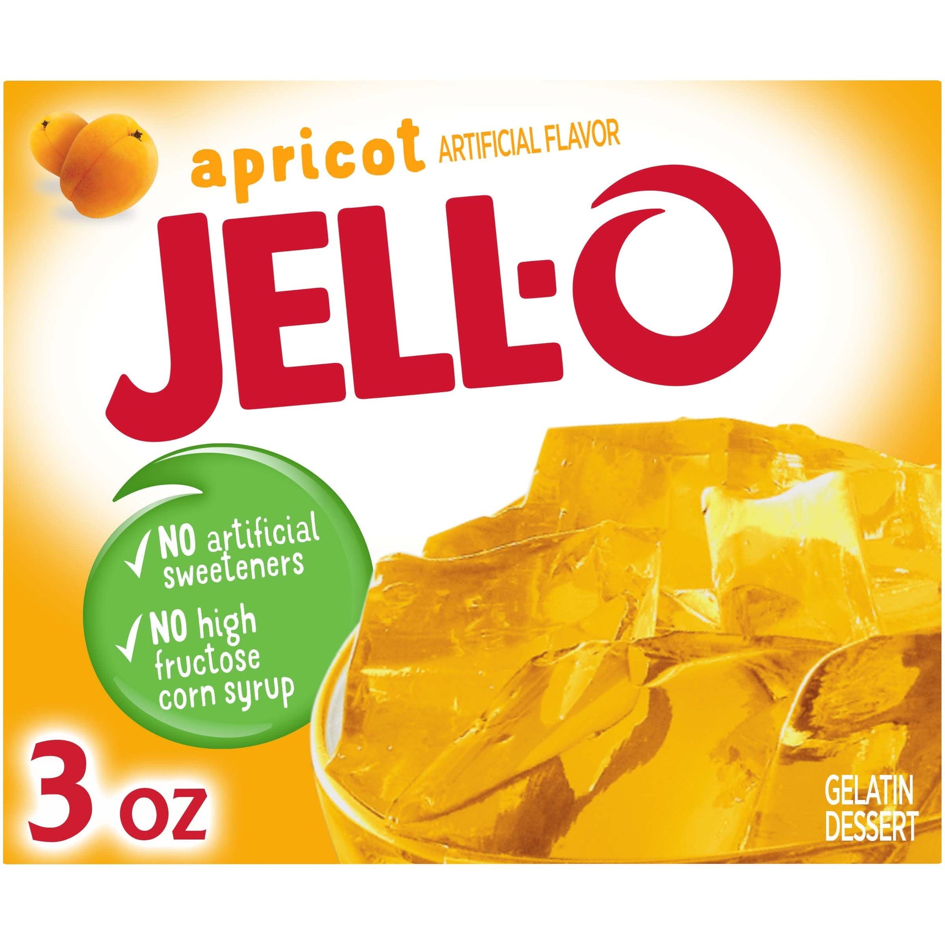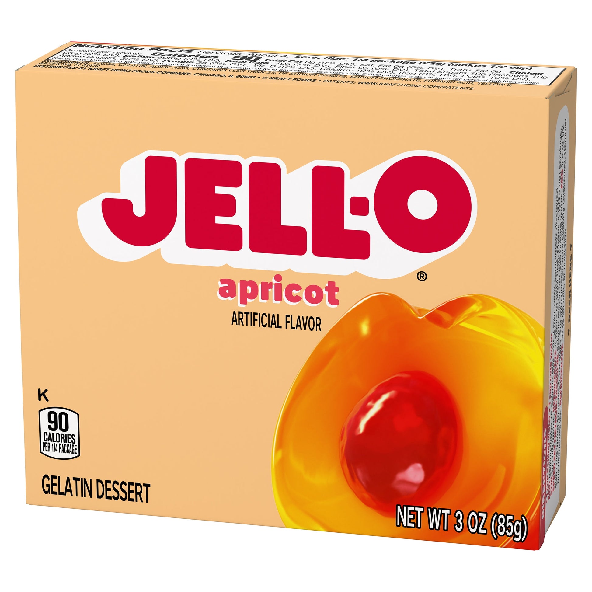 Snack happy. Jell-O Apricot Artificially Flavored Gelatin Dessert Mix lets you add some wonder to your day with a delicious snack. Spoon up a smile with our artificially flavored apricot Jell-O gelatin that contains 80 calories per serving. Our colorful, jiggly treat is perfect for everyday snacking or special occasions with family and friends. Additionally, our gelatin dessert mix is a versatile ingredient for creating desserts like poke cakes, parfaits, pretzel salads, rainbow layer cakes and more. Our artificially flavored apricot gelatin dessert is easy to prepare. Simply add 1 cup boiling water to the gelatin mix, stir for 2 minutes until completely dissolved, stir in 1 cup cold water, then refrigerate for 4 hours or until firm. Each Jell-O gelatin dessert mix is individually packaged in a 3-ounce sealed pouch and makes 4, 1/2-cup servings.