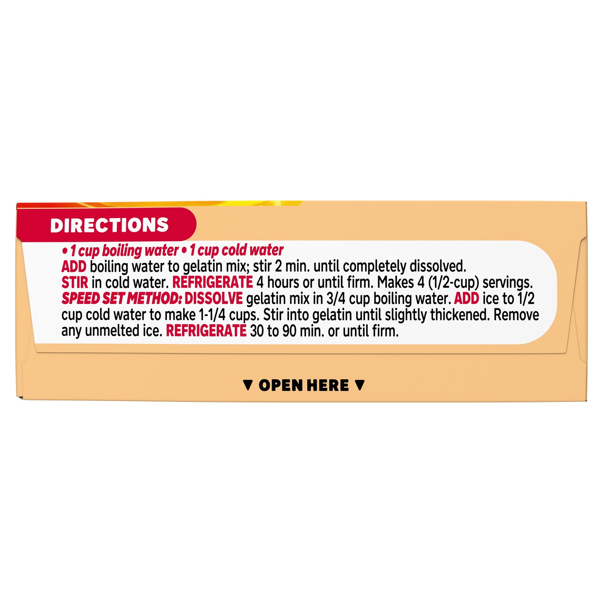 To prepare, add 1 cup boiling water to gelatin mix, stir 2 minutes until completely dissolved, stir in 1 cup cold water, then refrigerate 4 hours or until firm