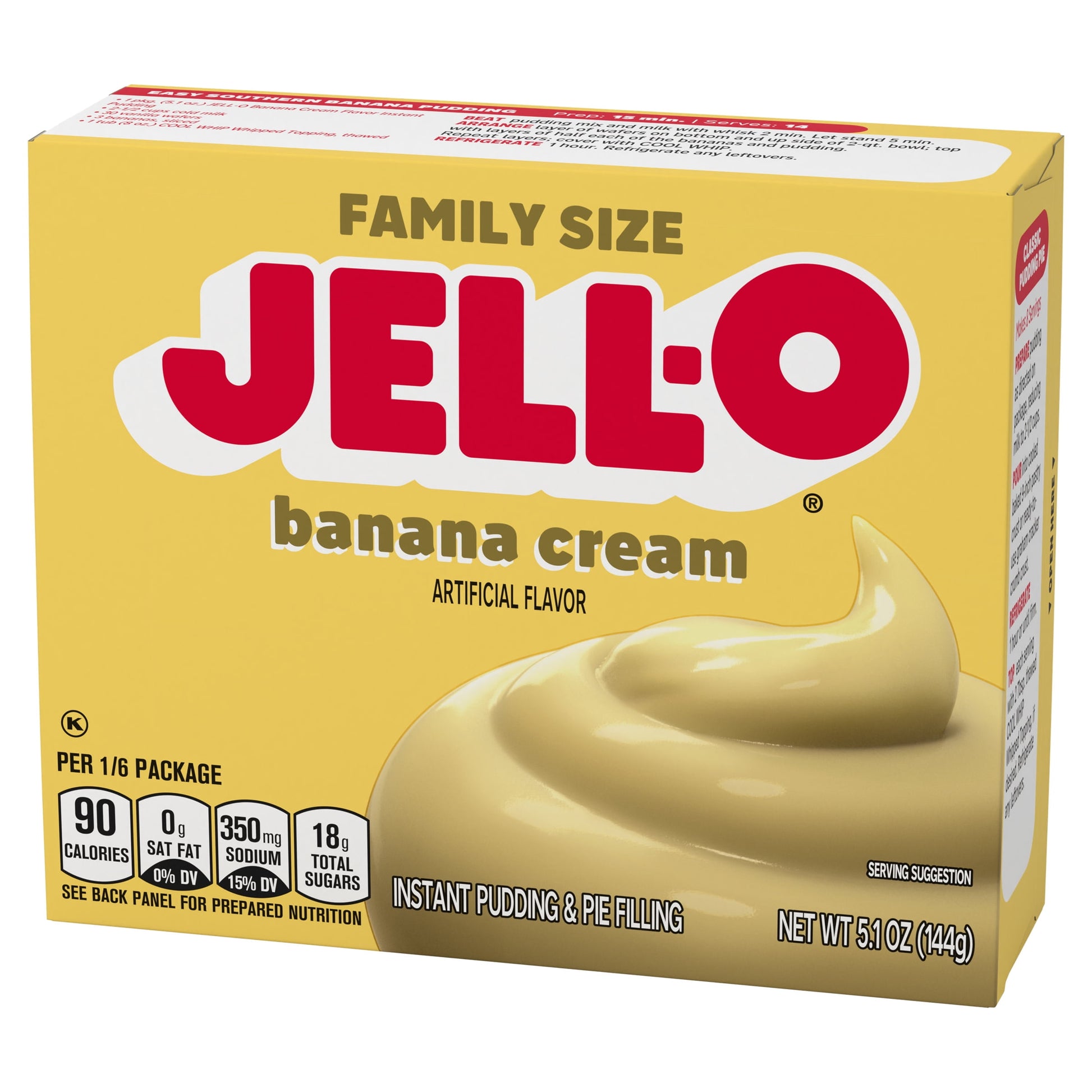 Snack happy. Jell-O Banana Cream Artificially Flavored Instant Pudding Mix & Pie Filling tastes delicious whether you enjoy it as a treat or use it as an ingredient in your favorite dessert recipes. Add some wonder to your day with a delicious artificially flavored banana cream dessert. Fun to make with your kids, our artificially flavored banana cream pudding mix can also be used to create a poke cake, tasty crepes or banana cream pie filling. Our artificially flavored banana cream pudding is ready in as little as five minutes. Simply stir milk into the pudding mix and allow to set. Every Jell-O pudding mix comes packaged in a 5.1-ounce sealed pouch. Stock up with our convenient family-size box. Pudding fun in every bite.