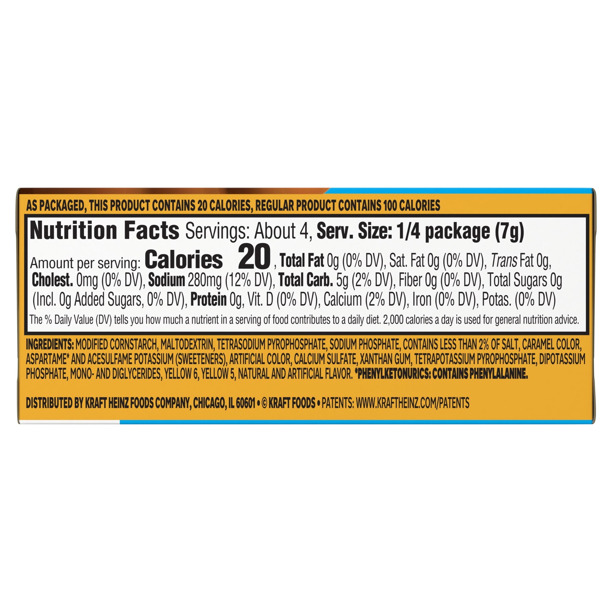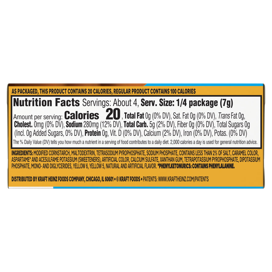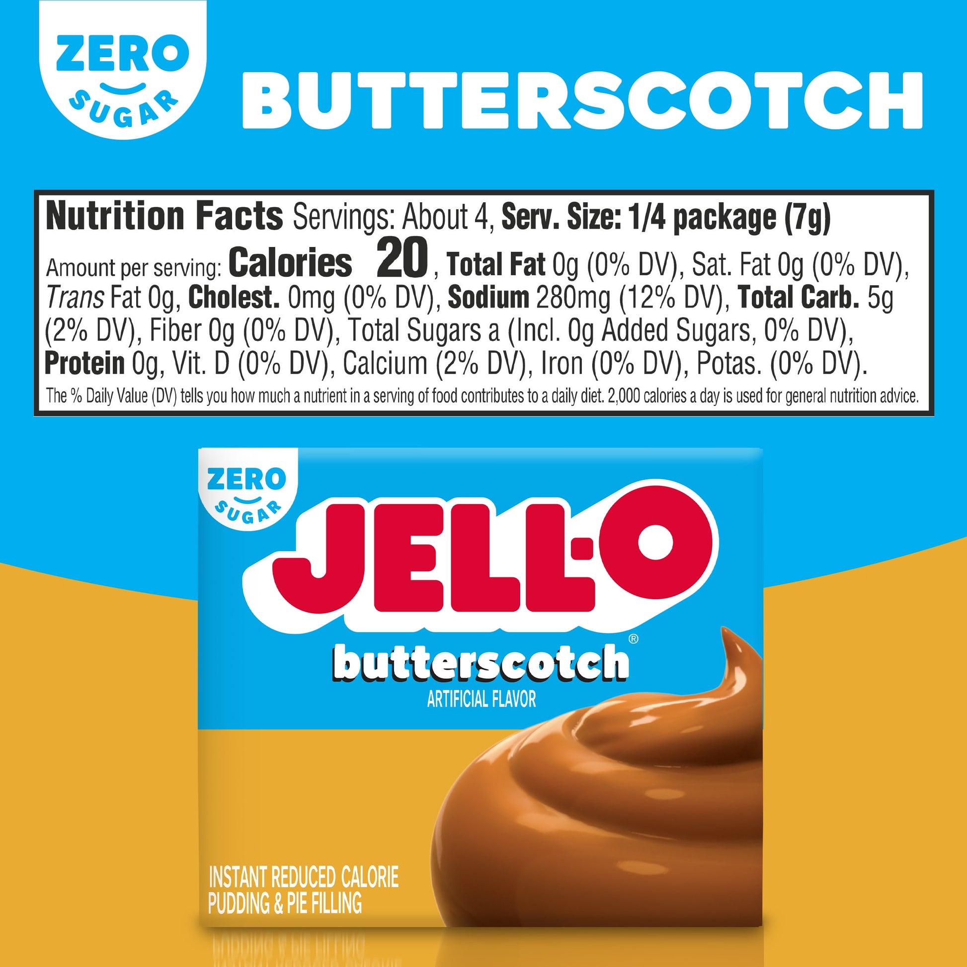Snack happy. Jell-O Zero Sugar Butterscotch Artificially Flavored Instant Reduced Calorie Pudding Mix & Pie Filling tastes delicious whether you enjoy it as a treat or use it as an ingredient in your favorite dessert recipes. Add some wonder to your day with a delicious snack. Fun to make with your kids, our zero sugar artificially flavored butterscotch pudding mix can also be used to create a poke cake, tasty crepes or butterscotch pie filling. You'll feel good about serving our zero sugar pudding mix that is 2/3 fewer calories than regular Jell-O instant chocolate pudding; as packaged, this product contains 20 calories, regular product contains 100 calories. Our zero sugar artificially flavored butterscotch pudding is ready in as little as five minutes. Simply stir milk into the pudding mix and allow to set. Every zero sugar Jell-O pudding mix comes packaged in a 1-ounce sealed pouch. Pudding fun in every bite.