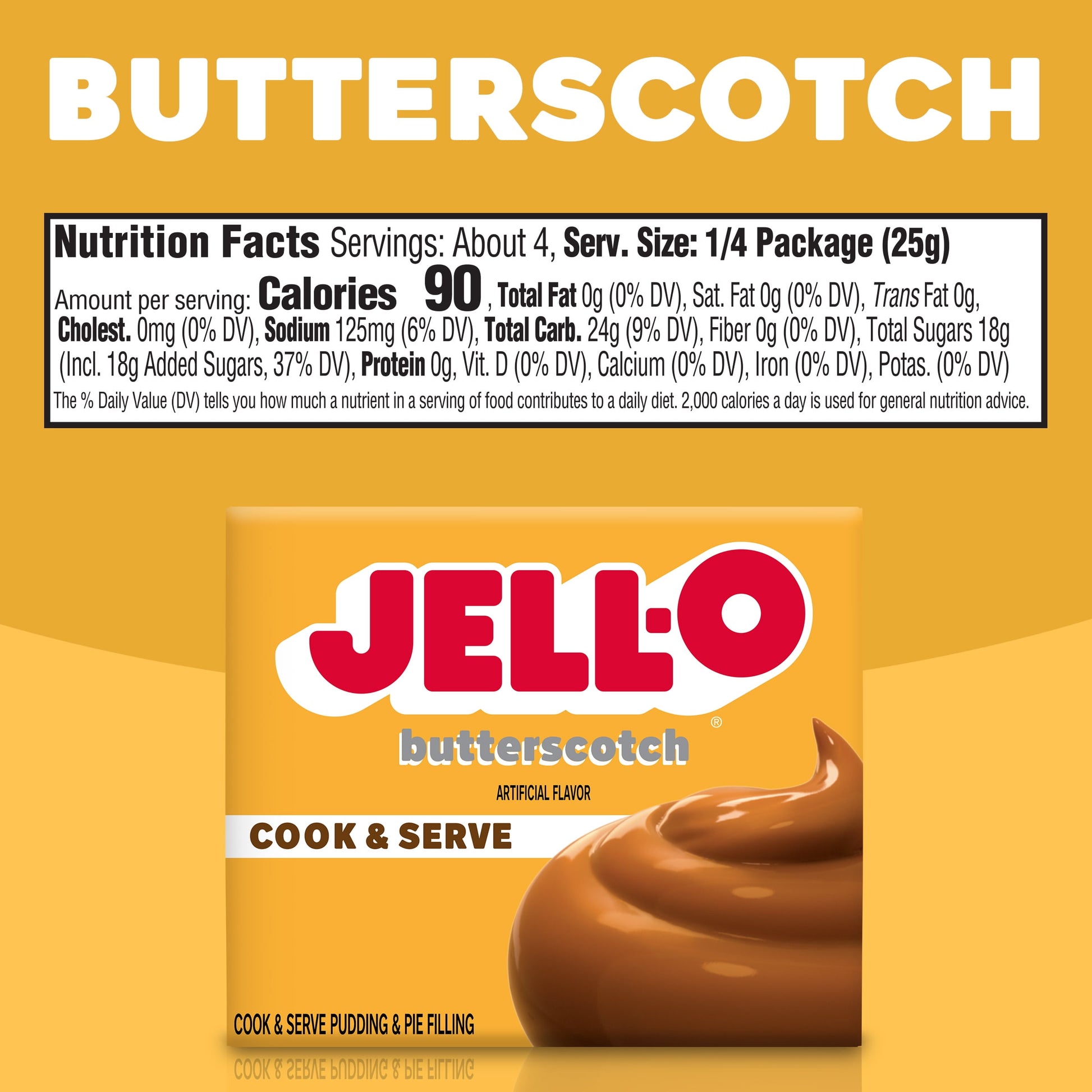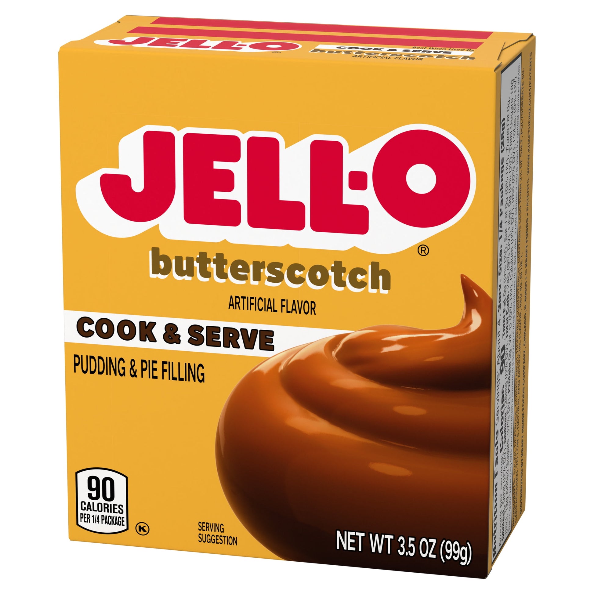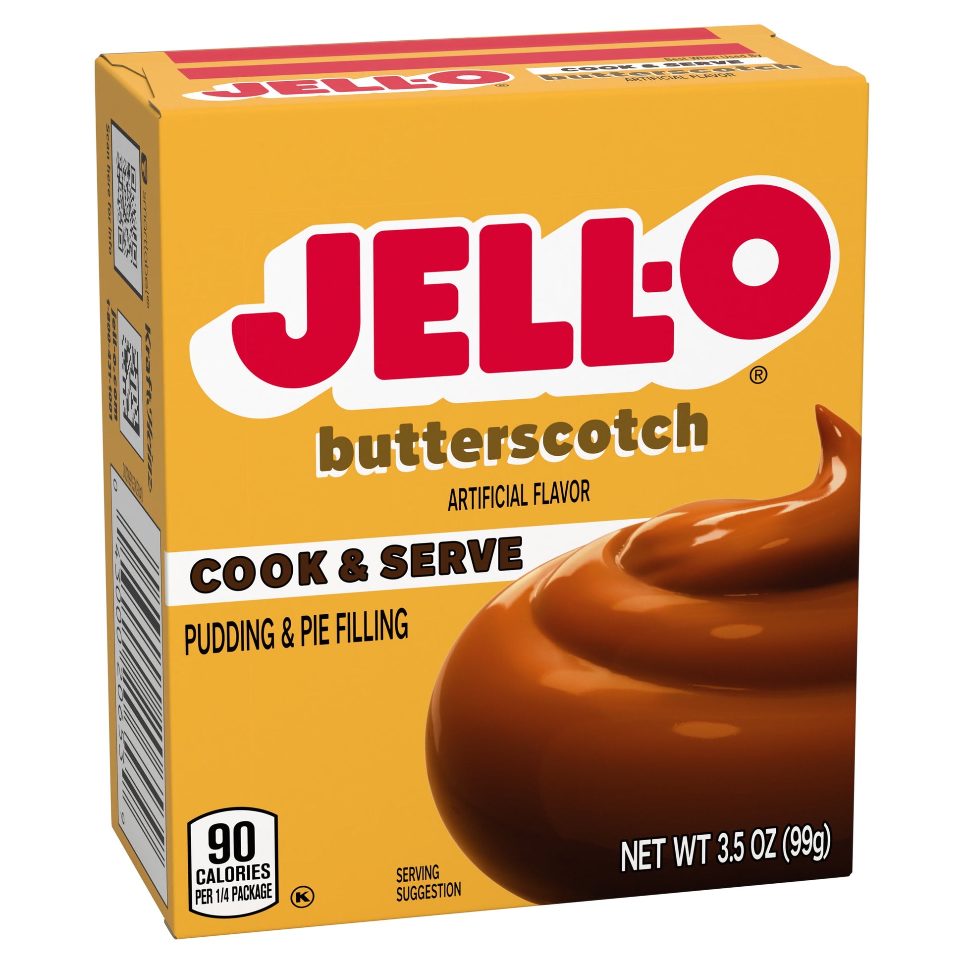 Snack happy. Jell-O Butterscotch Artificially Flavored Cook & Serve Pudding & Pie Filling Mix tastes great whether you enjoy it as a treat or use it as an ingredient in your favorite dessert recipes. Add some wonder to your day with a delicious snack. Fun to make with your kids, our artificially flavored butterscotch pudding mix can also be used to create a poke cake, tasty crepes or butterscotch pie filling. To prepare, stir mix into 2 cups cold milk in medium saucepan, bring to a boil on medium heat while stirring constantly, then serve warm or chilled. Every Jell-O pudding mix comes packaged in a 3.5-ounce sealed pouch. Pudding fun in every bite.