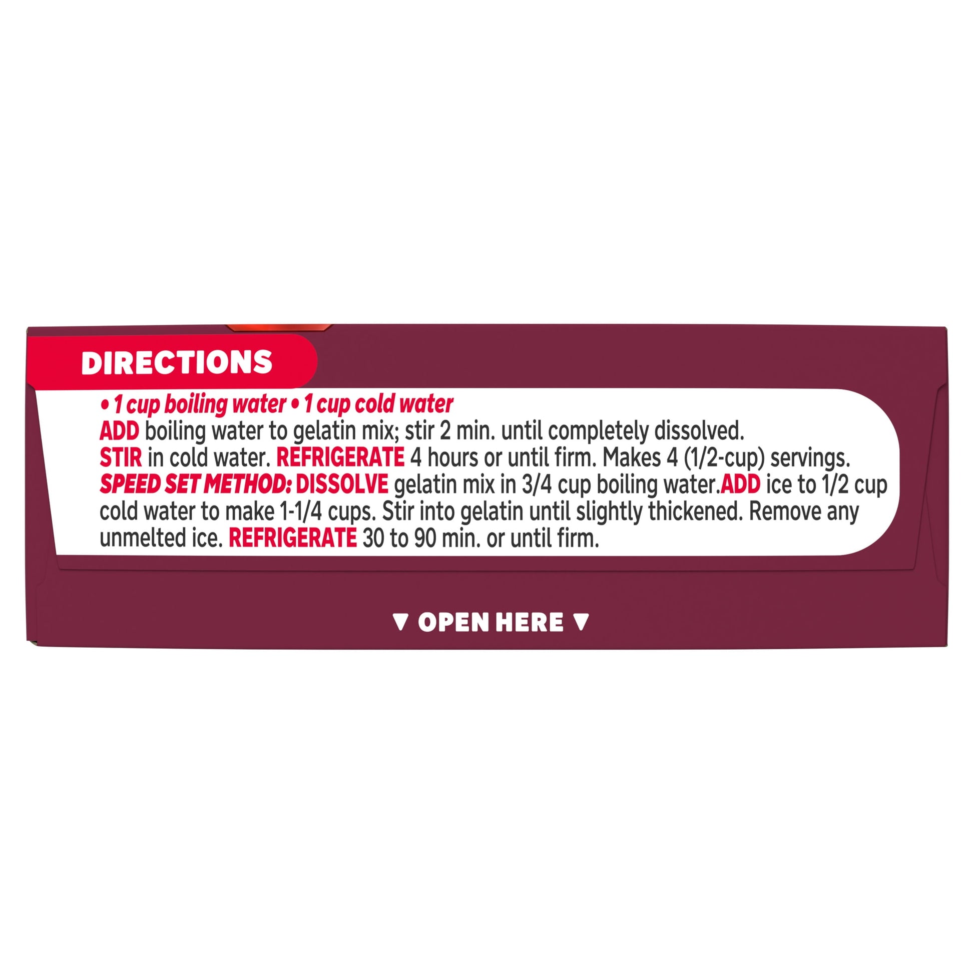 To prepare, add 1 cup boiling water to gelatin mix, stir 2 minutes until completely dissolved, stir in 1 cup cold water, then refrigerate 4 hours or until firm