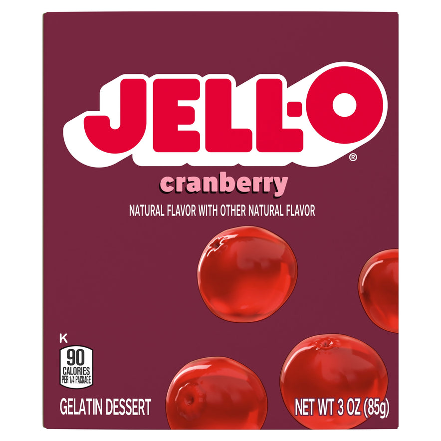 Snack happy. Jell-O Cranberry Artificially Flavored Gelatin Dessert Mix lets you add some wonder to your day with a delicious snack. Spoon up a smile with our artificially flavored cranberry Jell-O gelatin that contains 80 calories per serving. Our colorful, jiggly treat is perfect for everyday snacking or special occasions with family and friends. Additionally, our gelatin dessert mix is a versatile ingredient for creating desserts like poke cakes, parfaits, pretzel salads, rainbow layer cakes and more. Our artificially flavored cranberry gelatin dessert is easy to prepare. Simply add 1 cup boiling water to the gelatin mix, stir for 2 minutes until completely dissolved, stir in 1 cup cold water, then refrigerate for 4 hours or until firm. Each Jell-O gelatin dessert mix is individually packaged in a 3-ounce sealed pouch and makes 4, 1/2-cup servings.