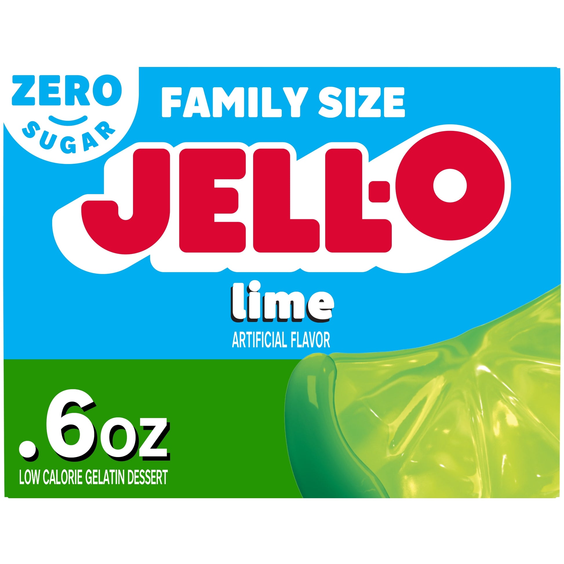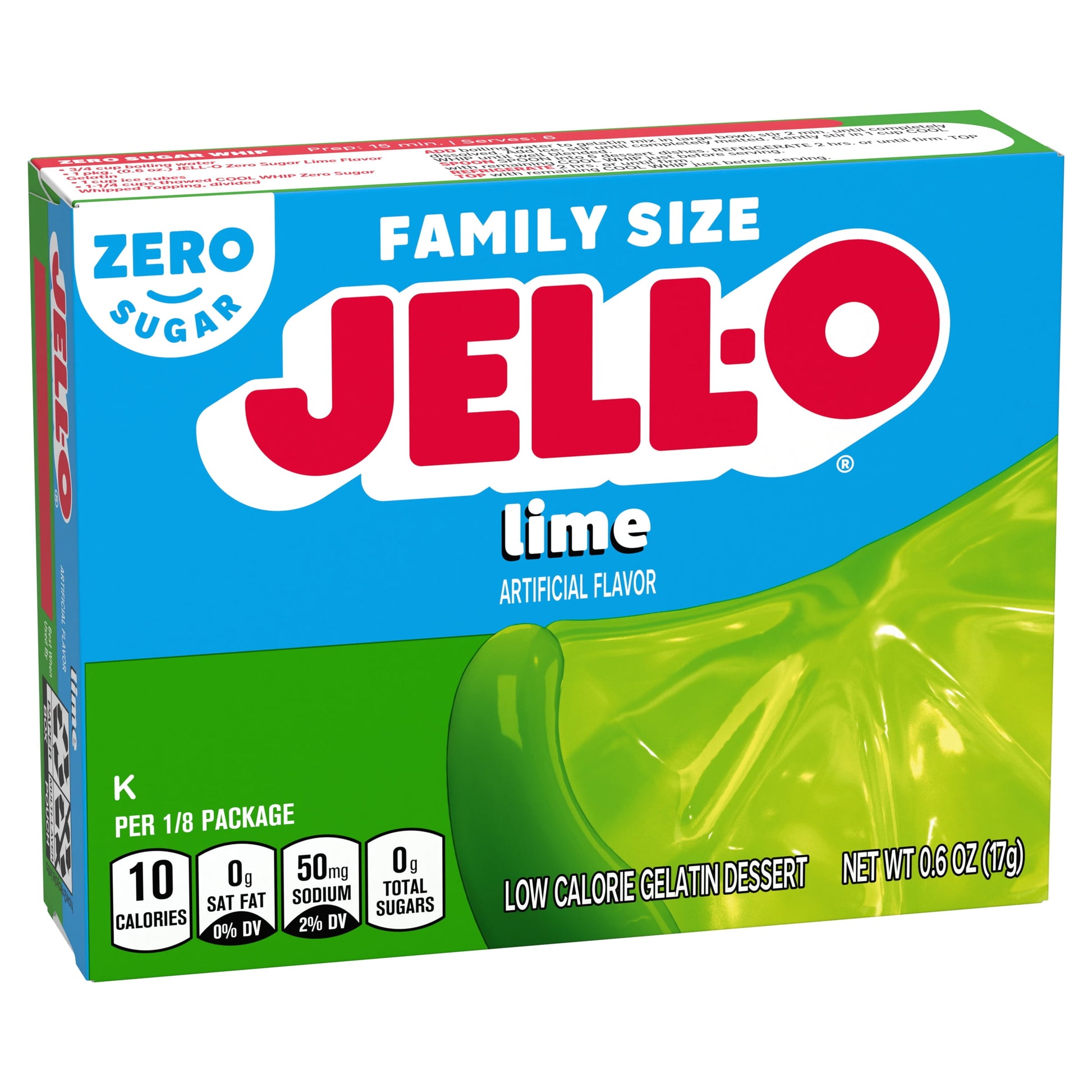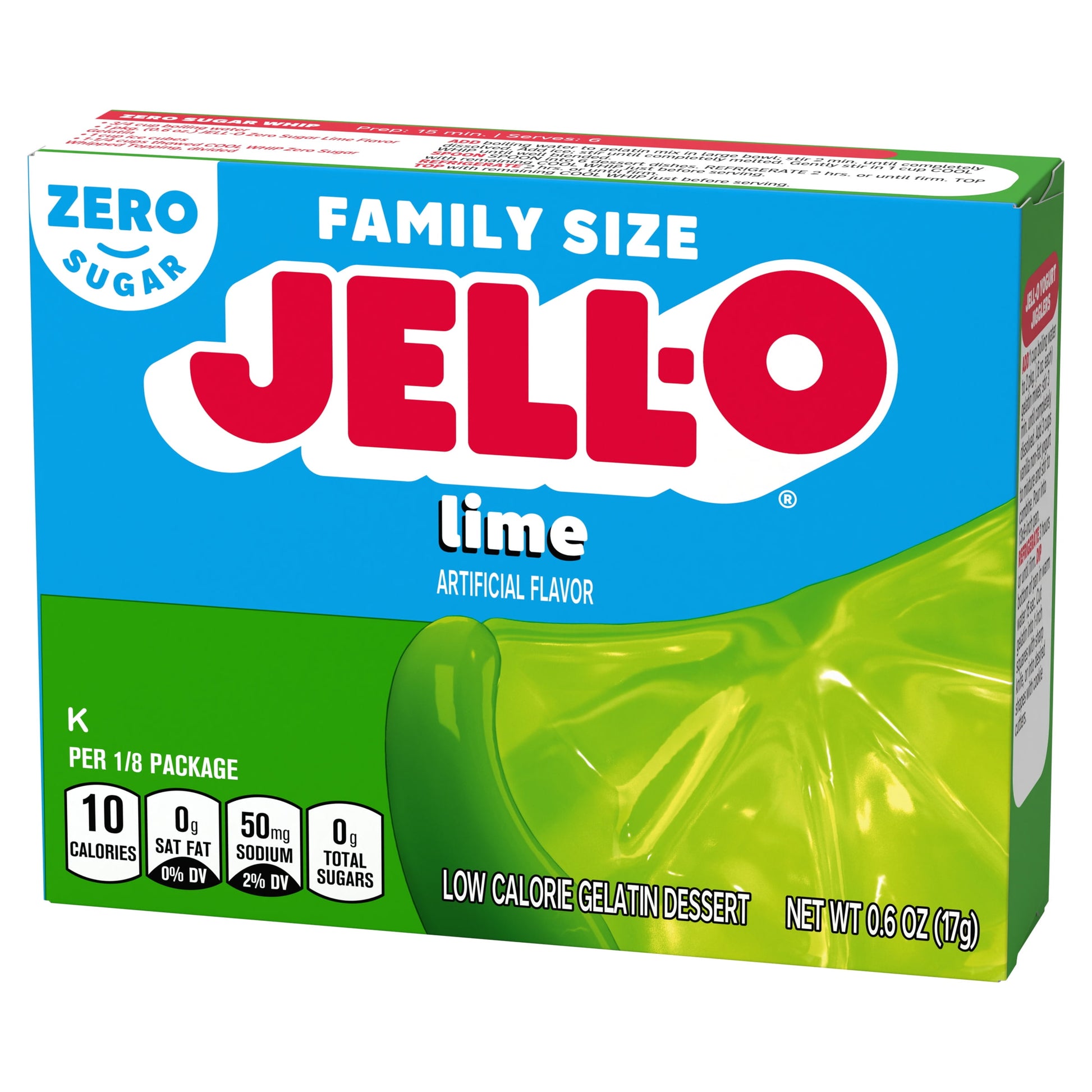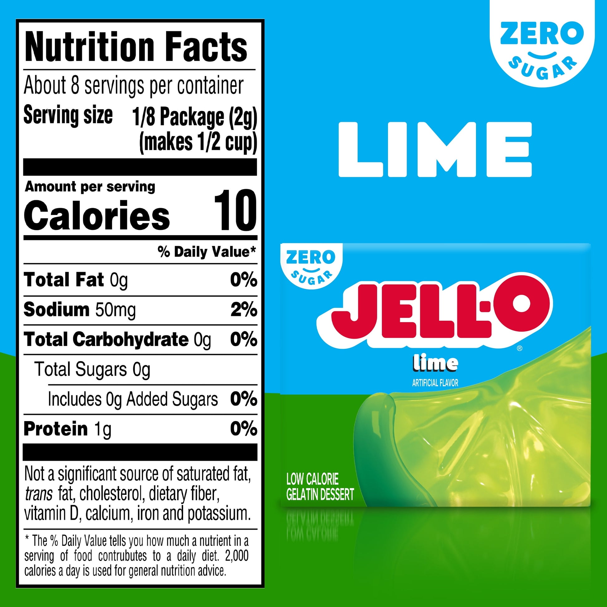 Snack happy. Jell-O Lime Artificially Flavored Zero Sugar Low Calorie Gelatin Dessert Mix lets you add some wonder to your day with a fun snack. Spoon up a smile with our zero sugar artificially flavored lime Jell-O gelatin that is delicious and contains 10 calories per serving. Our colorful, jiggly treat is perfect for everyday snacking or special occasions with family and friends. Additionally, our gelatin dessert mix is a versatile ingredient for creating delicious desserts like poke cakes, parfaits, pretzel salads, rainbow layer cakes and more. Our artificially flavored lime gelatin dessert is easy to prepare. Simply add 2 cups boiling water to the gelatin mix, stir for 2 minutes until completely dissolved, stir in 2 cups cold water, then refrigerate for 4 hours or until firm. Each family size Jell-O zero sugar gelatin dessert mix is individually packaged in a 0.6-ounce sealed pouch and makes 8, 1/2-cup servings.