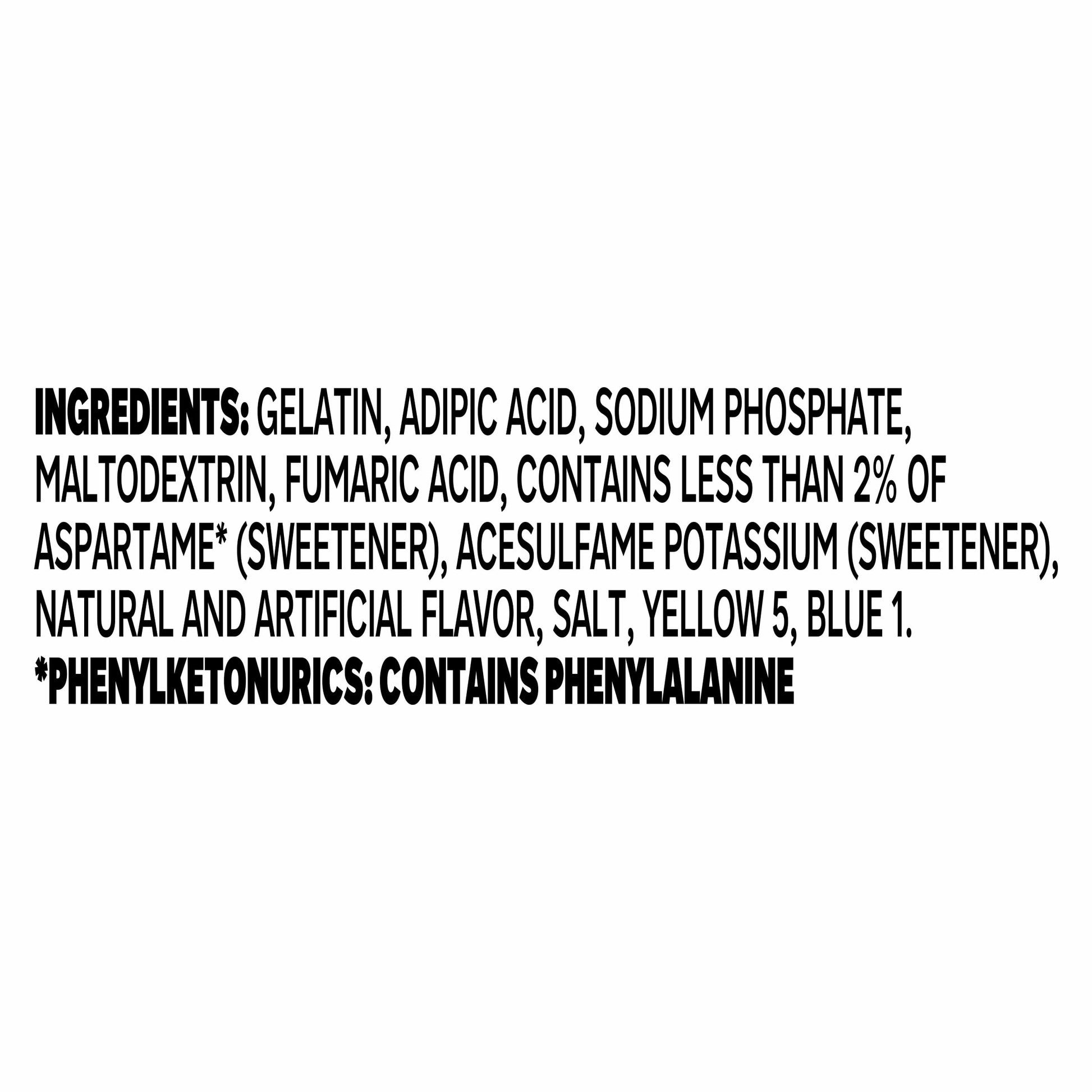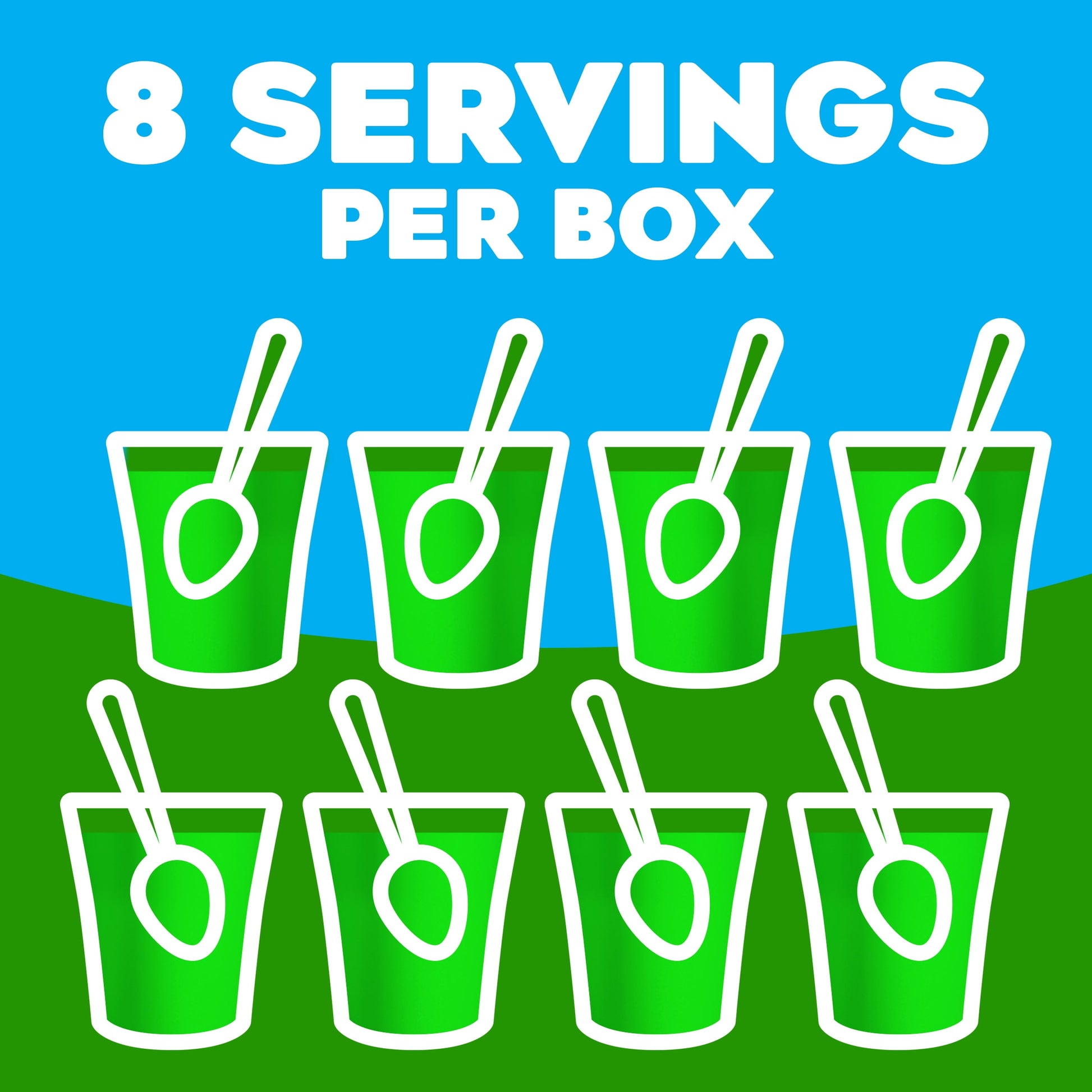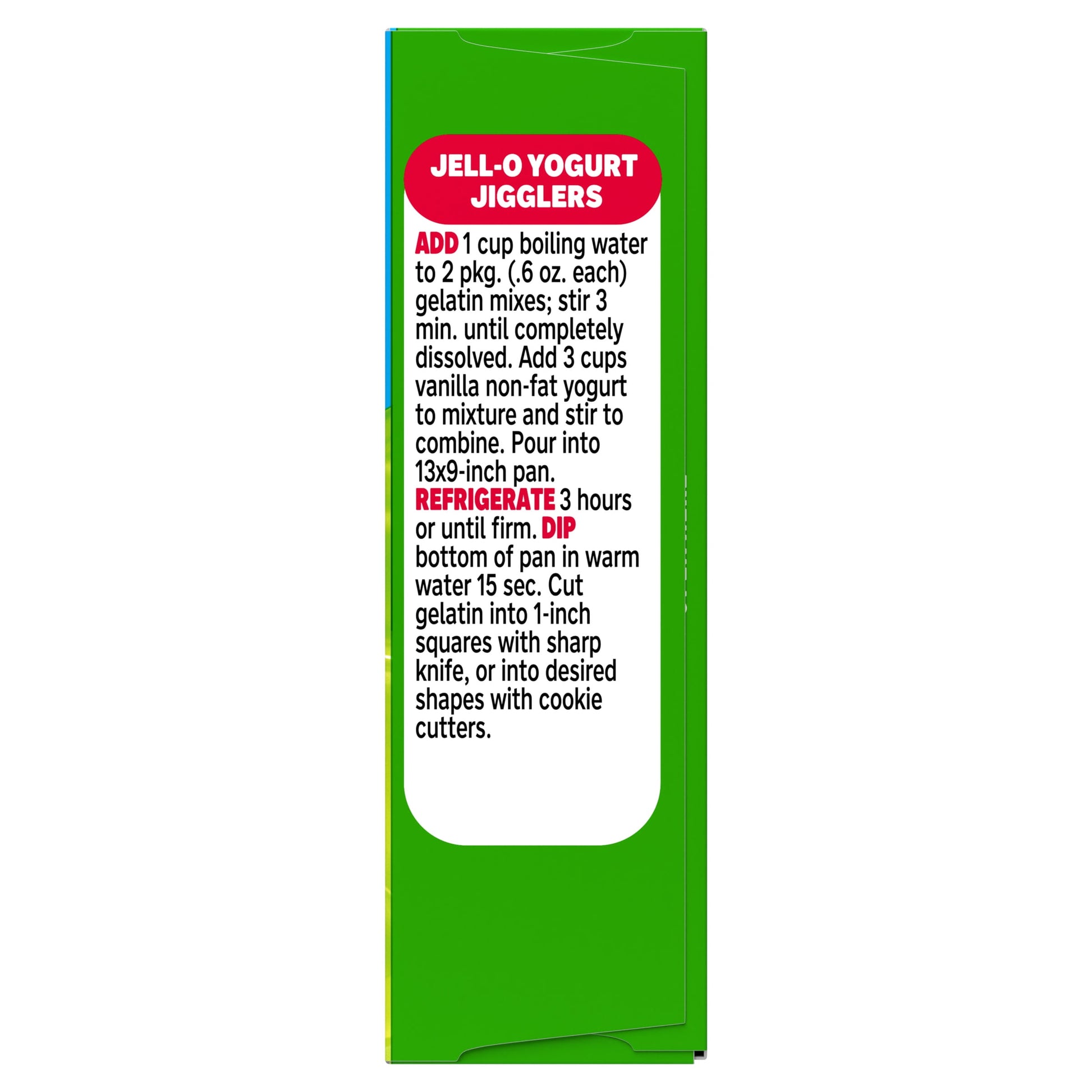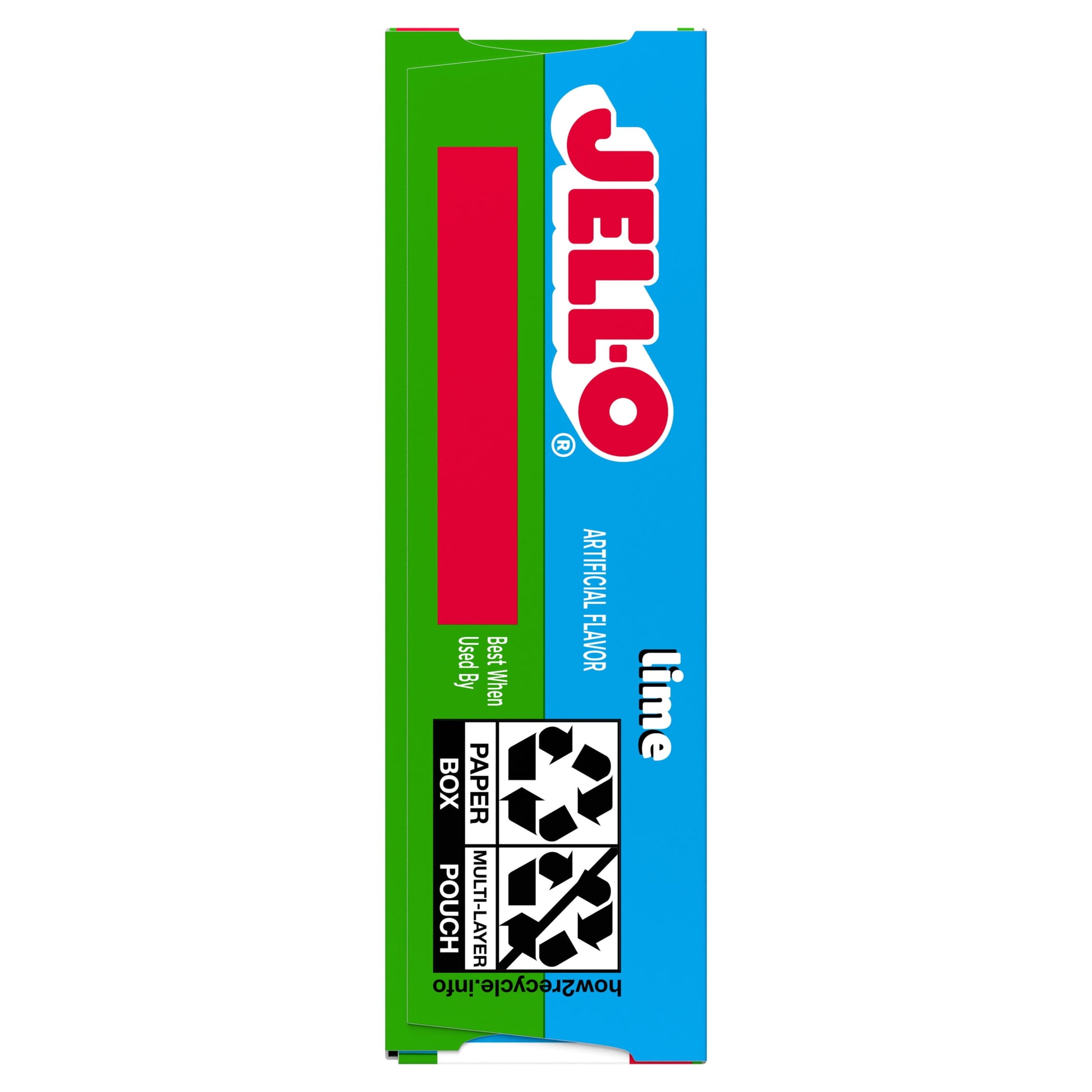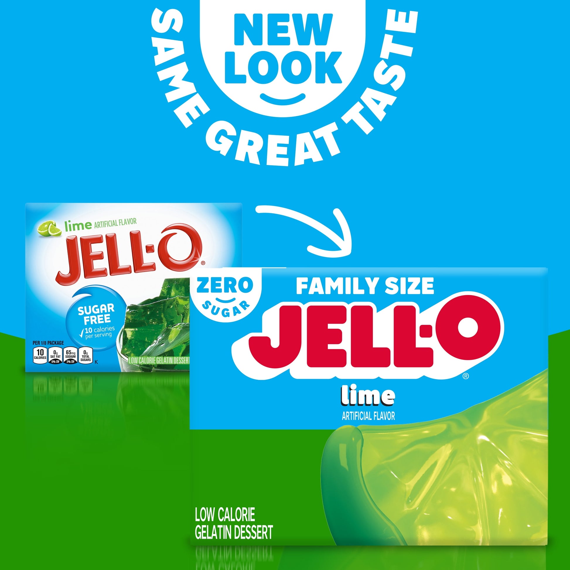 Snack happy. Jell-O Lime Artificially Flavored Zero Sugar Low Calorie Gelatin Dessert Mix lets you add some wonder to your day with a fun snack. Spoon up a smile with our zero sugar artificially flavored lime Jell-O gelatin that is delicious and contains 10 calories per serving. Our colorful, jiggly treat is perfect for everyday snacking or special occasions with family and friends. Additionally, our gelatin dessert mix is a versatile ingredient for creating delicious desserts like poke cakes, parfaits, pretzel salads, rainbow layer cakes and more. Our artificially flavored lime gelatin dessert is easy to prepare. Simply add 2 cups boiling water to the gelatin mix, stir for 2 minutes until completely dissolved, stir in 2 cups cold water, then refrigerate for 4 hours or until firm. Each family size Jell-O zero sugar gelatin dessert mix is individually packaged in a 0.6-ounce sealed pouch and makes 8, 1/2-cup servings.