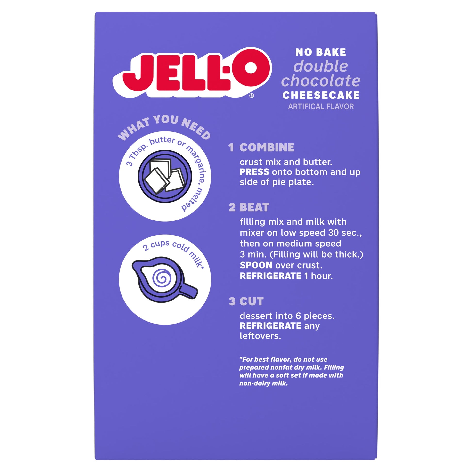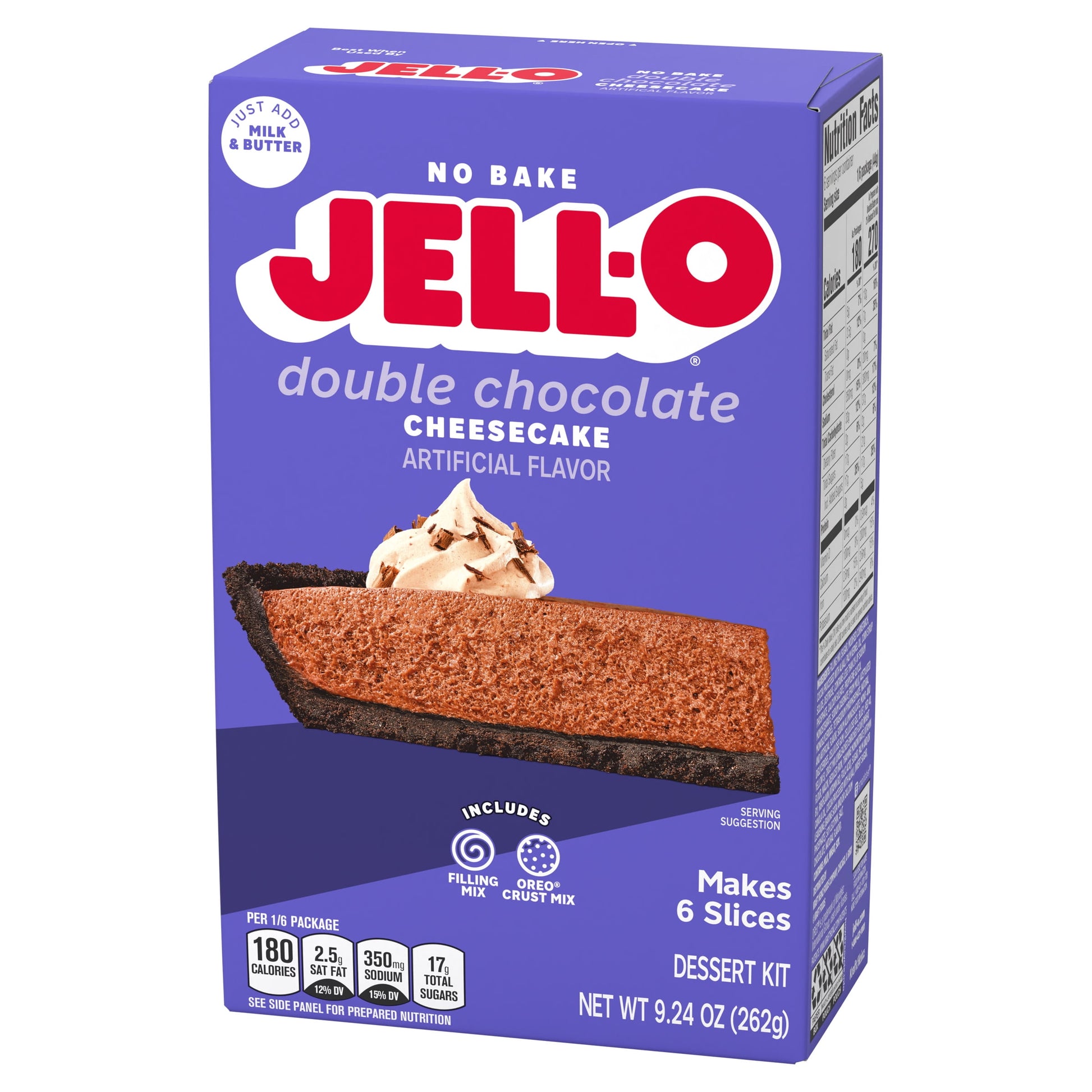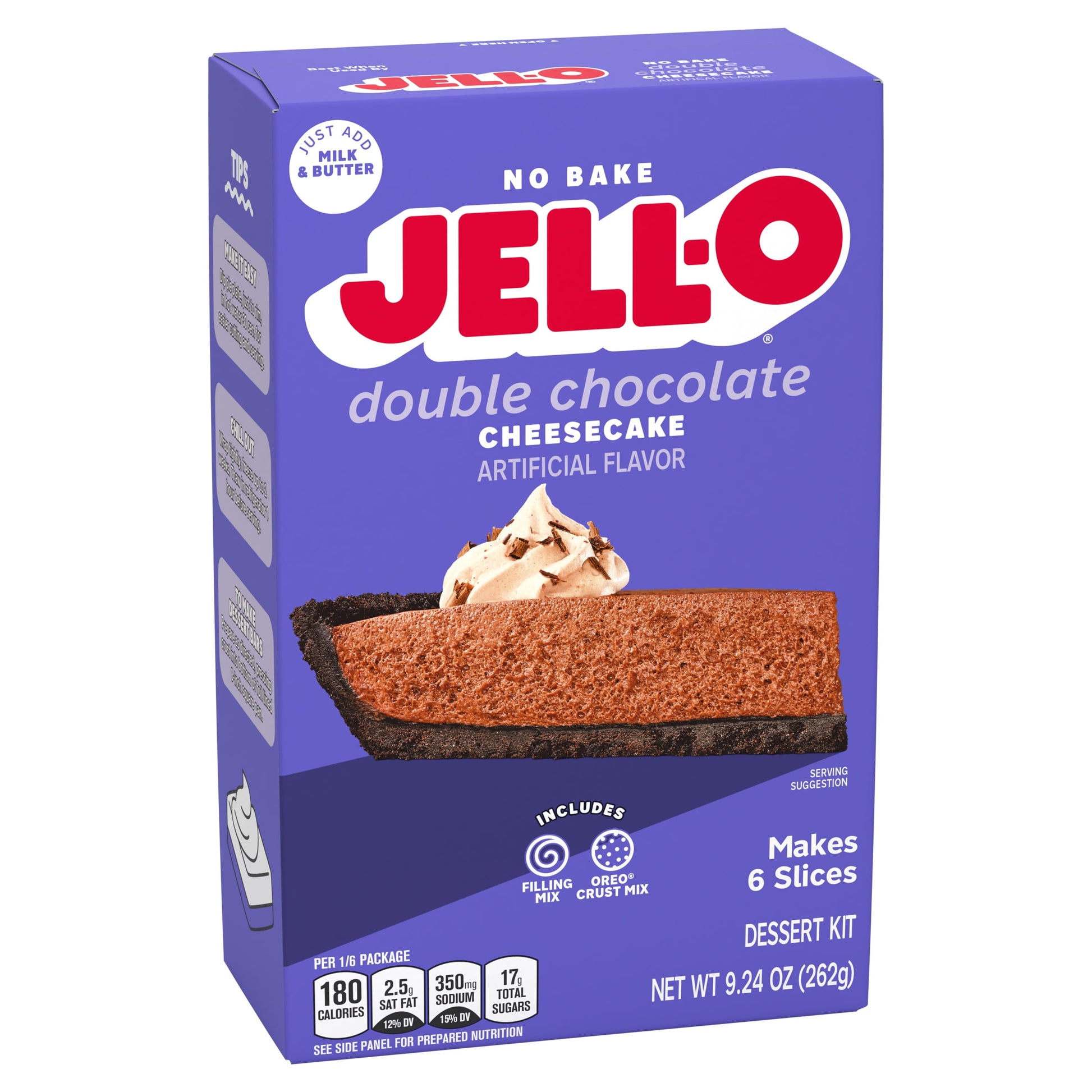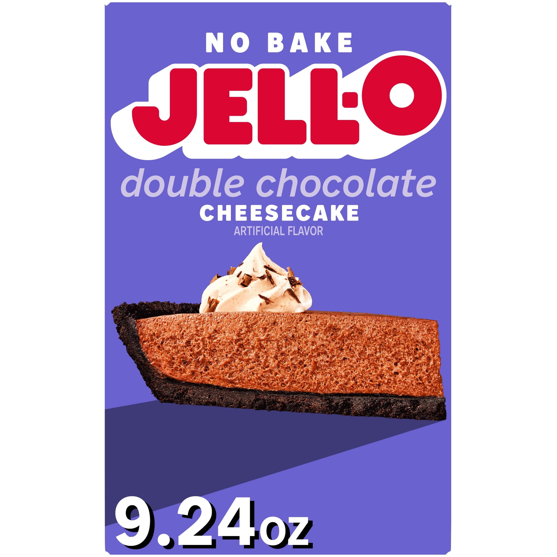 Take a break from your oven with a delightful cheesecake that's ready in 15 minutes with no baking required. Our Jell-O No Bake Double Chocolate Cheesecake Artificially Flavored Dessert Kit offers the rich and creamy flavor of chocolate cheesecake without the need for an oven. Each box contains filling mix and crust mix. Simply add milk and butter for a chocolate cheesecake with a rich, velvety texture. Since our chocolate dessert mix requires minimal prep time, you'll spend less time in the kitchen and more time with your family or guests. Our creamy, no-bake cheesecake is perfect for holiday gatherings, parties, picnics or any time you want to prepare a decadent dessert quickly. Each 9.24-ounce box makes six servings, perfect for your entire family to enjoy. You can also use our kit to make dessert bars by preparing as directed and using an 8-inch square pan. Enjoy a slice of your favorite dessert anytime with our no-bake cheesecake mix.