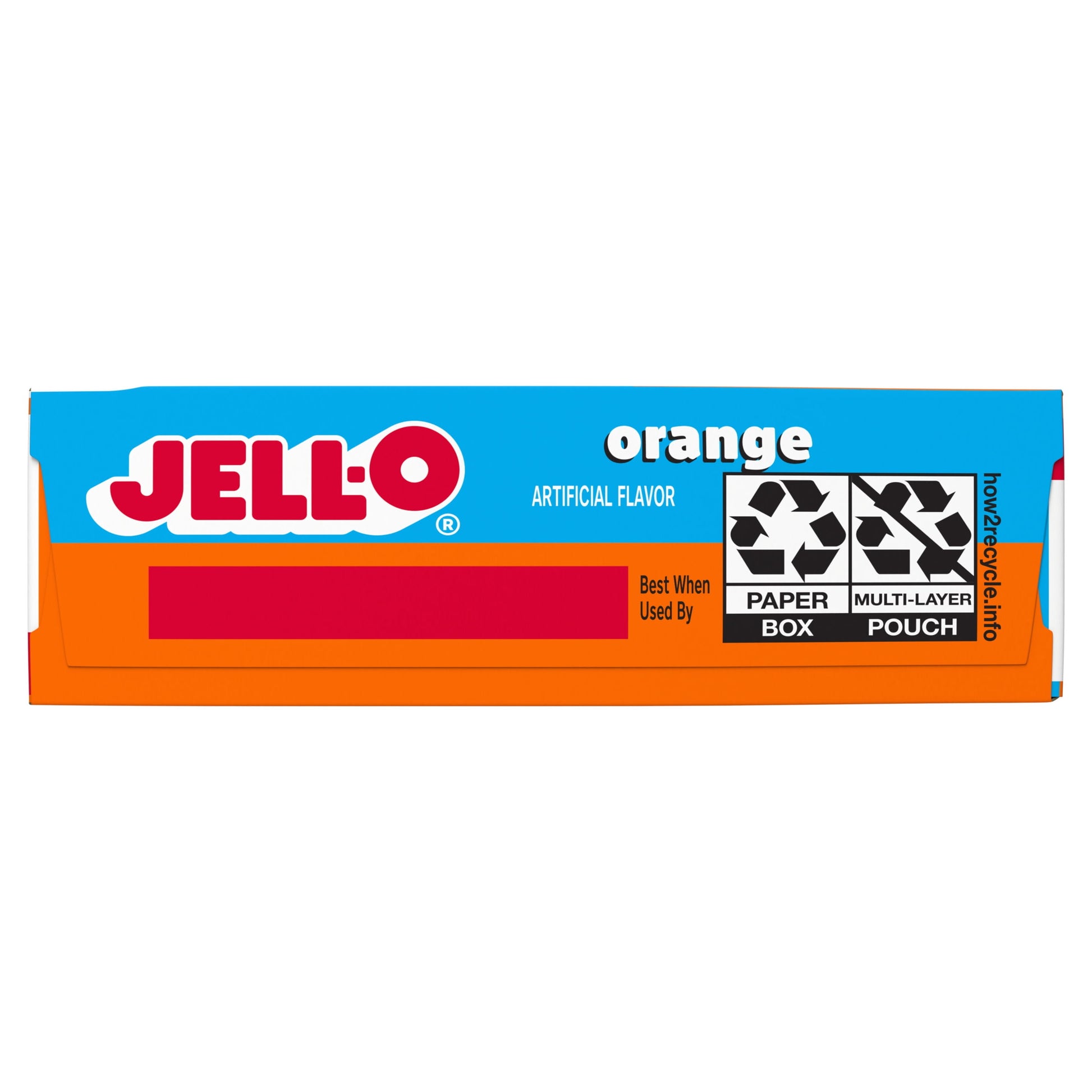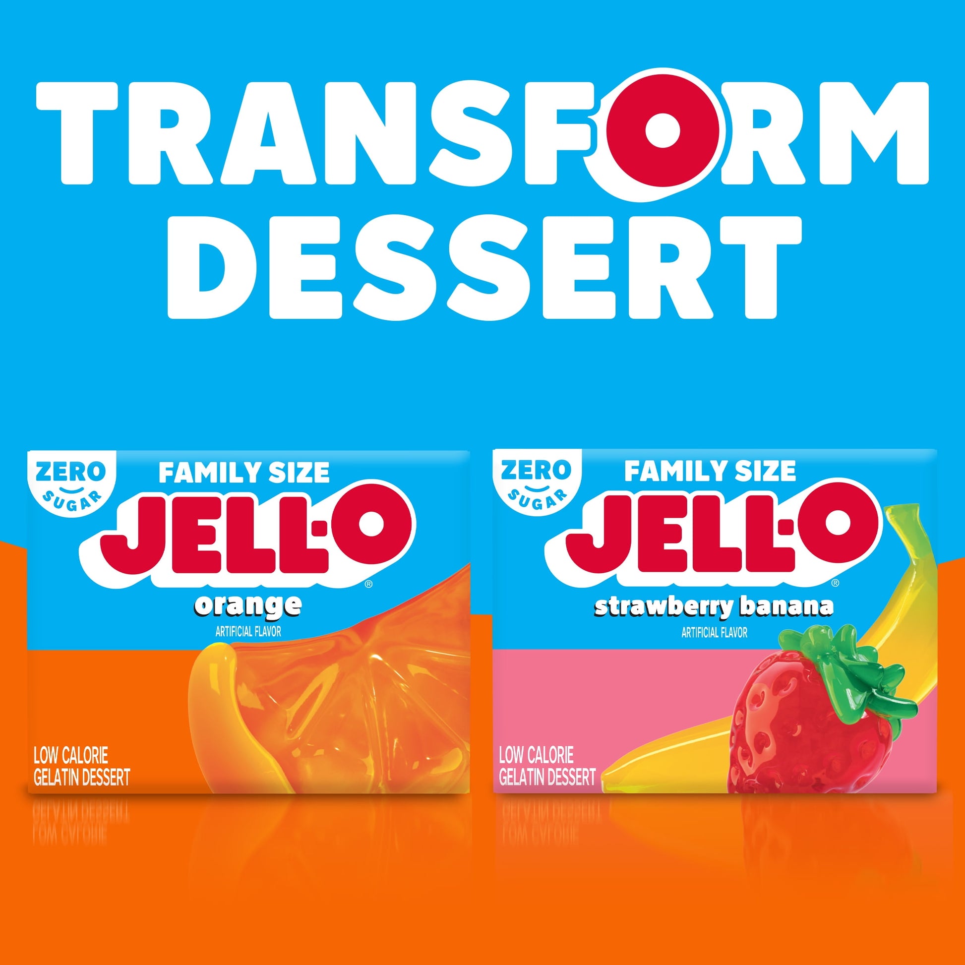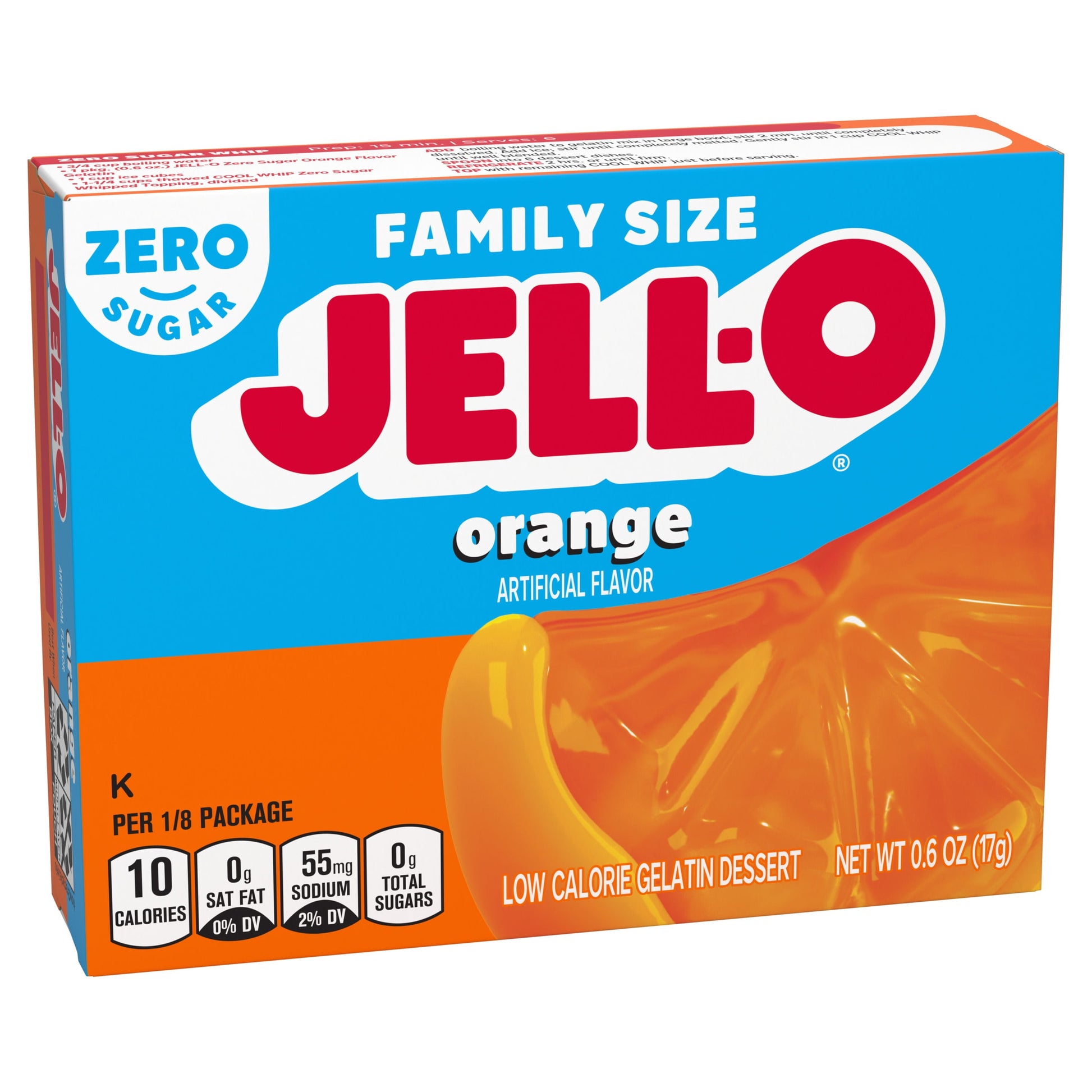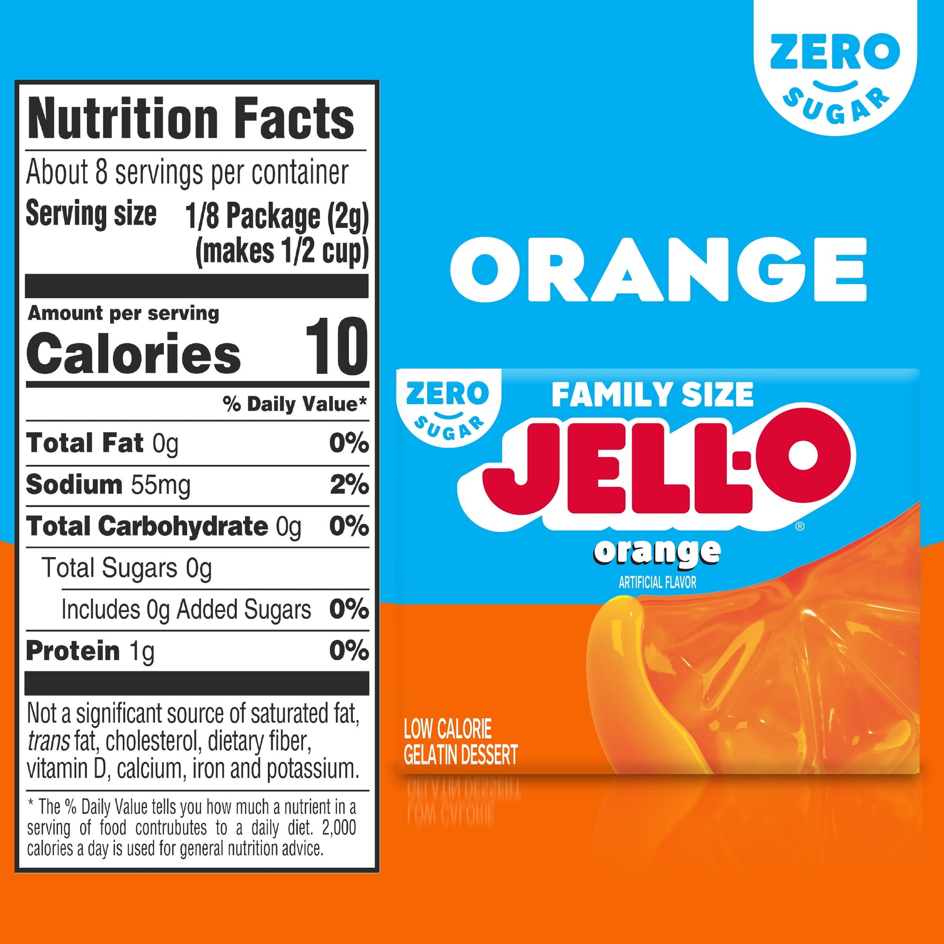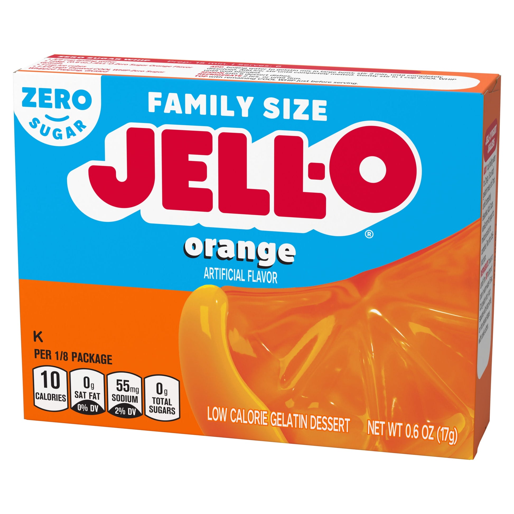 Snack happy. Jell-O Orange Artificially Flavored Zero Sugar Low Calorie Gelatin Dessert Mix lets you add some wonder to your day with a fun snack. Spoon up a smile with our zero sugar artificially flavored orange Jell-O gelatin that is delicious and contains 10 calories per serving. Our colorful, jiggly treat is perfect for everyday snacking or special occasions with family and friends. Additionally, our gelatin dessert mix is a versatile ingredient for creating delicious desserts like poke cakes, parfaits, pretzel salads, rainbow layer cakes and more. Our artificially flavored orange gelatin dessert is easy to prepare. Simply add 2 cups boiling water to the gelatin mix, stir for 2 minutes until completely dissolved, stir in 2 cups cold water, then refrigerate for 4 hours or until firm. Each family size Jell-O zero sugar gelatin dessert mix is individually packaged in a 0.6-ounce sealed pouch and makes 8, 1/2-cup servings.