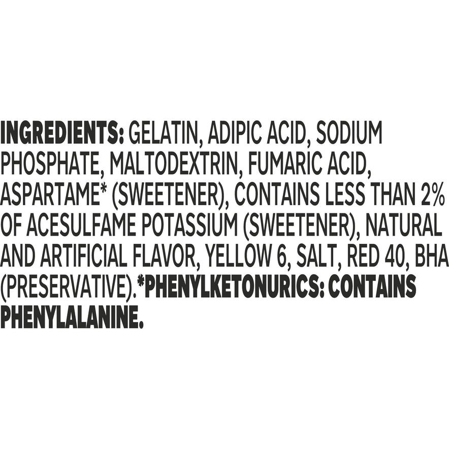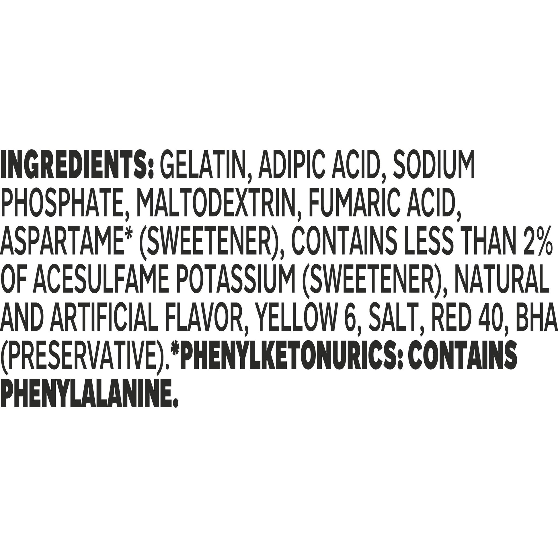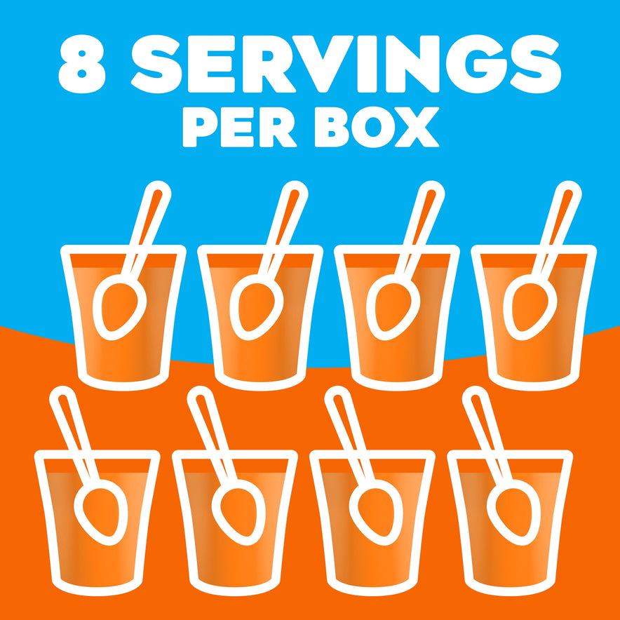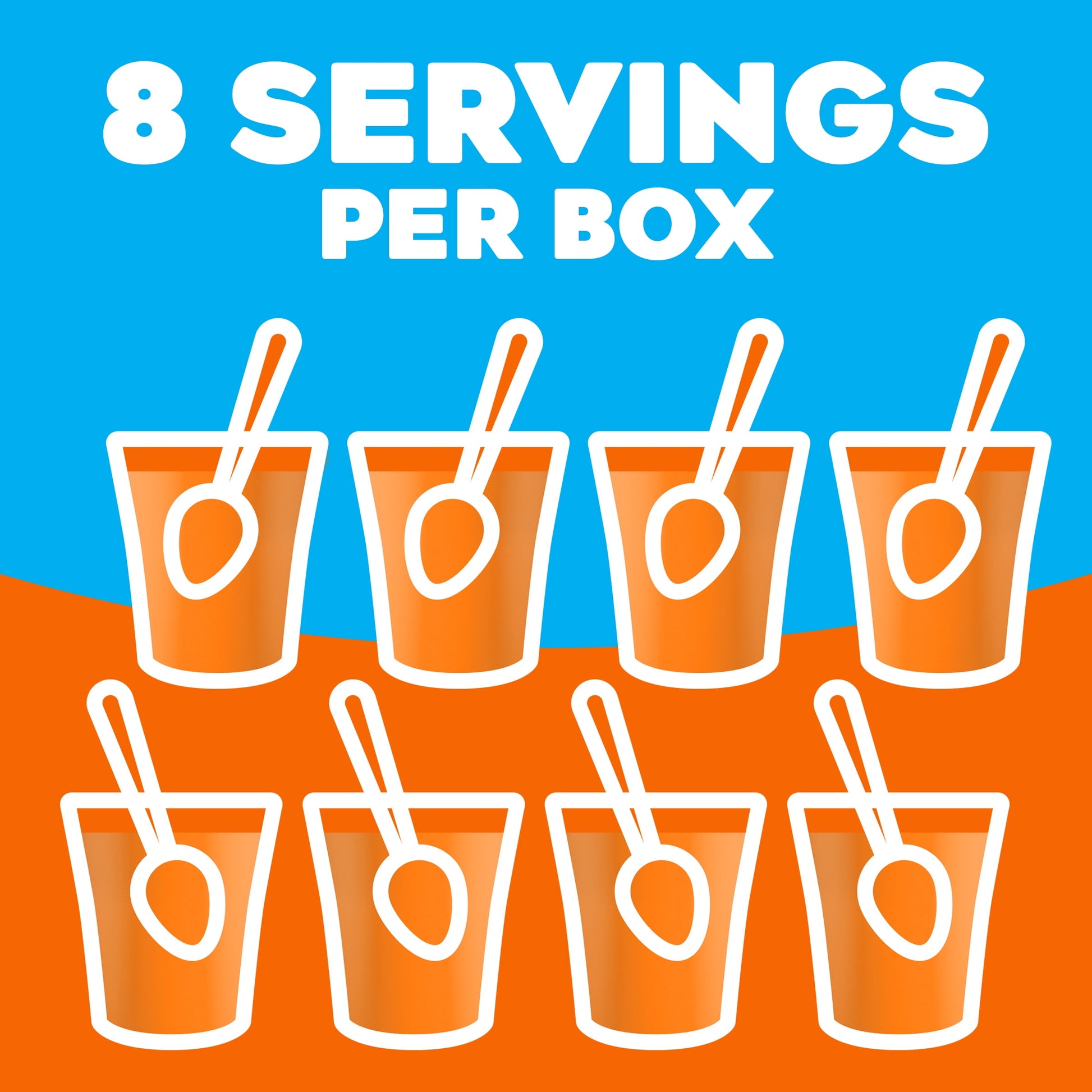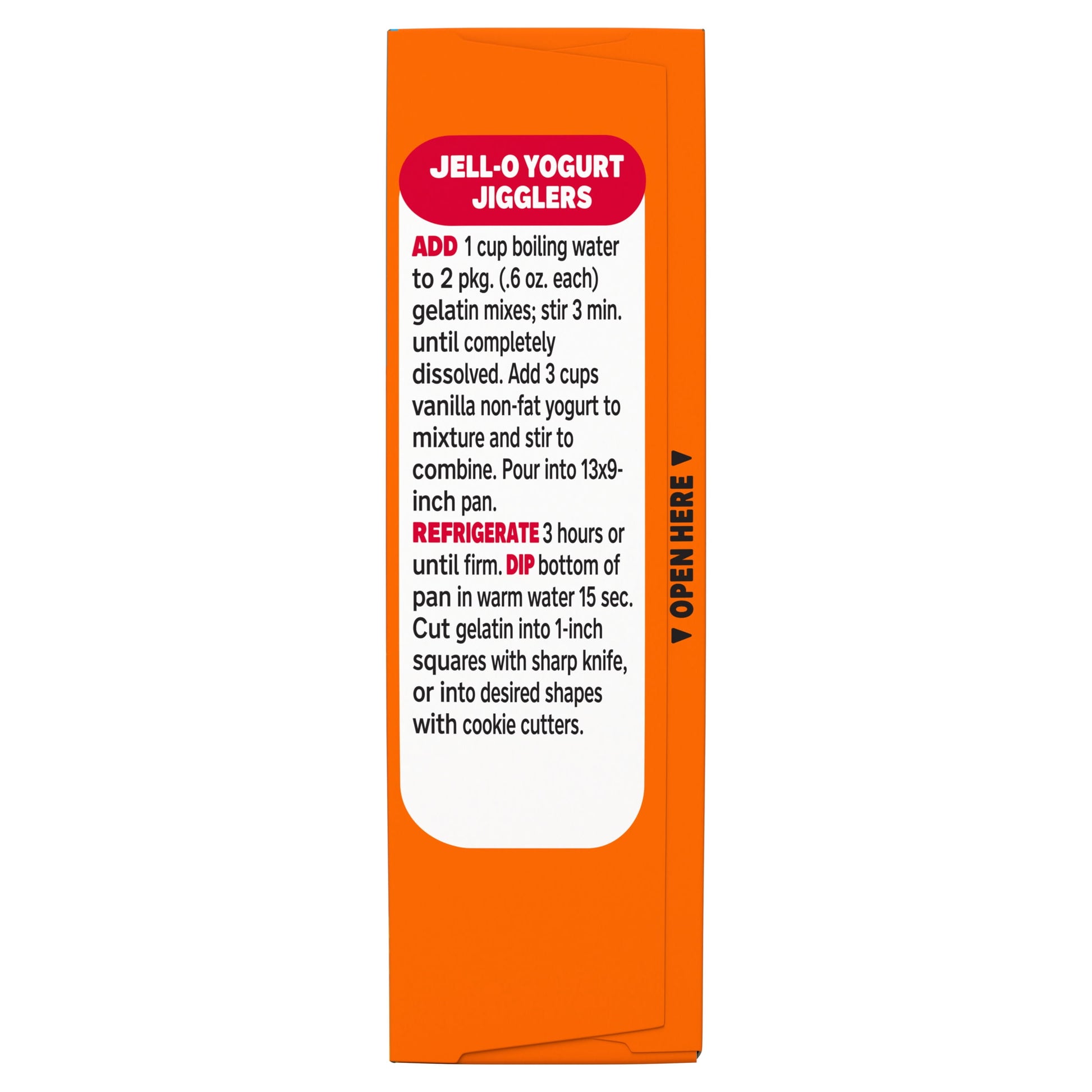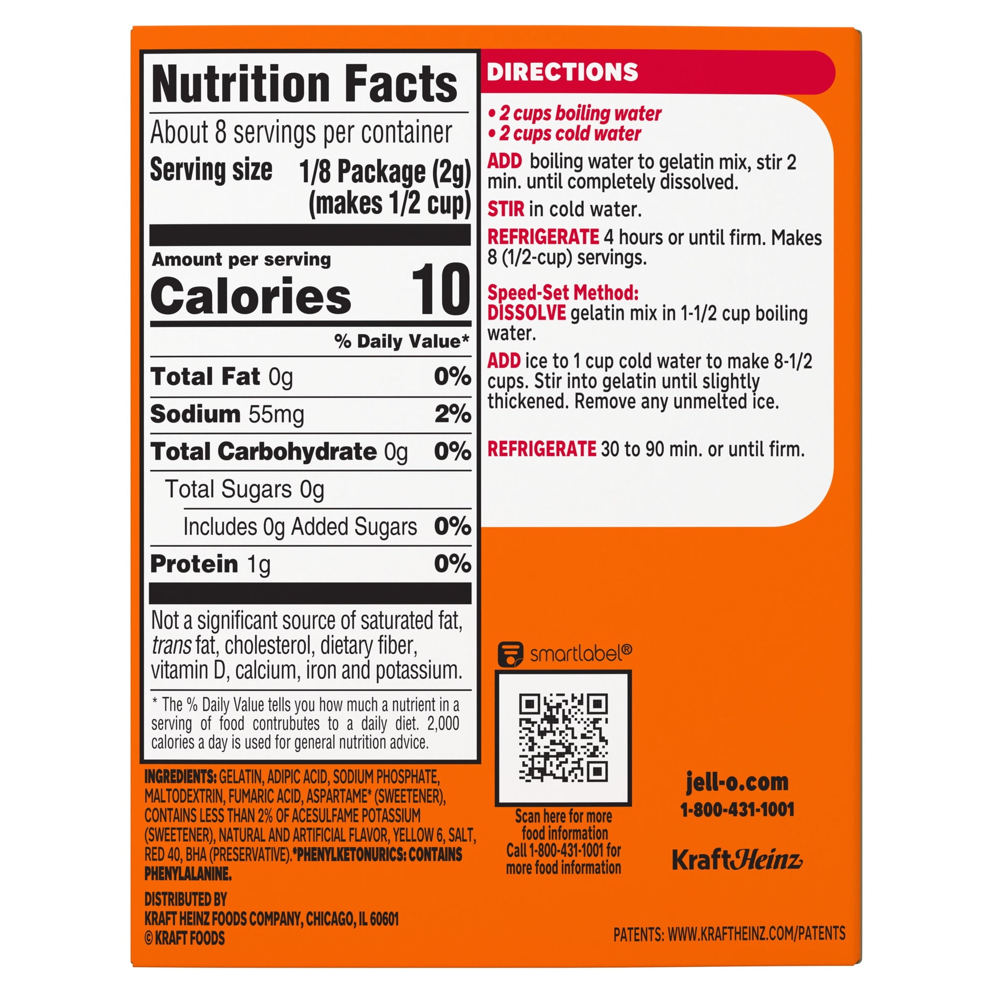 Snack happy. Jell-O Orange Artificially Flavored Zero Sugar Low Calorie Gelatin Dessert Mix lets you add some wonder to your day with a fun snack. Spoon up a smile with our zero sugar artificially flavored orange Jell-O gelatin that is delicious and contains 10 calories per serving. Our colorful, jiggly treat is perfect for everyday snacking or special occasions with family and friends. Additionally, our gelatin dessert mix is a versatile ingredient for creating delicious desserts like poke cakes, parfaits, pretzel salads, rainbow layer cakes and more. Our artificially flavored orange gelatin dessert is easy to prepare. Simply add 2 cups boiling water to the gelatin mix, stir for 2 minutes until completely dissolved, stir in 2 cups cold water, then refrigerate for 4 hours or until firm. Each family size Jell-O zero sugar gelatin dessert mix is individually packaged in a 0.6-ounce sealed pouch and makes 8, 1/2-cup servings.