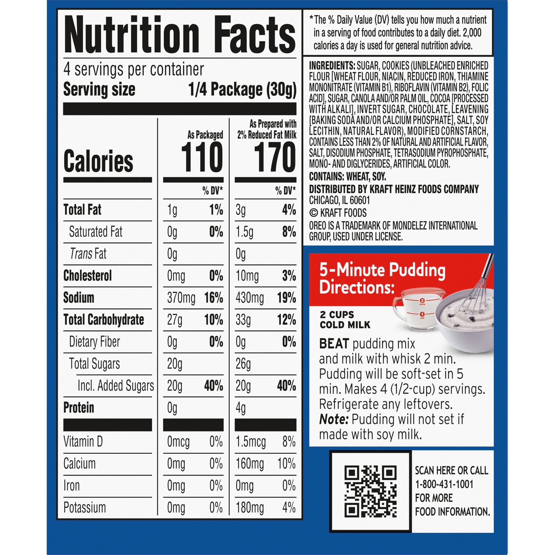 Jell-O Oreo Cookies n' Creme Instant Pudding Mix offers a delicious flavor, whether you eat it as a treat or use it as an ingredient in your favorite dessert recipes. The delicious Oreo cookies n' cream flavor tastes great as an instant pie filling or in a chocolate cookie dessert. It contains no high fructose corn syrup. The dessert is easy to make in just five minutes; simply stir milk into the pudding powder and allow to set. You will quickly have a delicious pudding that the entire family will enjoy. The 4.2 ounce box of Jell-O cookies and cream pudding mix comes individually packaged in a sealed pouch.