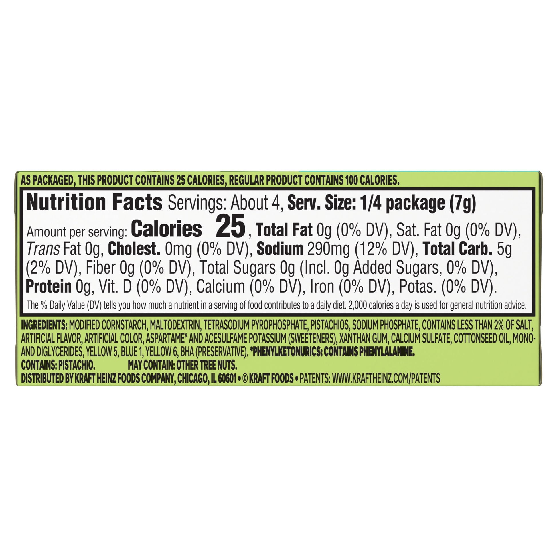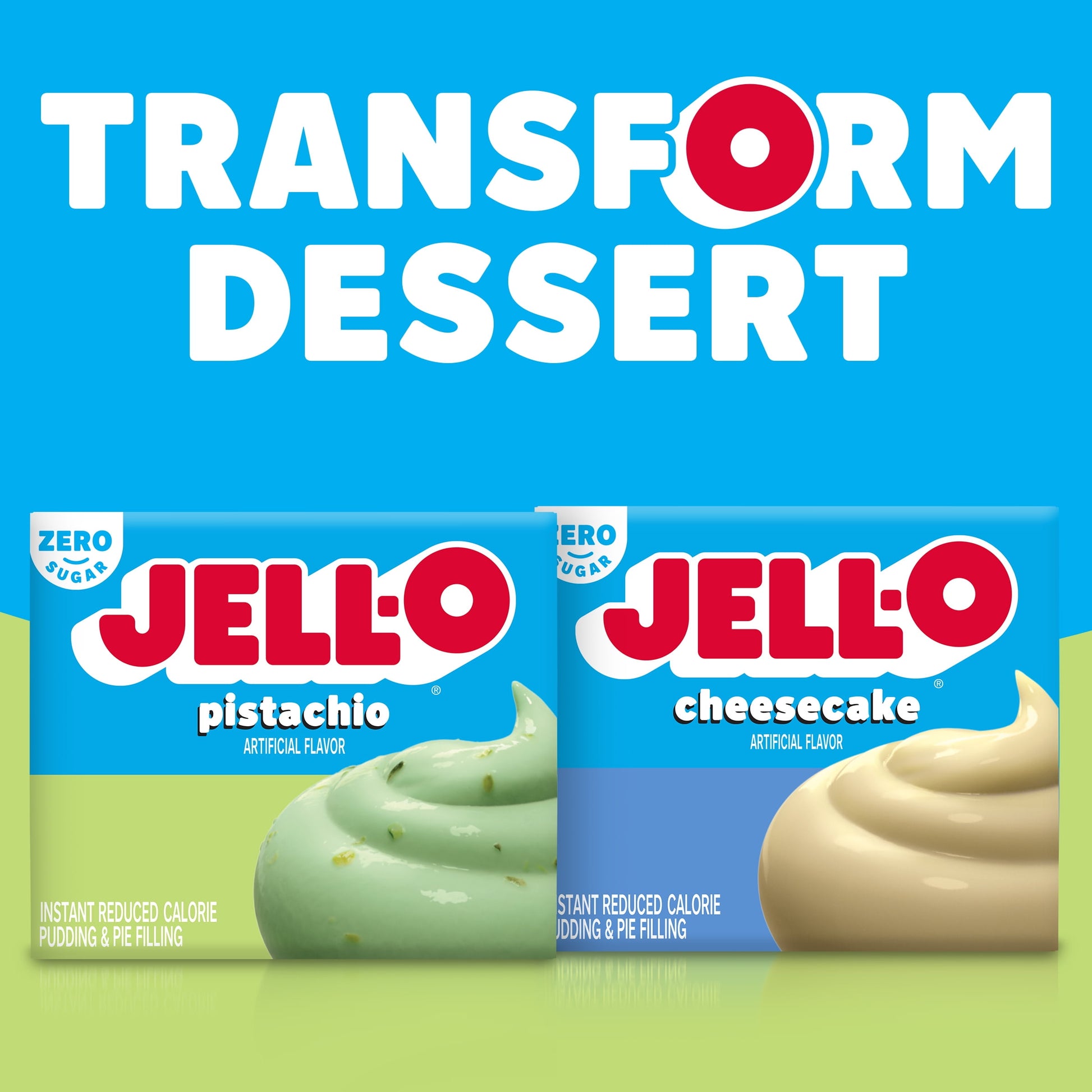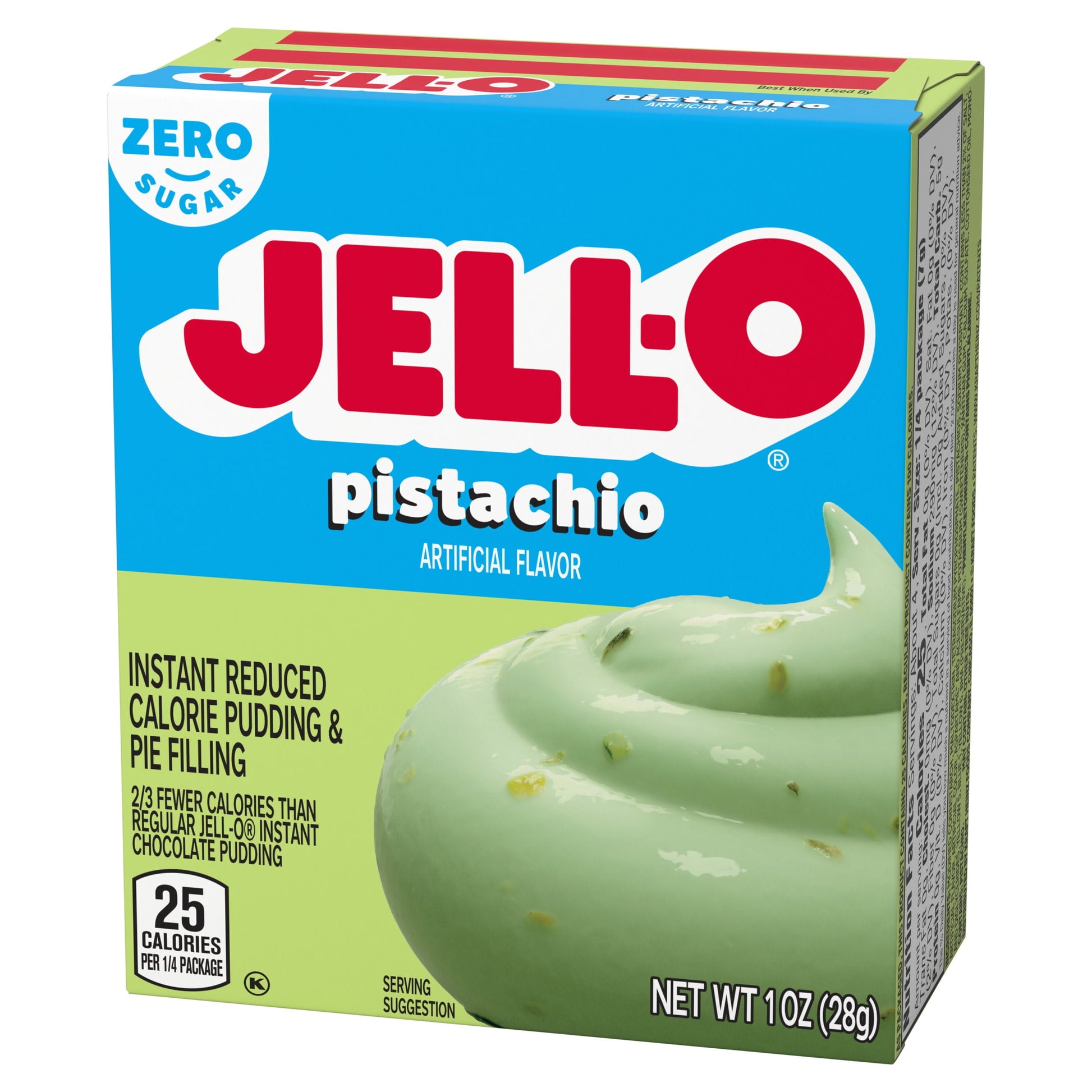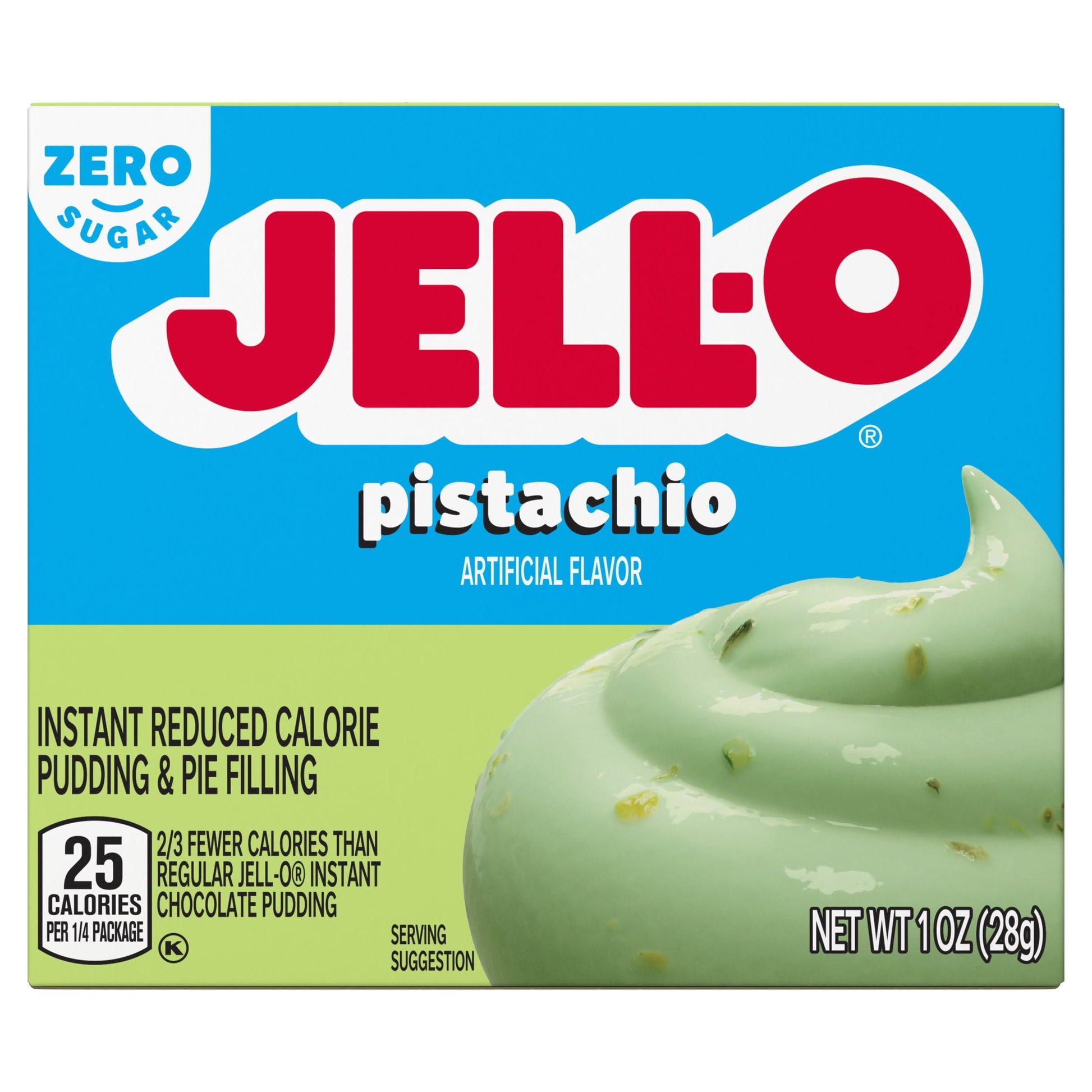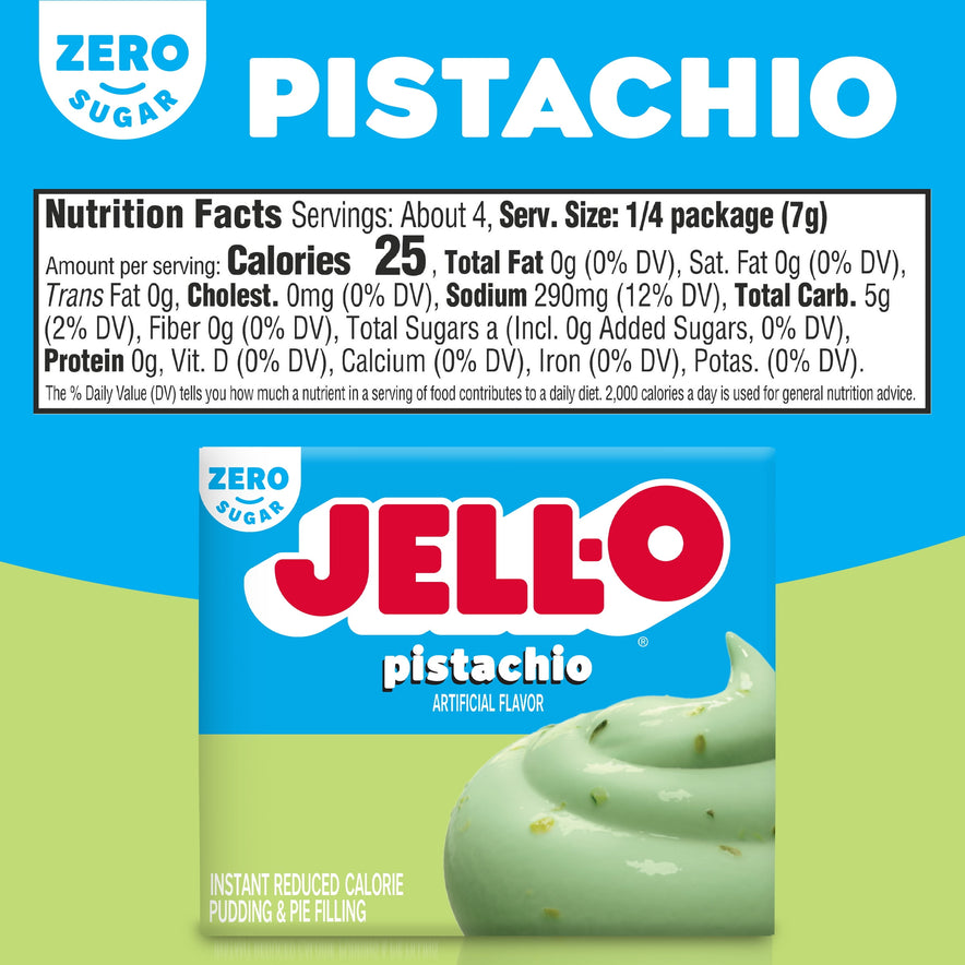 Snack happy. Jell-O Zero Sugar Pistachio Instant Reduced Calorie Pudding Mix & Pie Filling tastes delicious whether you enjoy it as a treat or use it as an ingredient in your favorite dessert recipes. Add some wonder to your day with a delicious snack. Fun to make with your kids, our zero sugar artificially flavored pistachio pudding mix can also be used to create a poke cake, tasty crepes or pistachio pie filling. You'll feel good about serving our zero sugar pudding mix that is 2/3 fewer calories than regular Jell-O instant chocolate pudding; as packaged, this product contains 25 calories, regular product contains 100 calories. Our zero sugar artificially flavored pistachio pudding is ready in as little as five minutes. Simply stir milk into the pudding mix and allow to set. Every zero sugar Jell-O pudding mix comes packaged in a 1-ounce sealed pouch. Pudding fun in every bite.