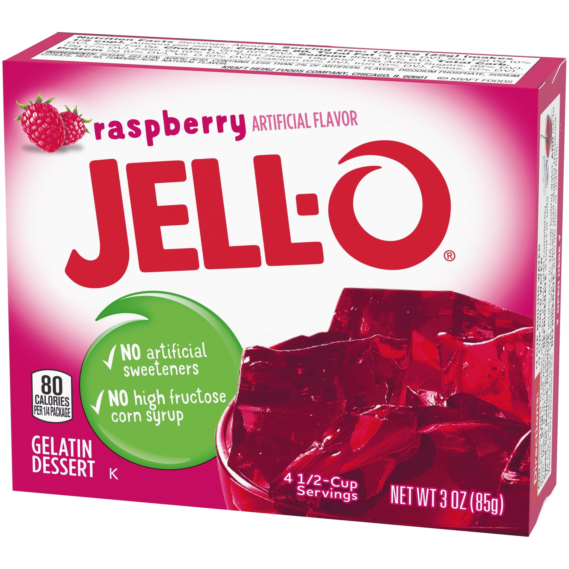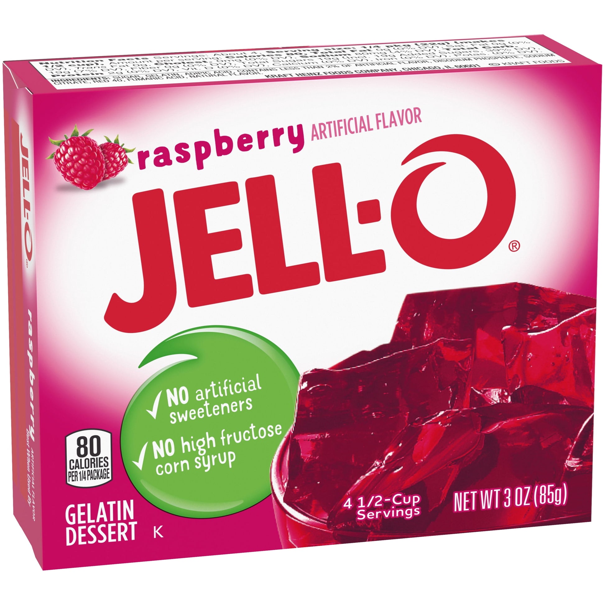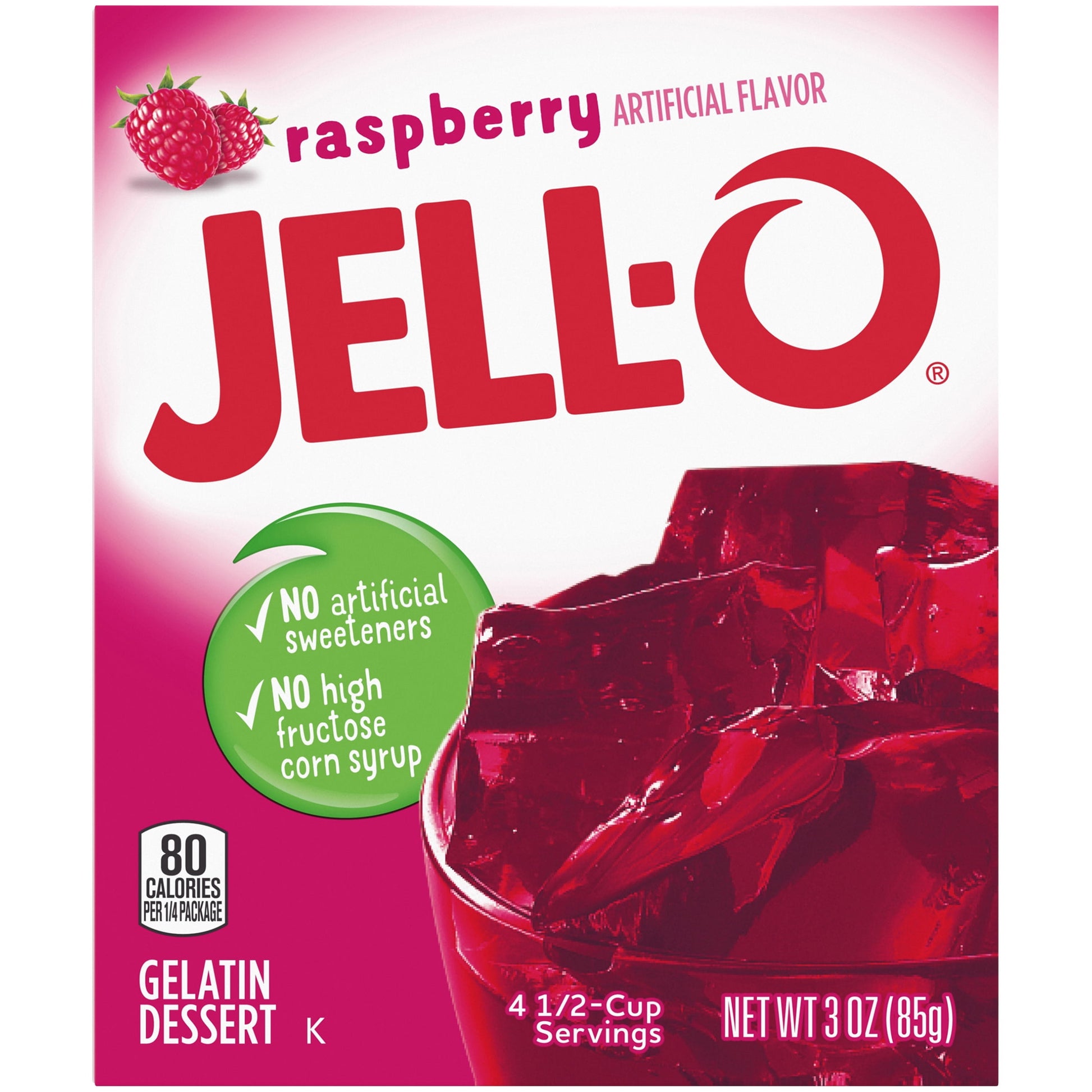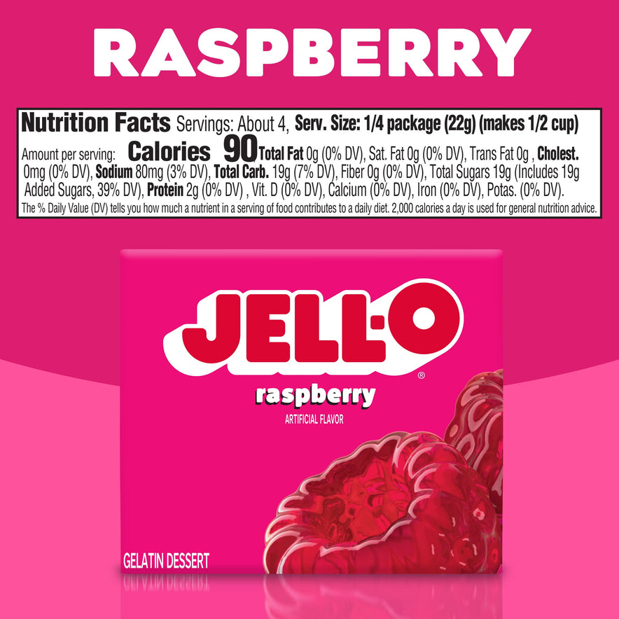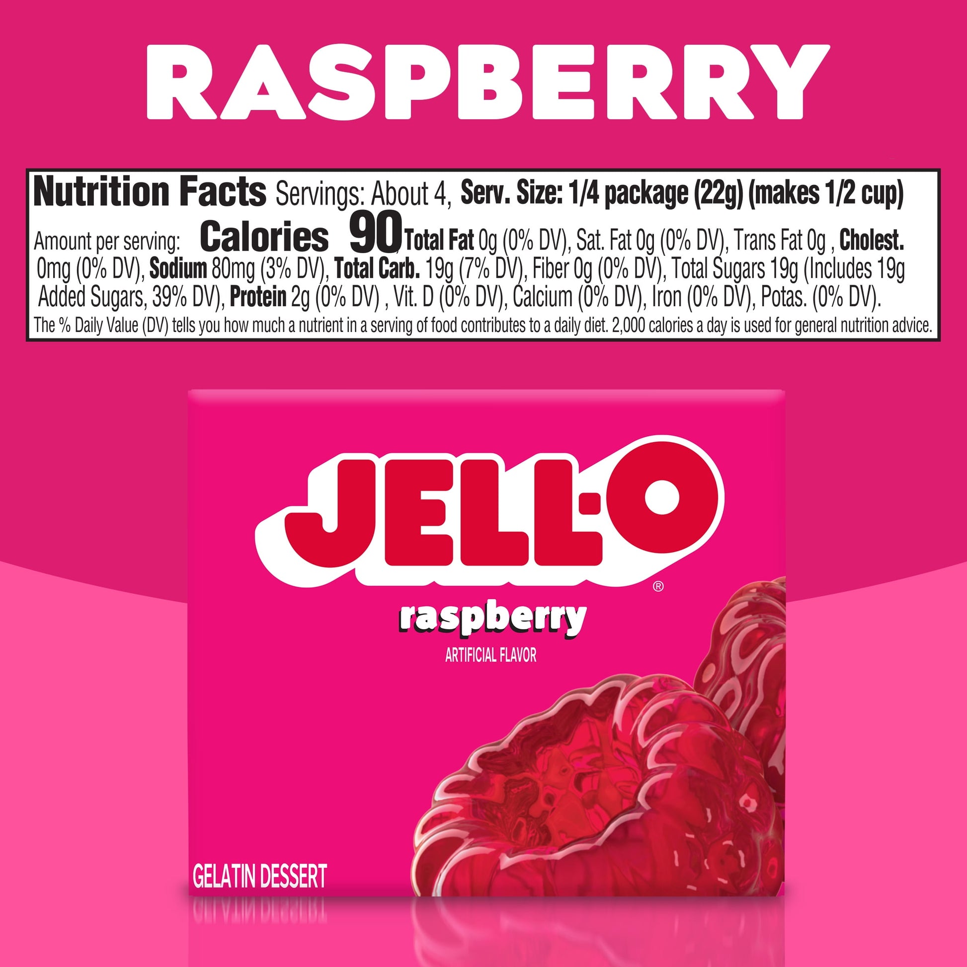 Snack happy. Jell-O Raspberry Artificially Flavored Gelatin Dessert Mix lets you add some wonder to your day with a delicious snack. Spoon up a smile with our artificially flavored raspberry Jell-O gelatin that contains 80 calories per serving. Our colorful, jiggly treat is perfect for everyday snacking or special occasions with family and friends. Additionally, our gelatin dessert mix is a versatile ingredient for creating desserts like poke cakes, parfaits, pretzel salads, rainbow layer cakes and more. Our artificially flavored raspberry gelatin dessert is easy to prepare. Simply add 1 cup boiling water to the gelatin mix, stir for 2 minutes until completely dissolved, stir in 1 cup cold water, then refrigerate for 4 hours or until firm. Each Jell-O gelatin dessert mix is individually packaged in a 3-ounce sealed pouch and makes 4, 1/2-cup servings.