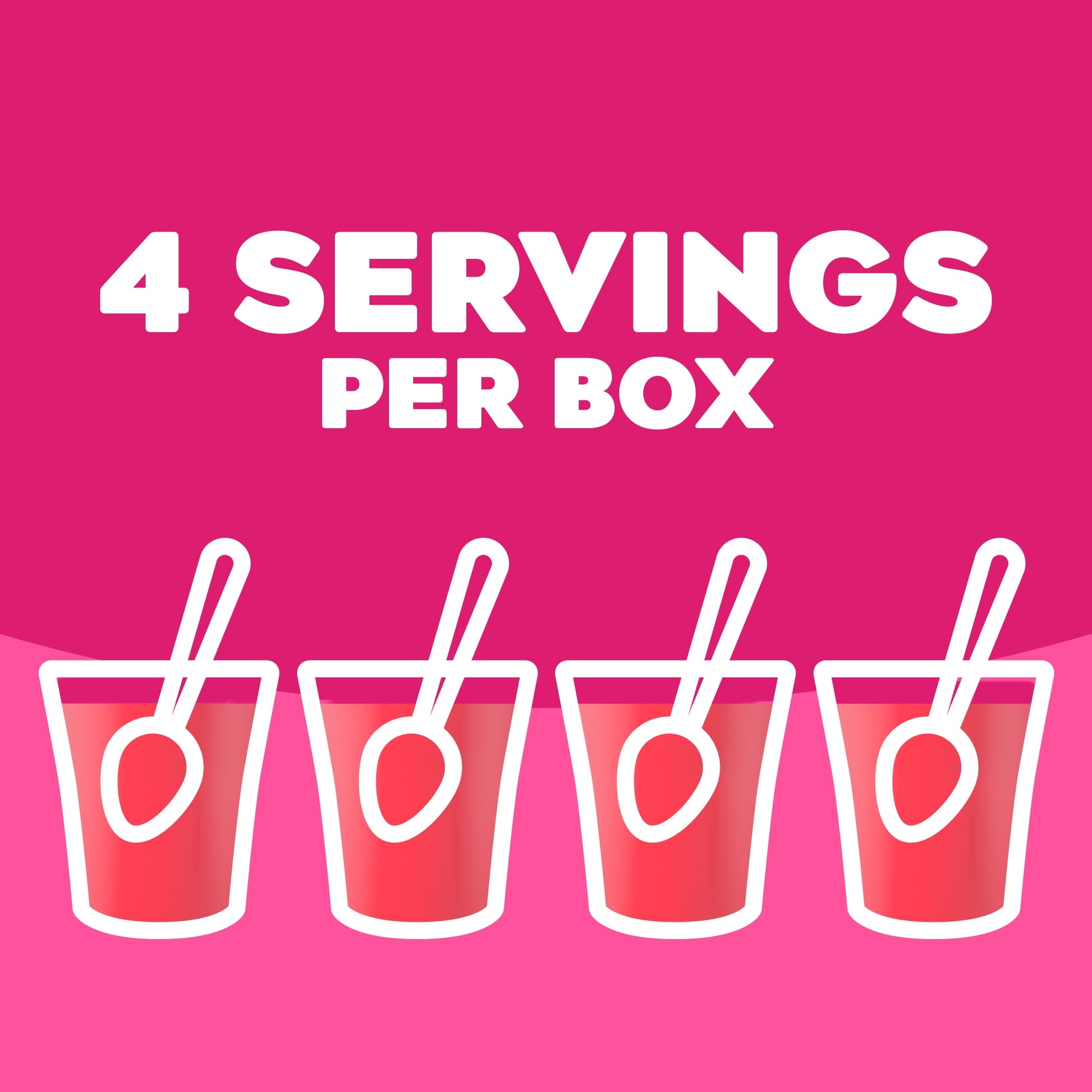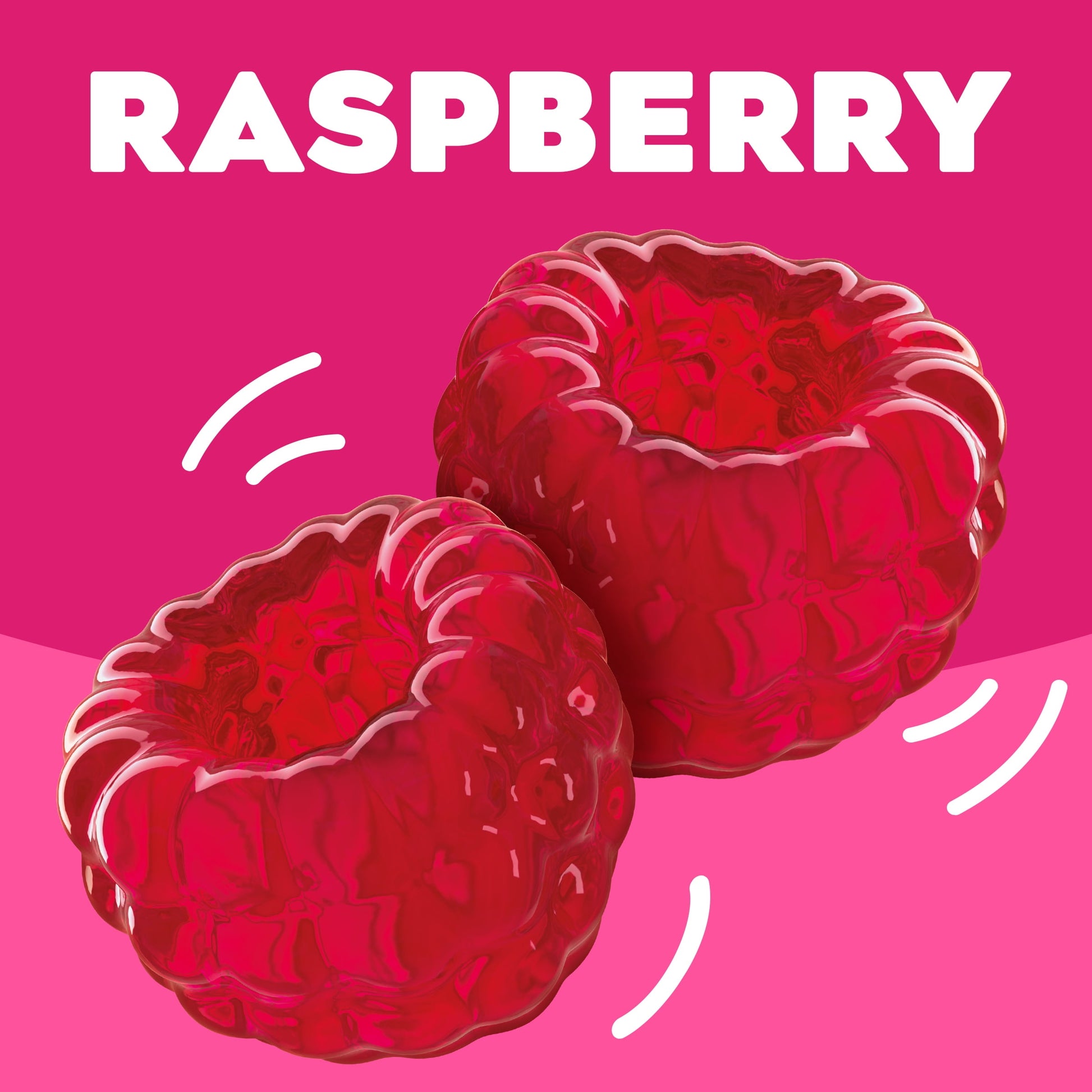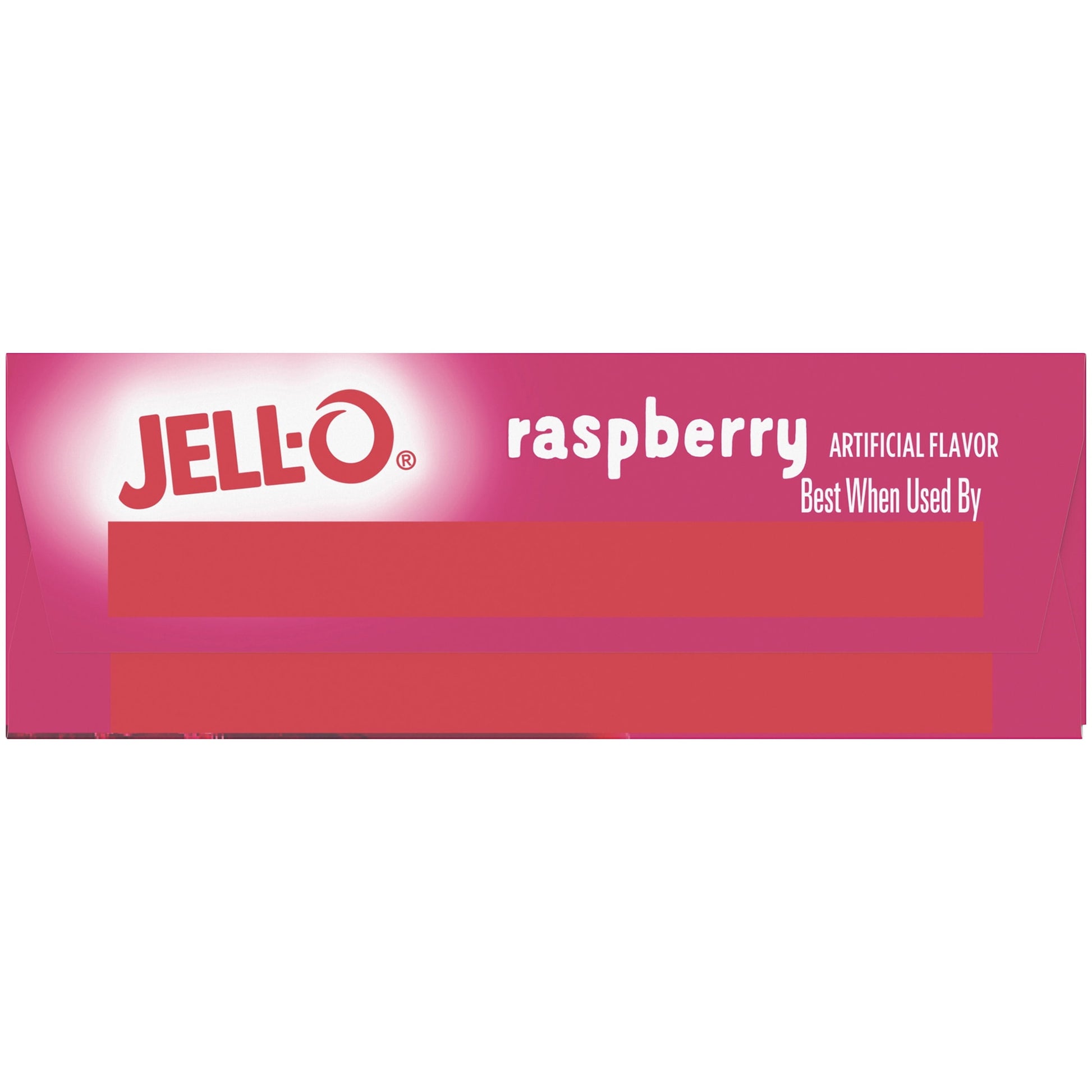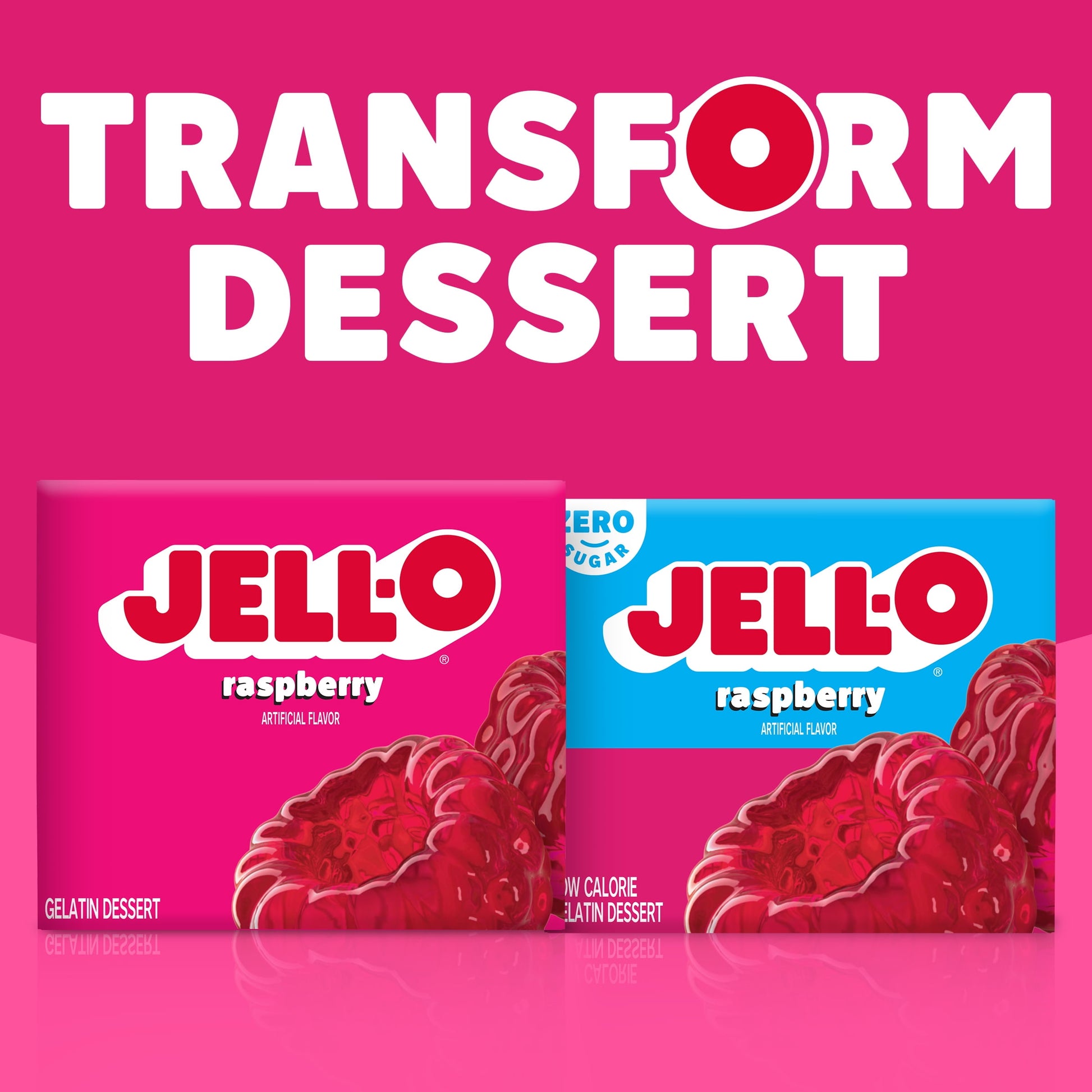 Snack happy. Jell-O Raspberry Artificially Flavored Gelatin Dessert Mix lets you add some wonder to your day with a delicious snack. Spoon up a smile with our artificially flavored raspberry Jell-O gelatin that contains 80 calories per serving. Our colorful, jiggly treat is perfect for everyday snacking or special occasions with family and friends. Additionally, our gelatin dessert mix is a versatile ingredient for creating desserts like poke cakes, parfaits, pretzel salads, rainbow layer cakes and more. Our artificially flavored raspberry gelatin dessert is easy to prepare. Simply add 1 cup boiling water to the gelatin mix, stir for 2 minutes until completely dissolved, stir in 1 cup cold water, then refrigerate for 4 hours or until firm. Each Jell-O gelatin dessert mix is individually packaged in a 3-ounce sealed pouch and makes 4, 1/2-cup servings.