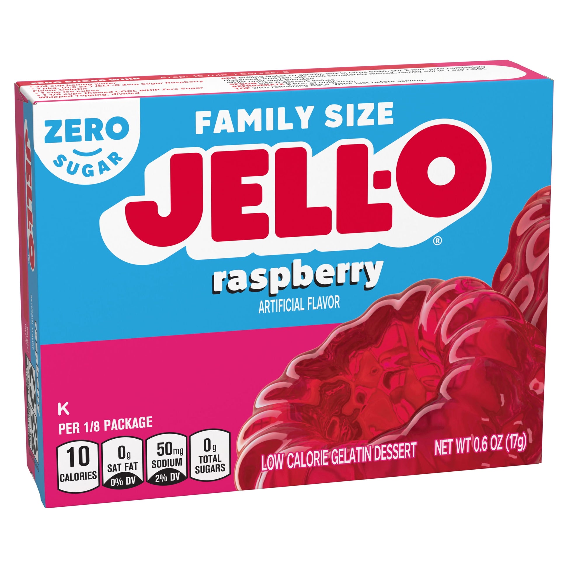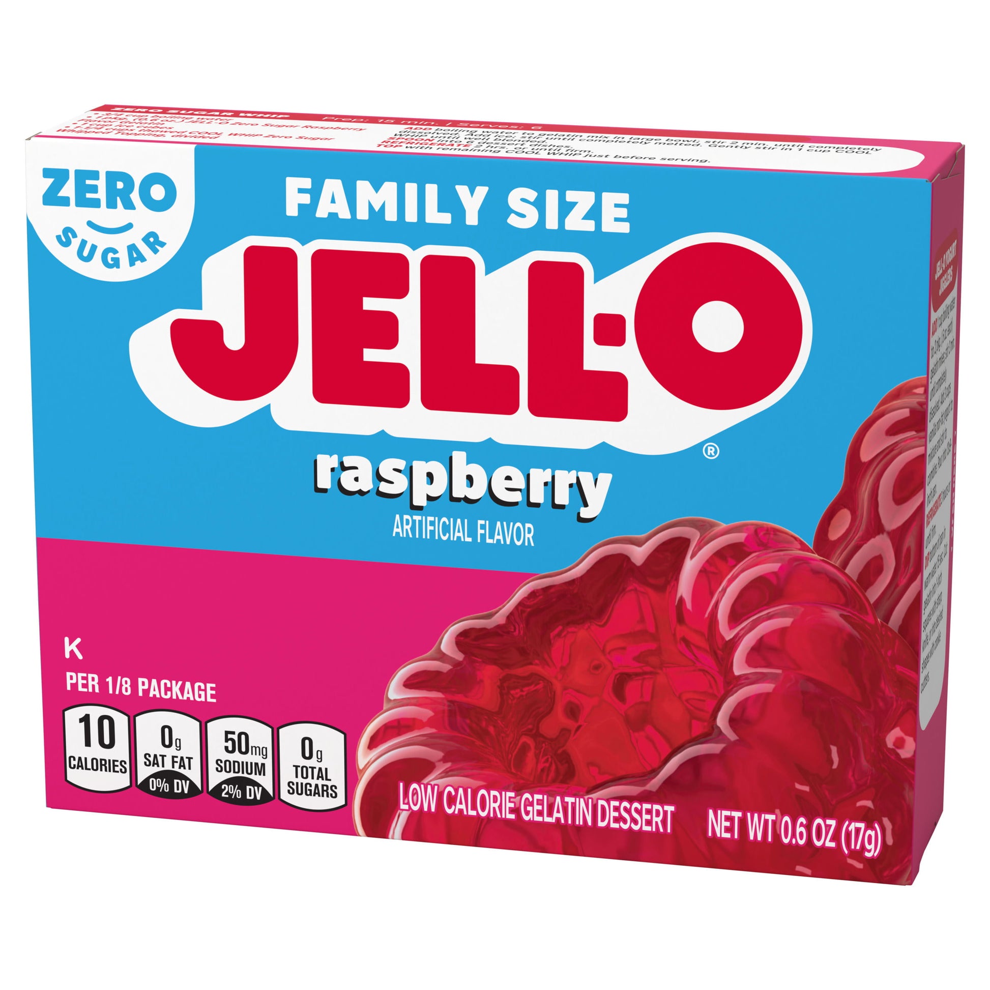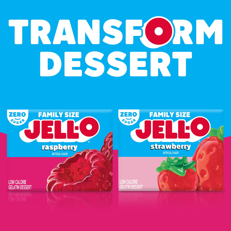 Snack happy. Jell-O Raspberry Artificially Flavored Zero Sugar Gelatin Dessert Mix lets you add some wonder to your day with a fun snack. Spoon up a smile with our zero sugar artificially flavored raspberry Jell-O gelatin that is delicious and contains 10 calories per serving. Our colorful, jiggly treat is perfect for everyday snacking or special occasions with family and friends. Additionally, our gelatin dessert mix is a versatile ingredient for creating delicious desserts like poke cakes, parfaits, pretzel salads, rainbow layer cakes and more. Our artificially flavored raspberry gelatin dessert is easy to prepare. Simply add 2 cups boiling water to the gelatin mix, stir for 2 minutes until completely dissolved, stir in 2 cups cold water, then refrigerate for 4 hours or until firm. Each family size Jell-O zero sugar gelatin dessert mix is individually packaged in a 0.6-ounce sealed pouch and makes 8, 1/2-cup servings.