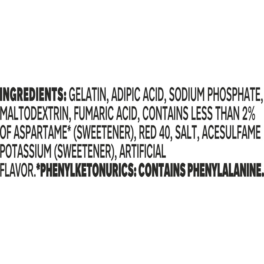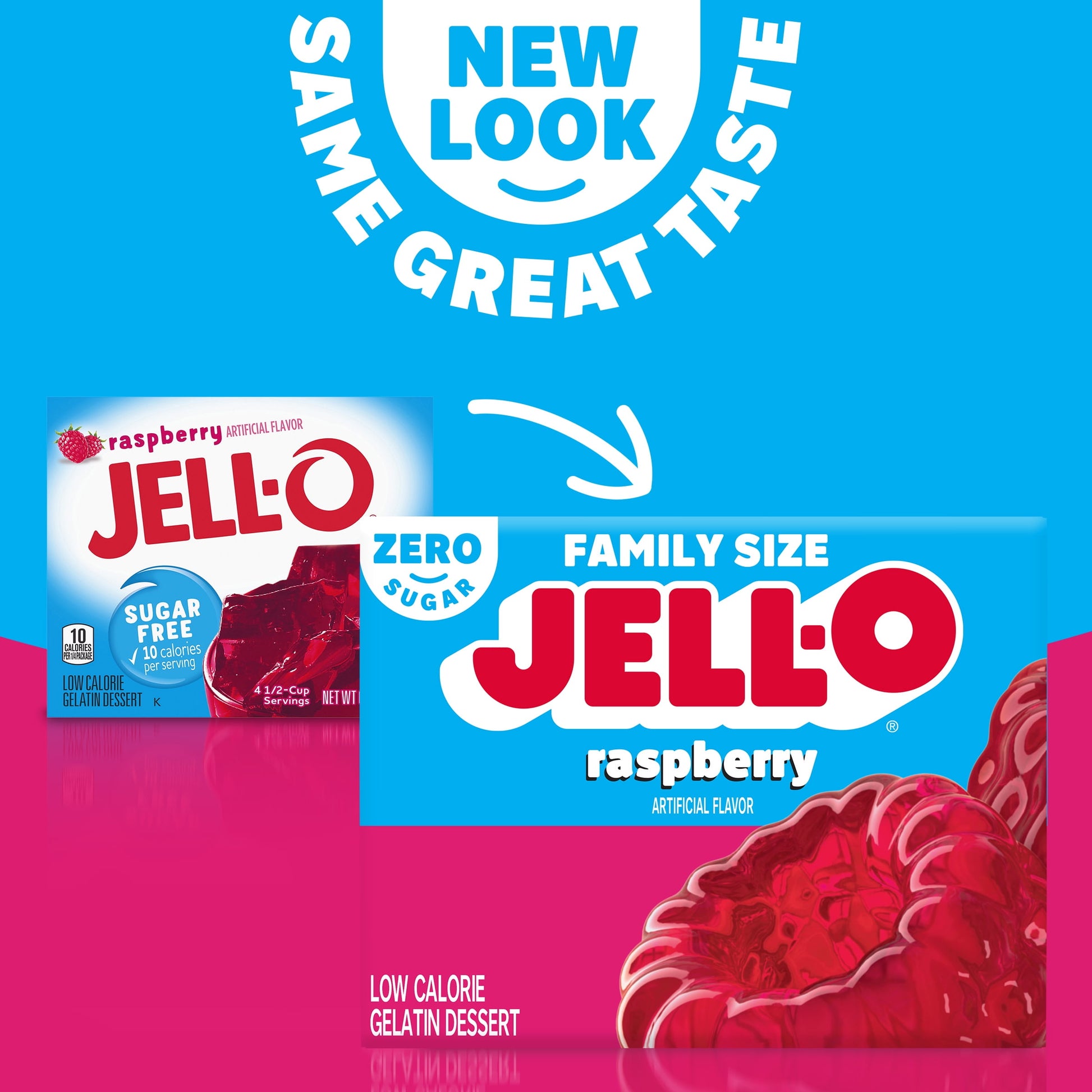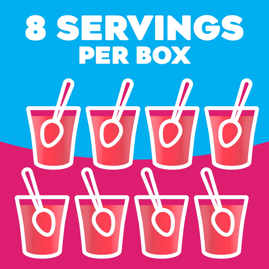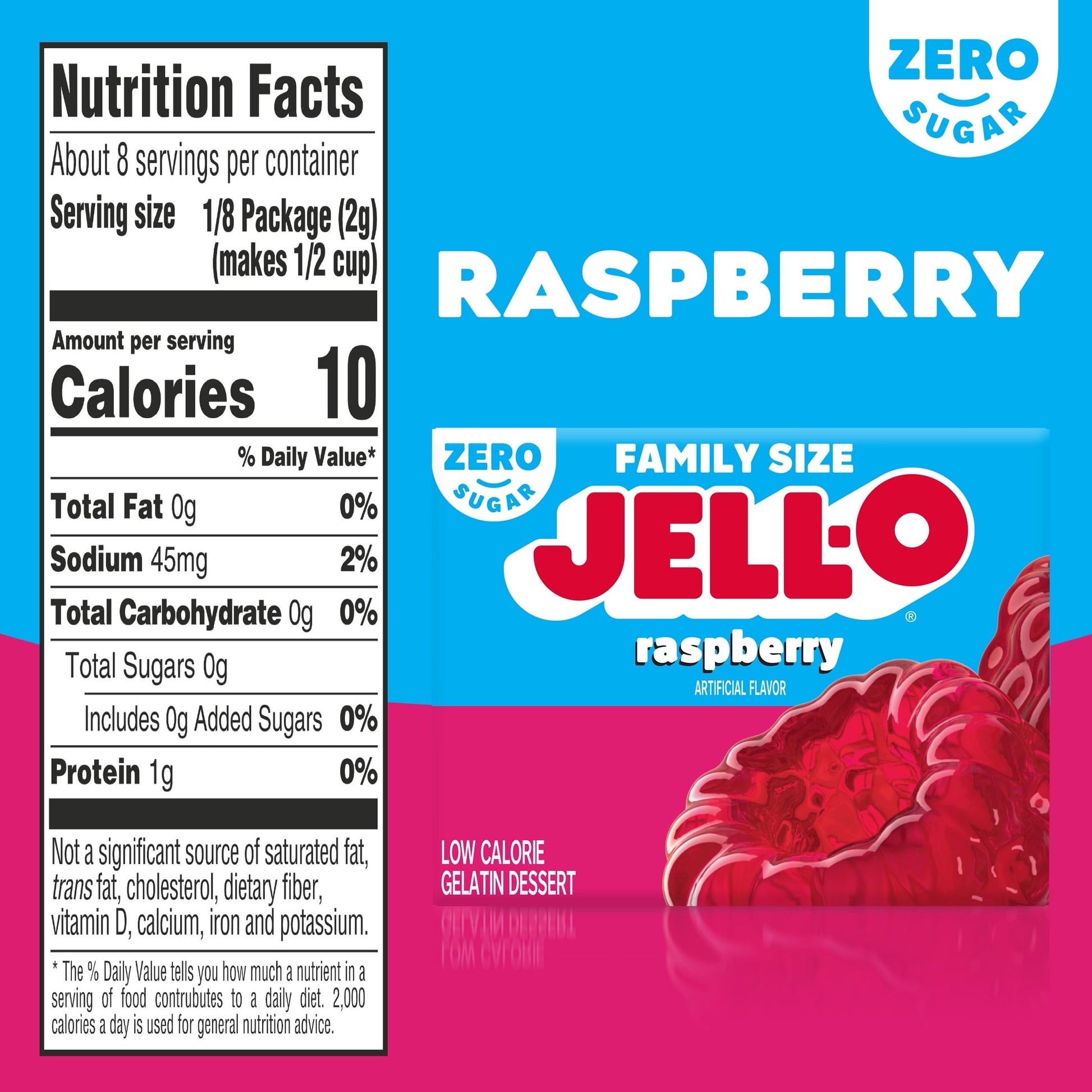 Snack happy. Jell-O Raspberry Artificially Flavored Zero Sugar Gelatin Dessert Mix lets you add some wonder to your day with a fun snack. Spoon up a smile with our zero sugar artificially flavored raspberry Jell-O gelatin that is delicious and contains 10 calories per serving. Our colorful, jiggly treat is perfect for everyday snacking or special occasions with family and friends. Additionally, our gelatin dessert mix is a versatile ingredient for creating delicious desserts like poke cakes, parfaits, pretzel salads, rainbow layer cakes and more. Our artificially flavored raspberry gelatin dessert is easy to prepare. Simply add 2 cups boiling water to the gelatin mix, stir for 2 minutes until completely dissolved, stir in 2 cups cold water, then refrigerate for 4 hours or until firm. Each family size Jell-O zero sugar gelatin dessert mix is individually packaged in a 0.6-ounce sealed pouch and makes 8, 1/2-cup servings.