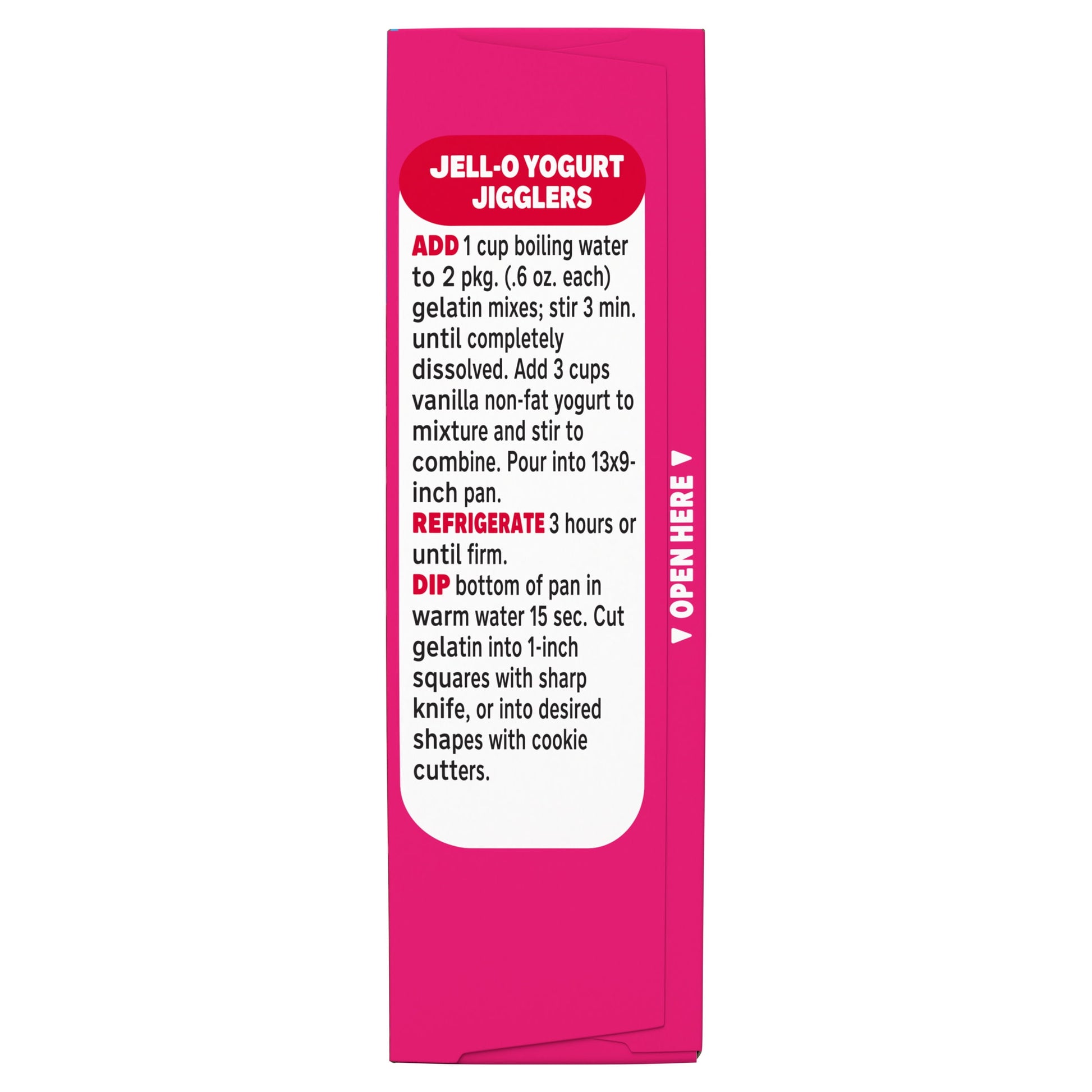 To prepare, add 2 cups boiling water to gelatin mix, stir 2 minutes until completely dissolved, stir in 2 cups cold water, then refrigerate 4 hours or until firm
