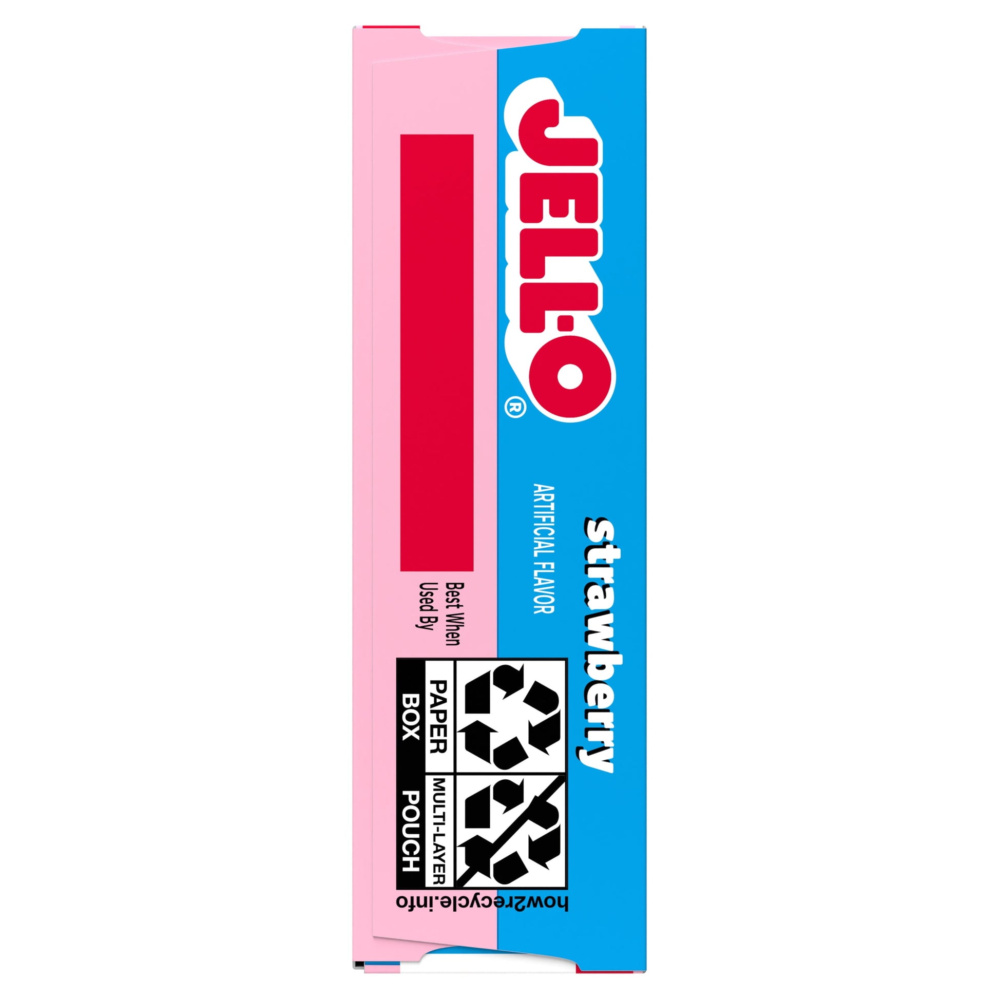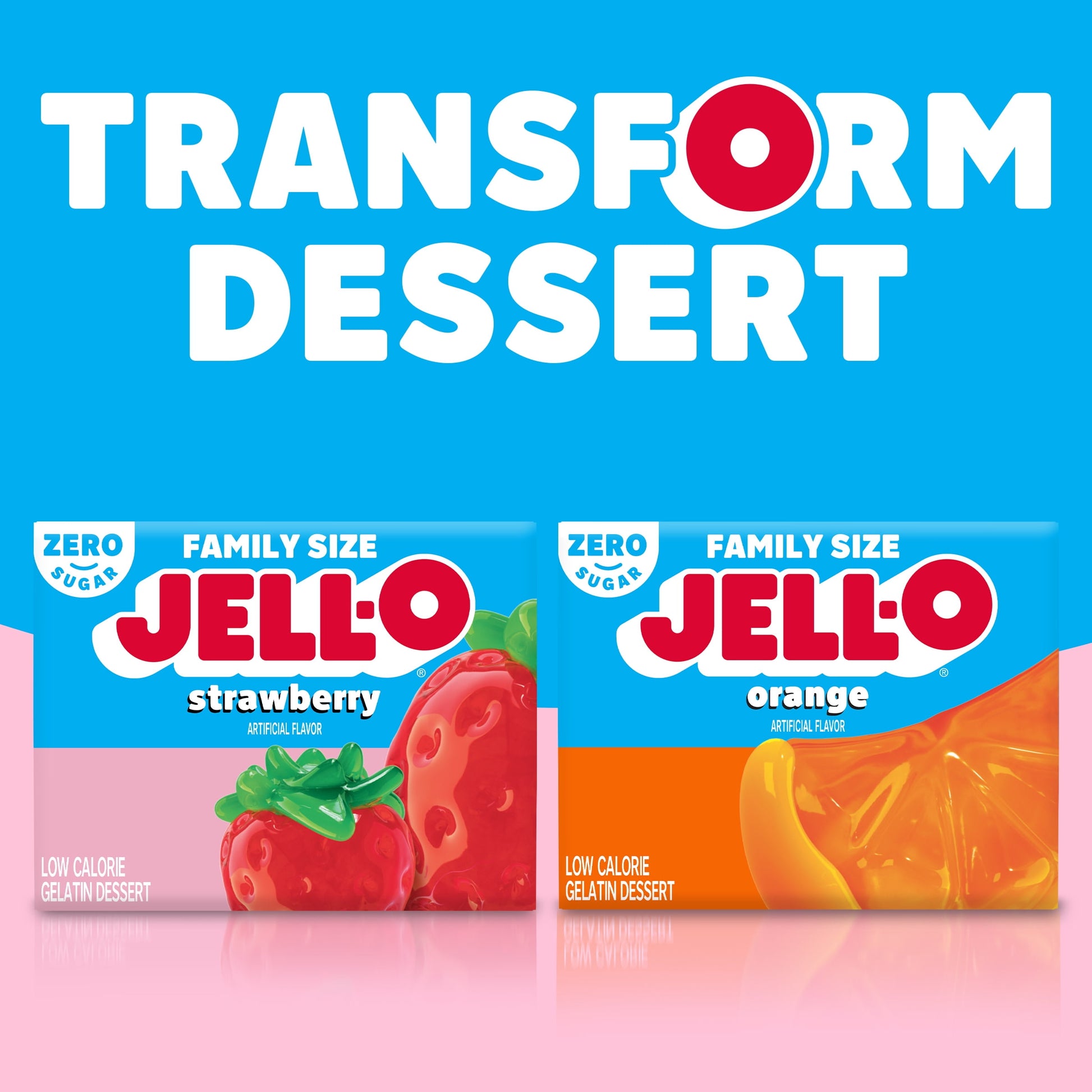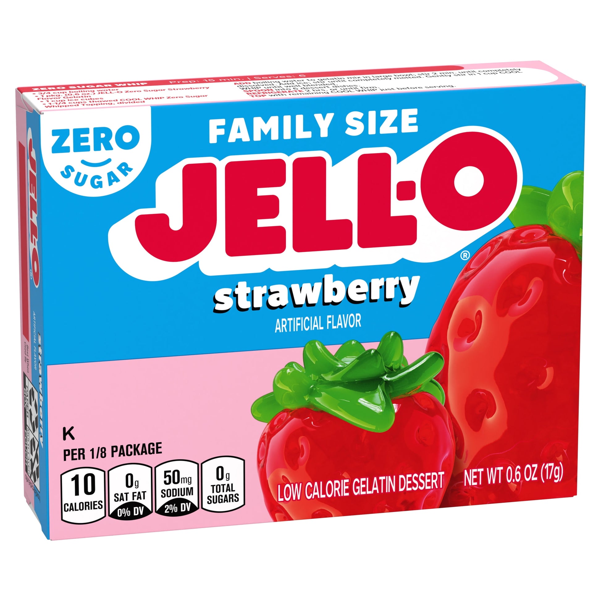 Snack happy. Jell-O Strawberry Artificially Flavored Zero Sugar Gelatin Dessert Mix lets you add some wonder to your day with a fun snack. Spoon up a smile with our zero sugar artificially flavored strawberry Jell-O gelatin that is delicious and contains 10 calories per serving. Our colorful, jiggly treat is perfect for everyday snacking or special occasions with family and friends. Additionally, our gelatin dessert mix is a versatile ingredient for creating delicious desserts like poke cakes, parfaits, pretzel salads, rainbow layer cakes and more. Our artificially flavored strawberry gelatin dessert is easy to prepare. Simply add 2 cups boiling water to the gelatin mix, stir for 2 minutes until completely dissolved, stir in 2 cups cold water, then refrigerate for 4 hours or until firm. Each family size Jell-O zero sugar gelatin dessert mix is individually packaged in a 0.6-ounce sealed pouch and makes 8, 1/2-cup servings.