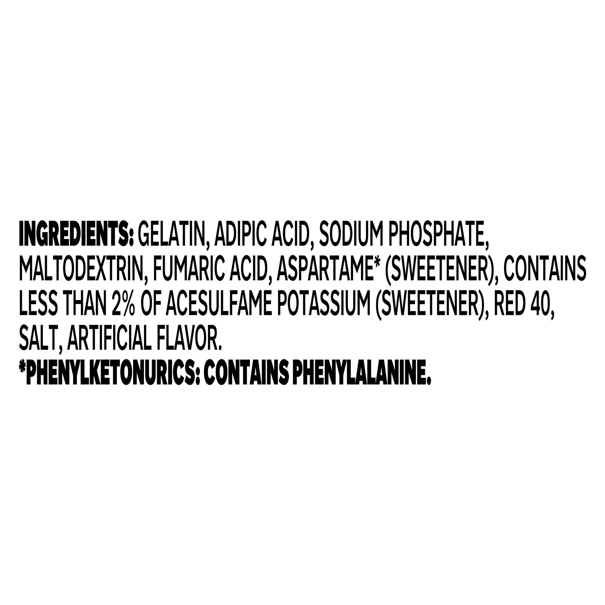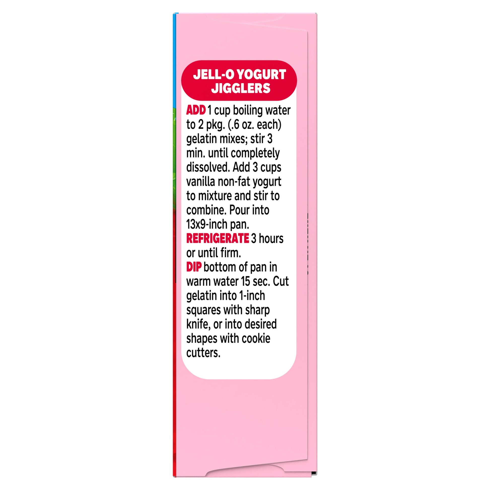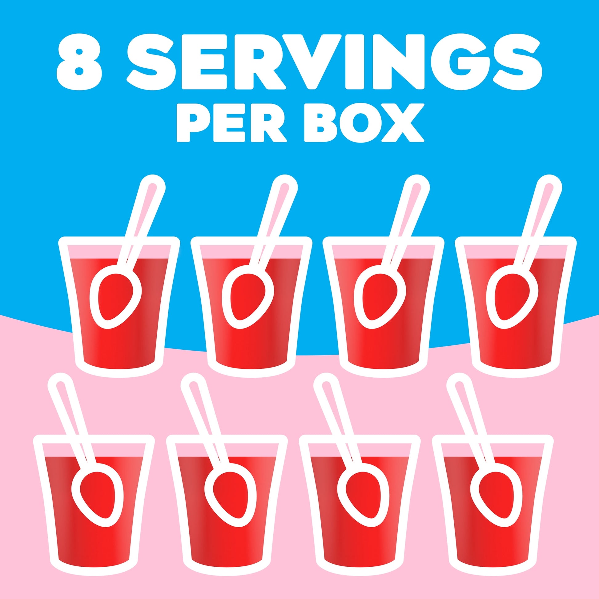 Snack happy. Jell-O Strawberry Artificially Flavored Zero Sugar Gelatin Dessert Mix lets you add some wonder to your day with a fun snack. Spoon up a smile with our zero sugar artificially flavored strawberry Jell-O gelatin that is delicious and contains 10 calories per serving. Our colorful, jiggly treat is perfect for everyday snacking or special occasions with family and friends. Additionally, our gelatin dessert mix is a versatile ingredient for creating delicious desserts like poke cakes, parfaits, pretzel salads, rainbow layer cakes and more. Our artificially flavored strawberry gelatin dessert is easy to prepare. Simply add 2 cups boiling water to the gelatin mix, stir for 2 minutes until completely dissolved, stir in 2 cups cold water, then refrigerate for 4 hours or until firm. Each family size Jell-O zero sugar gelatin dessert mix is individually packaged in a 0.6-ounce sealed pouch and makes 8, 1/2-cup servings.
