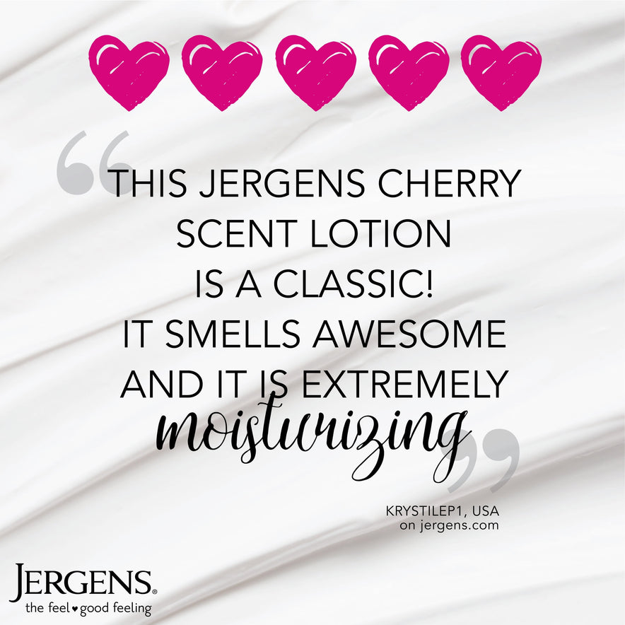 Reveal softer, more radiant skin when you smooth on Jergens Original Scent Dry Skin Body Moisturizer with Cherry Almond Essence. It provides long-lasting, moisture-rich hydration and noticeably softer, smoother skin. Our formula, with a unique HYDRALUCENCE blend, nourishing hydrators, and Jergens Cherry Almond essence, leaves skin deeply luminous and lightly scented. For Best Use: Use daily to help reveal deeply luminous, visibly softer skin. OUR STORY: Since 1901, Jergens skin care has been the trusted brand for comforting moisture. That’s because everything we do is designed to help you feel good – soothing relief from dryness, a touch of summer color, a fruity scent that makes Monday feel like Friday. We’re not here to stop at skin deep. We’re here to help you feel truly, deeply, skin-to-soul comfortable, with a few surprises along the way. We bottle all that up into the Feel-Good Feeling of Jergens. Satisfaction Guarantee. Limitations may apply.