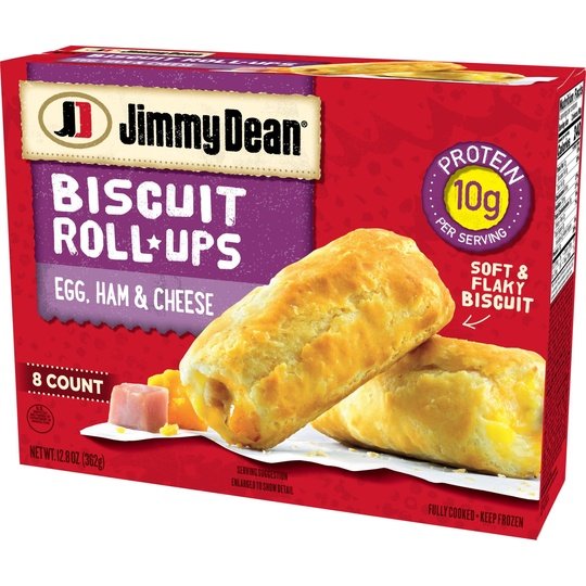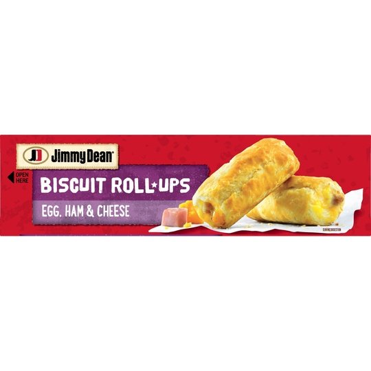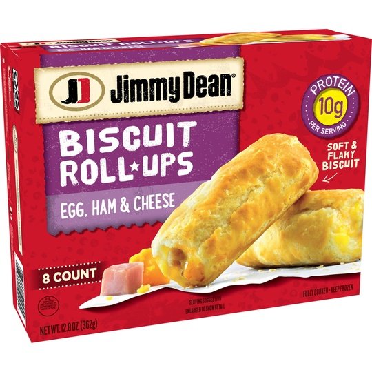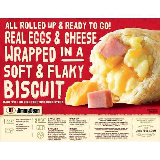 Help add power to your mornings with Jimmy Dean Egg, Ham & Cheese Biscuit Roll Ups. Savory diced ham, real eggs and cheese are rolled into soft and flaky breakfast biscuits for a delicious, portable breakfast at home or on the go. Made with no high fructose corn syrup and containing 10 grams of protein per serving, our biscuit roll ups provide a protein packed option to change up your breakfast sandwich routine. Simply microwave and serve for on the go frozen breakfast meals. Includes one 12.8 oz package of 8 egg, ham and cheese frozen biscuits roll ups. A perfect variation on the classic breakfast wrap or breakfast burrito. The Jimmy Dean brand brings you many ways to add some sunshine to your morning, because today's your day to shine on. Look for our lineup of delicious options in the frozen breakfast food case.