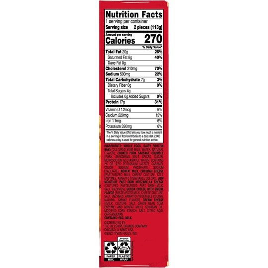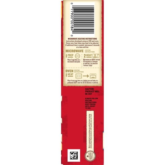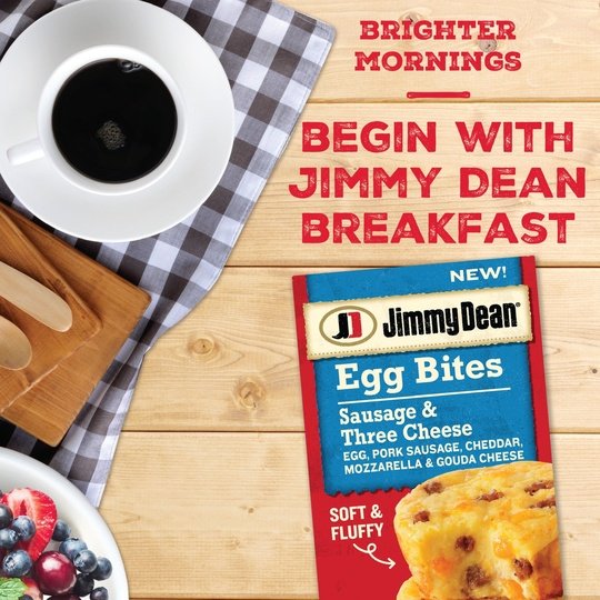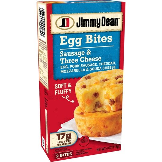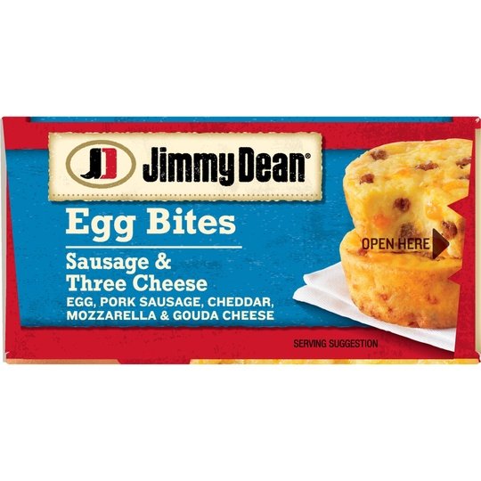 Start your morning off right with Jimmy Dean Sausage and Three Cheese Egg Bites. Made with whole eggs, Jimmy Dean pork sausage and a creamy blend of melted mozzarella, cheddar and gouda cheese, these egg bites are as delicious as they are convenient. Sold in portable packaging containing two bites each, these tasty bites make it easy to help have a satisfying breakfast at work, school or on the go. These breakfast bites contain 17 grams of protein per single serve package, making it a great option as an addition to a morning meal for kids and adults alike. Perfect for when you are short on time in the morning, these egg bites are fully cooked and are quick and easy to prepare in a microwave or oven. Includes one 4 ounce package of Jimmy Dean Sausage and Three Cheese Egg Bites.