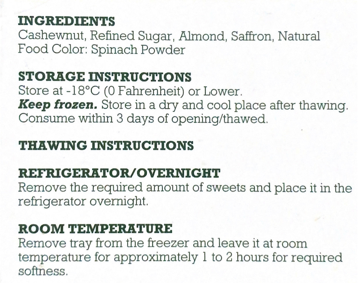 Cashewnut, Refined Sugar, Almond, Saffron, Permitted Food Colors
