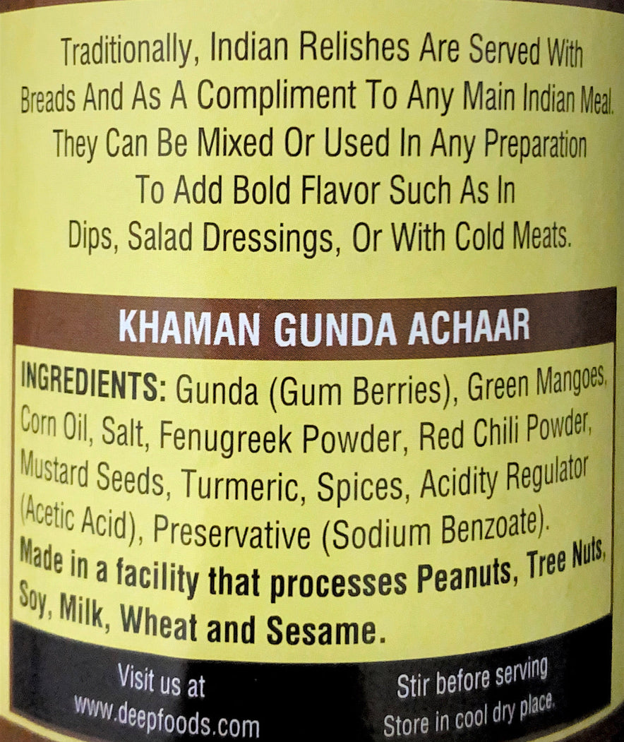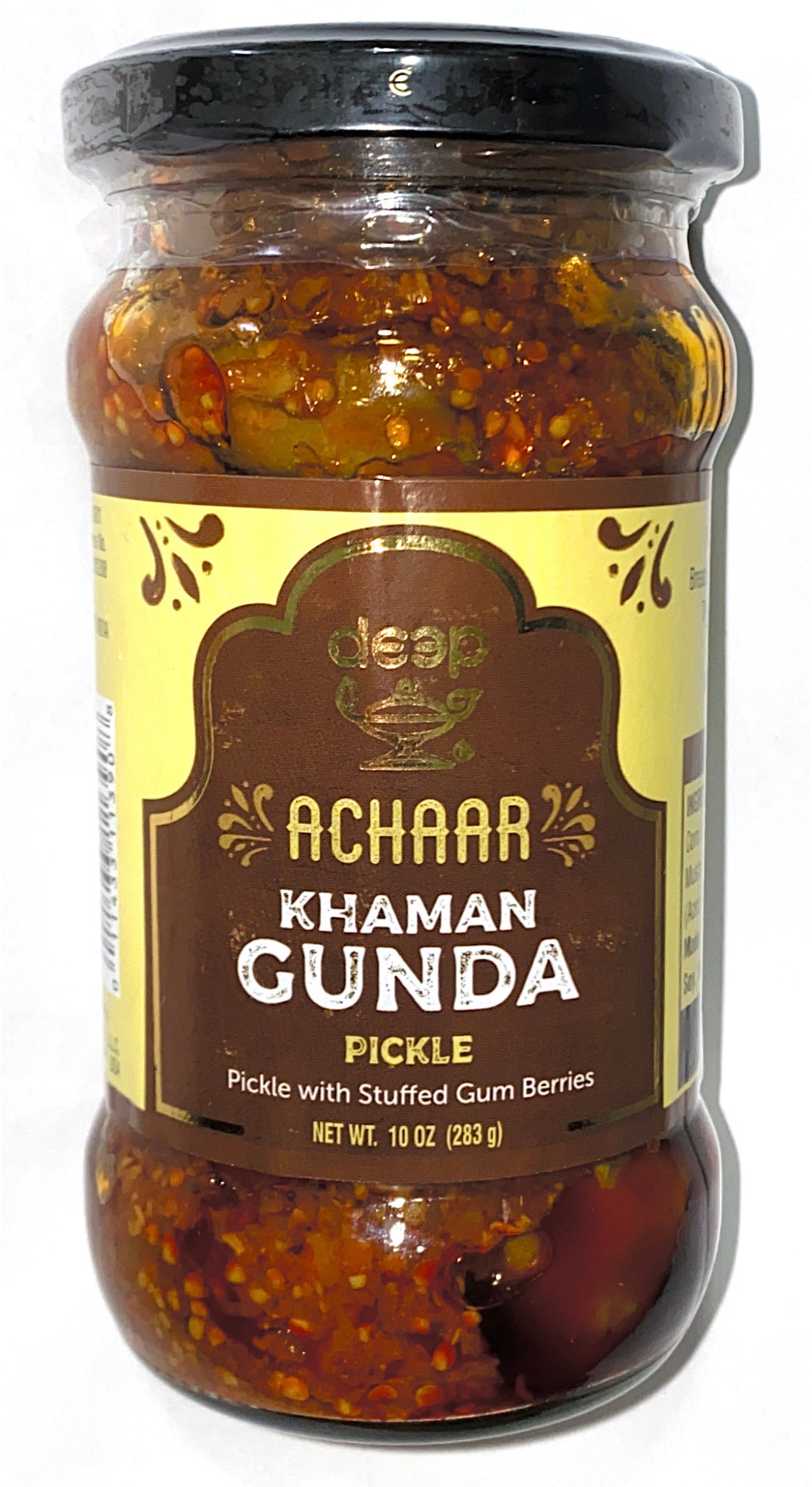 Gunda is a berry grown in India that is similar in size to an olive with a crispy texture. Khaman Gunda pickle is gunda mixed with cut raw mango pieces, salt, corn oil, fenugreek, mustard, red chilli, turmeric, spices, acetic acid and sodium benzoate.