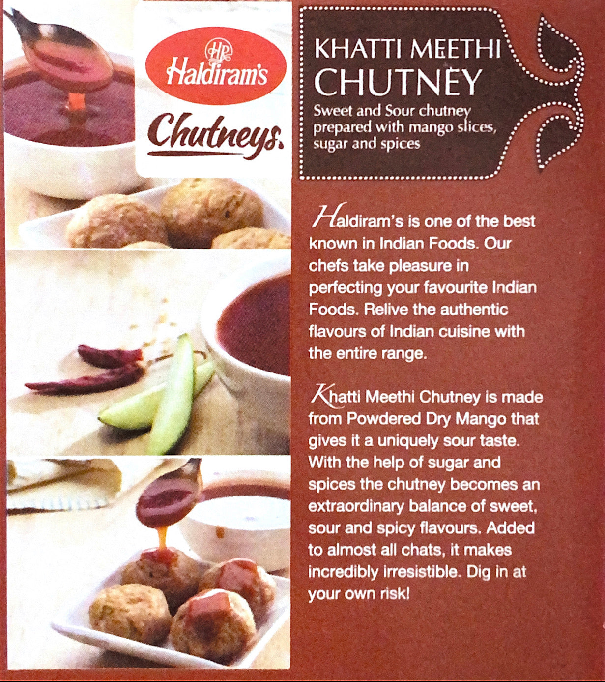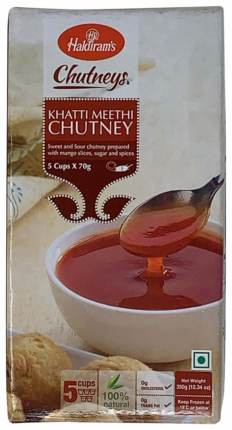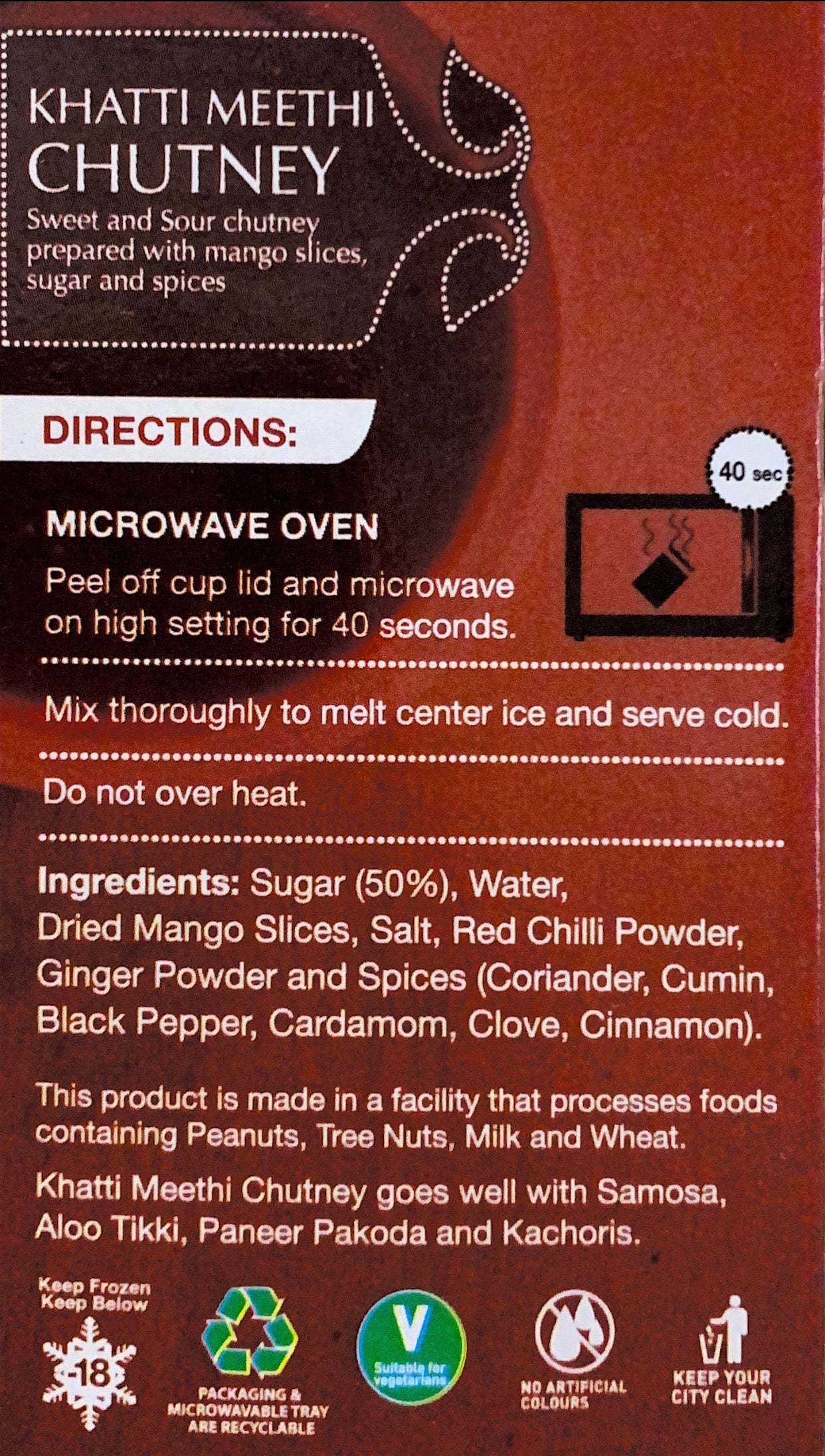 Sweet and sour chutney prepared with mango slices, sugar and spices. Contains 5 individual cups.