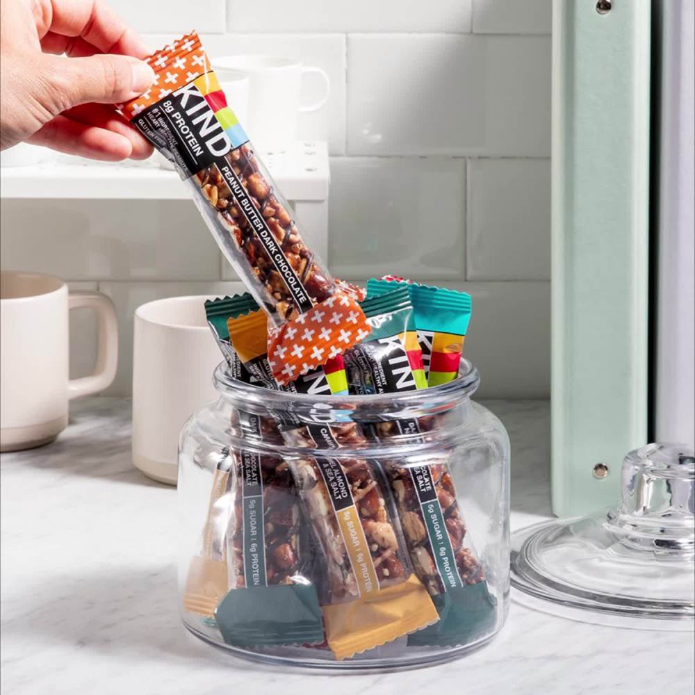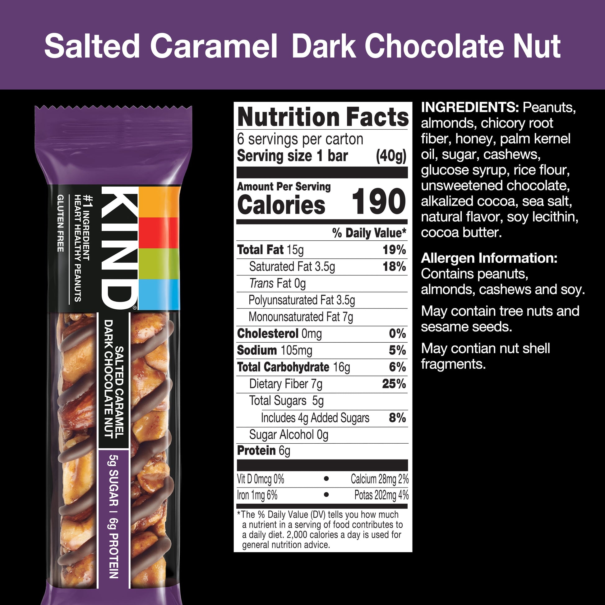 KIND Salted Caramel Dark Chocolate Nut bars are satisfying gluten free bars packed with nuts and the taste of dark chocolate that lead with heart healthy peanuts as the #1 ingredient. This healthy snack bar combines quality ingredients like almonds, dark chocolate and caramel to deliver a delicious taste with a little crunch. KIND bars Salted Caramel Dark Chocolate Nut contain 5 grams of sugar, 6 grams of protein, and are high in fiber*. This KIND nut bar is also gluten free, has a low glycemic index, and is made without genetically engineered ingredients. *Contains 15g of fat per bar. It's the perfect nutrient-dense pick-me-up when life gets in the way.