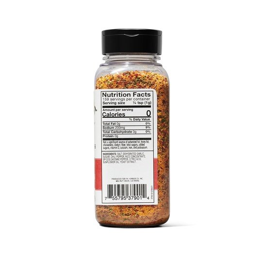 Kinder's Salt Blends Chili Garlic Salt is handcrafted to provide a perfect balance of flavor and heat to a variety of food dishes. This garlic salt seasoning has a rich garlic flavor combined with a kick of heat from chili peppers. Incredibly versatile, this salt blend is great for your favorite cooking recipes, including pasta dishes, roasted vegetables, fries, and more. Add big flavor to your cooking with Kinder's Salt Blends Chili Garlic Salt, the perfect addition to your next friends and family gathering.