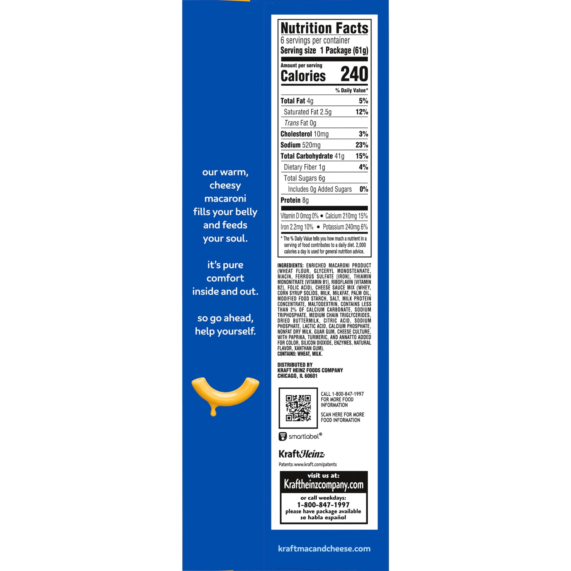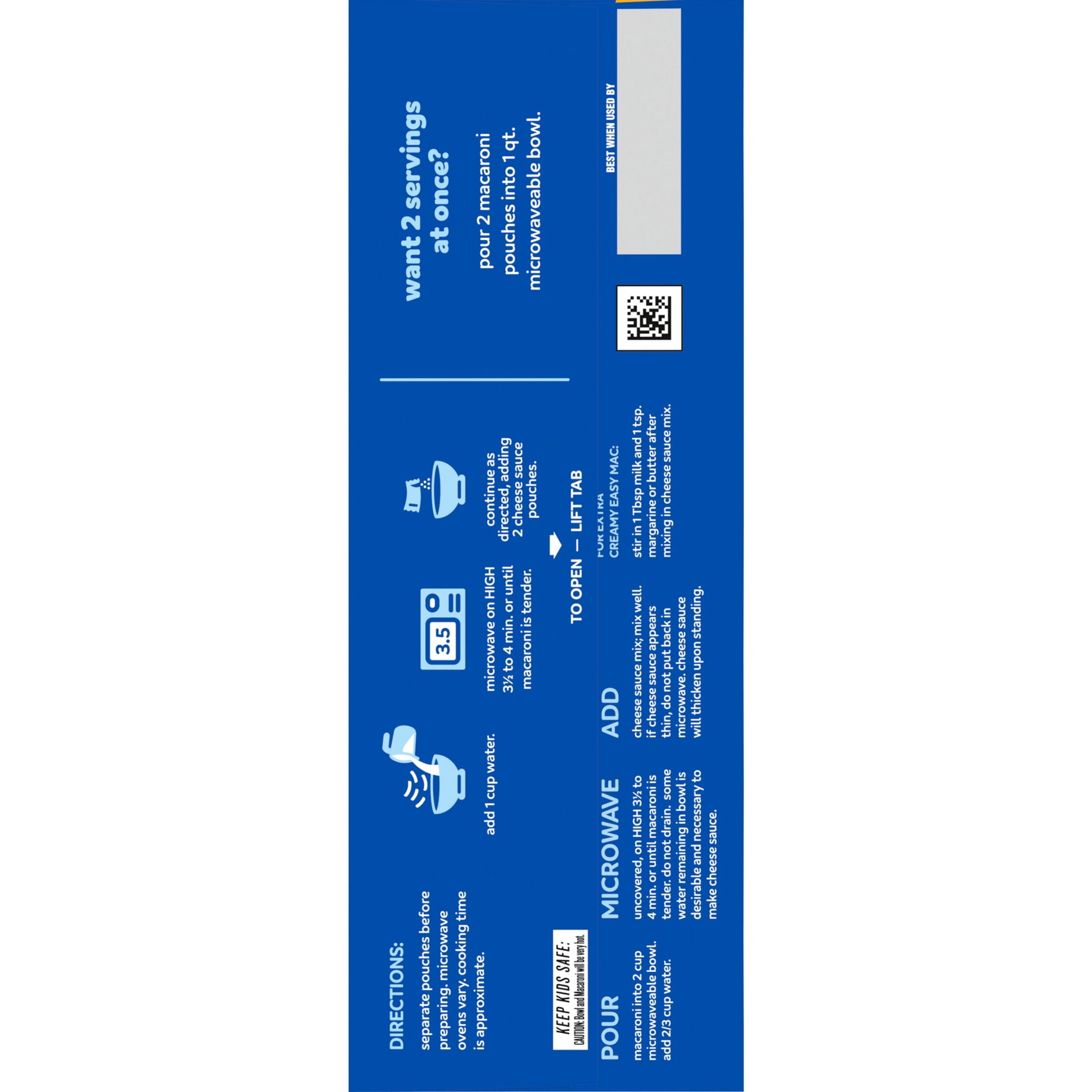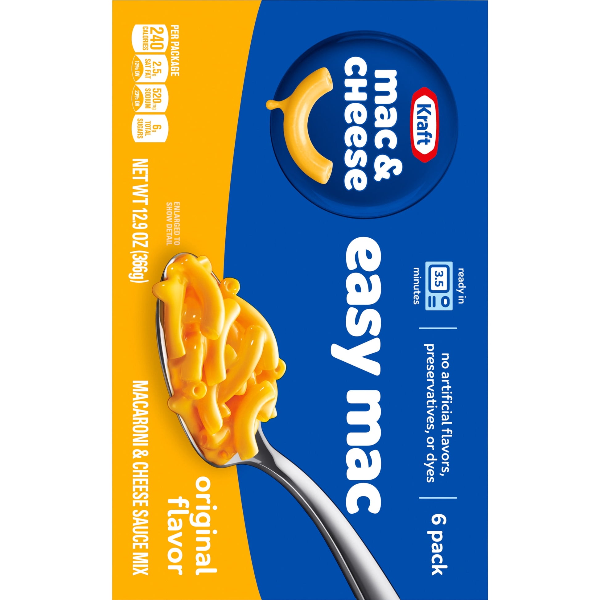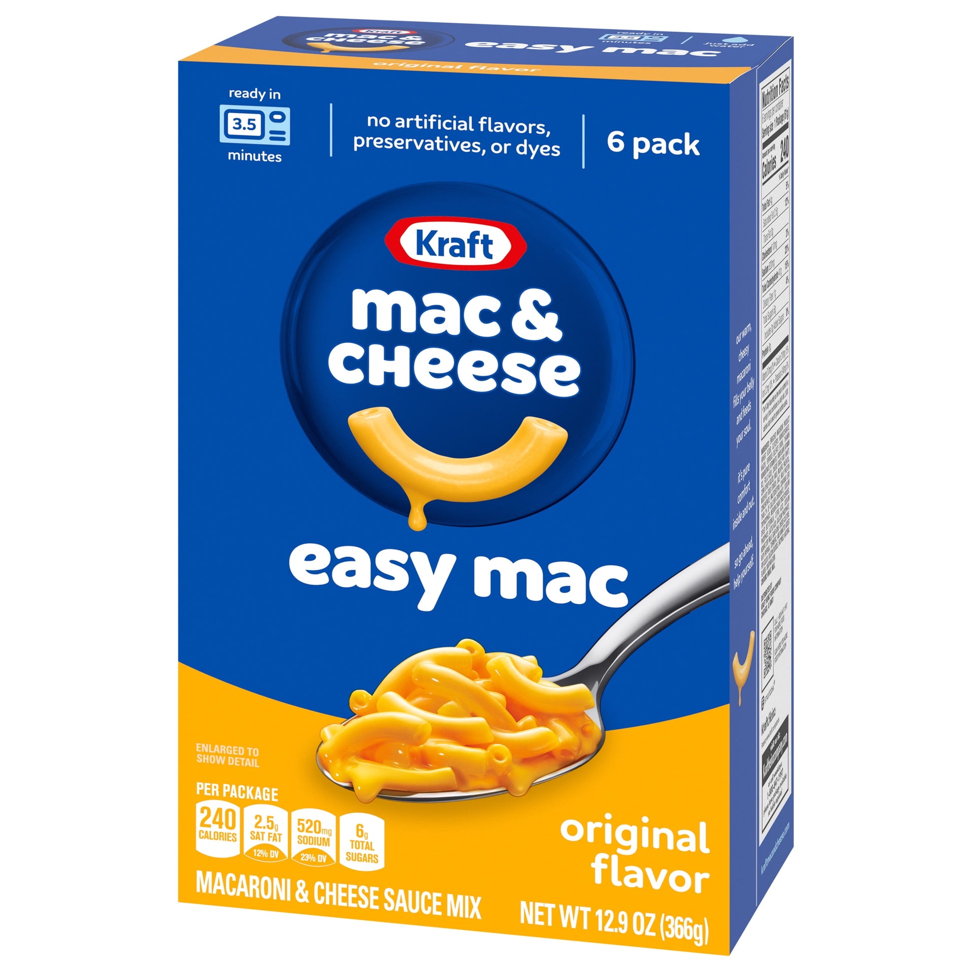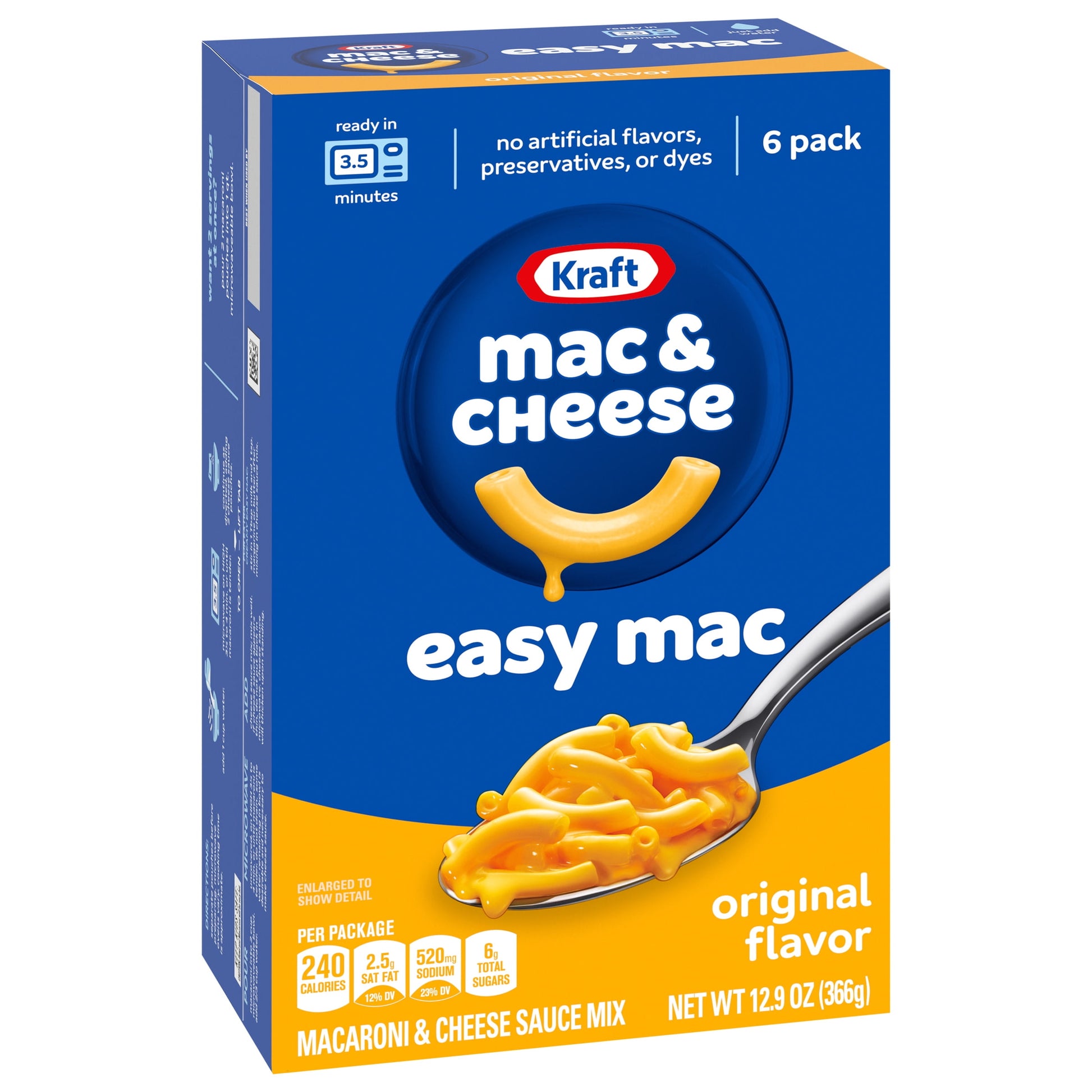 Help yourself to a bowl of comfort. Kraft Original Easy Mac Single Serve Packets are easy dinners that cook in 3-1/2 minutes. Kids and adults love the rich taste and creamy texture of macaroni pasta with cheesy goodness. Easy macaroni and cheese packets include pasta and original flavor cheese sauce mix so you have everything you need to make dorm food or a quick dinner for kids. With no artificial flavors, preservatives or dyes, an easy macaroni and cheese dinner is always great. Preparing microwave macaroni and cheese is a breeze. Just add water to the pasta, microwave for 3-1/2 minutes and stir in the cheese mix. Our 12.9 ounce box includes 6 macaroni pouches with 6 cheese pouches, to make 6 single servings. Kraft Mac & Cheese inspires the positive power of comfort.