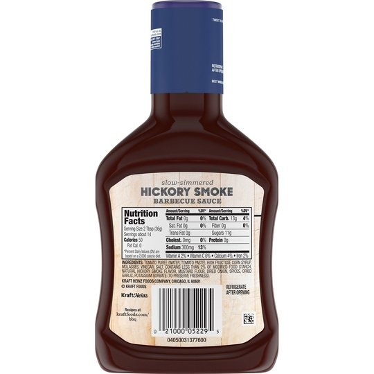 Kraft Hickory Smoke Slow-Simmered BBQ Sauce and Dip adds bold, smoky barbecue flavor to almost anything. Bursting with molasses, vinegar, spices and smoky hickory flavor, this tangy BBQ sauce delivers mouthwatering flavor in every bite. This hickory smoked BBQ sauce is thick enough for spreading or dipping, and it makes a great meat marinade. With 50 calories per serving, youll feel good about adding this hickory BBQ sauce to all your favorite appetizers and entrees. Try it on baby back ribs, as a pulled pork BBQ sauce or as a dipping sauce for chicken wings and nuggets. This hickory barbeque sauce is packaged in a squeezable 17.5 ounce bottle to preserve flavors.