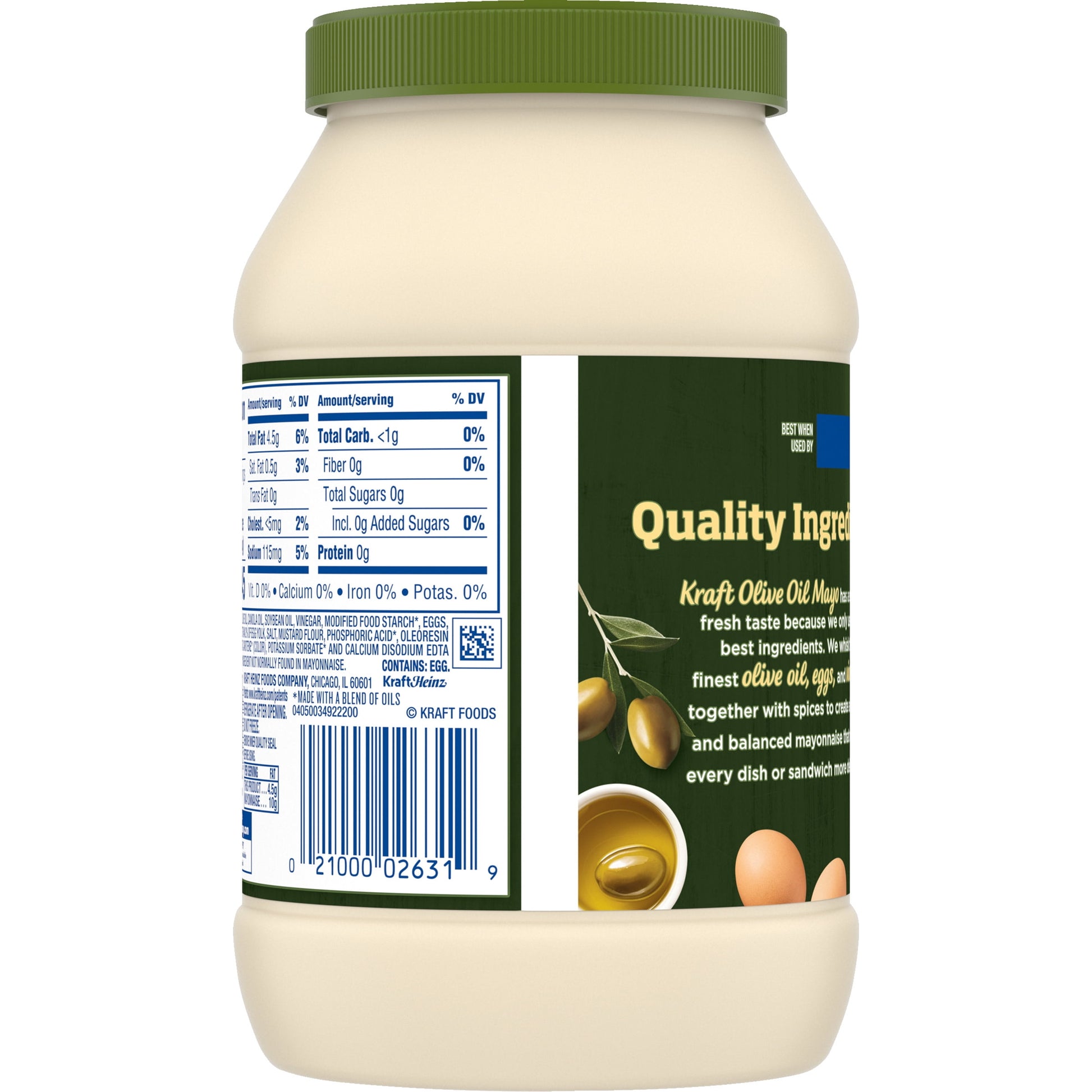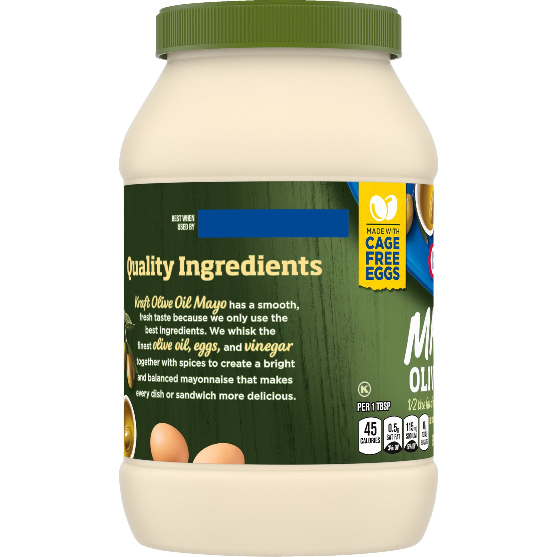 Kraft Reduced Fat Mayonnaise with Olive Oil is made with whole cage-free eggs, vinegar, lemon, onion and other natural flavors and ingredients