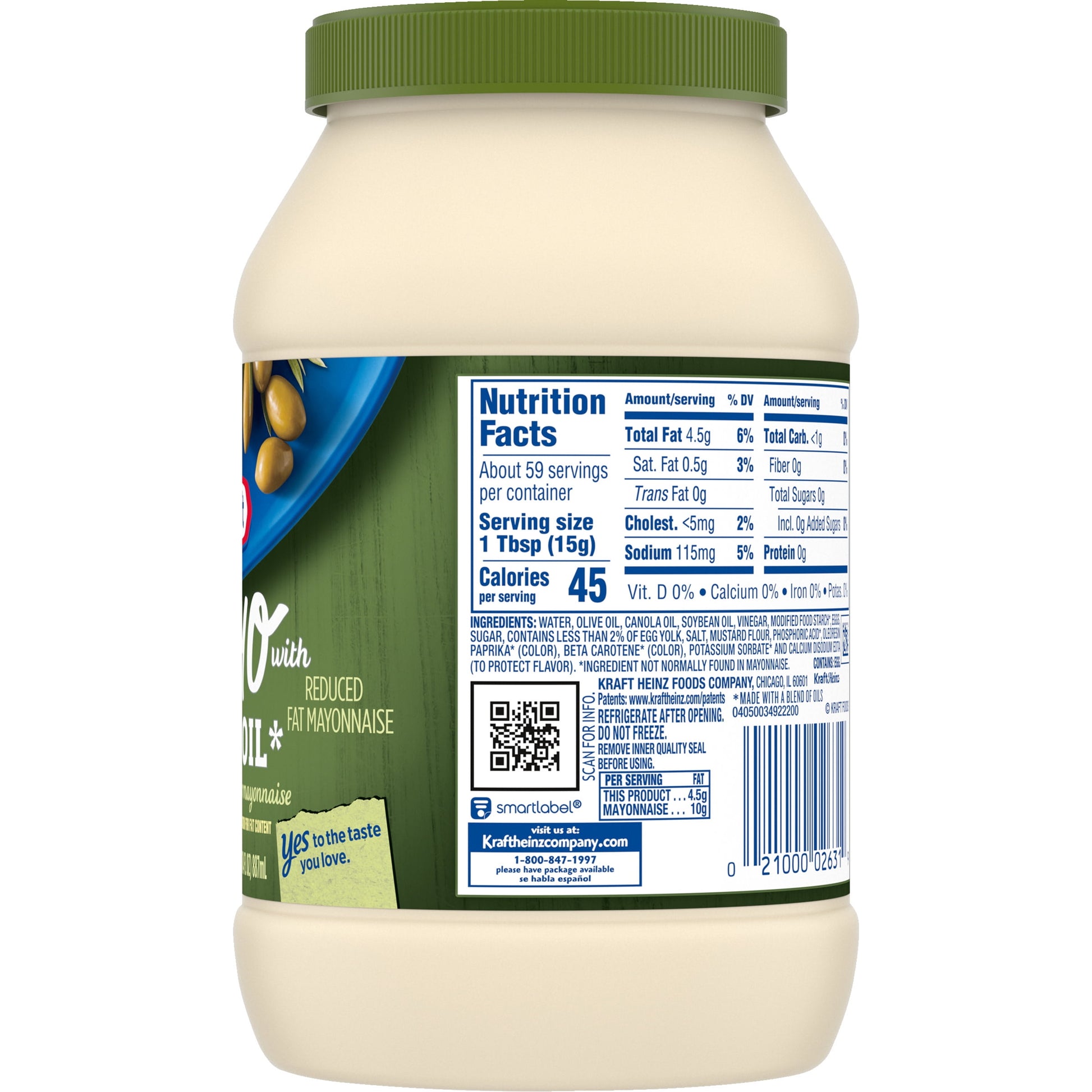 Kraft Mayo Reduced Fat Mayonnaise with Olive Oil offers a smooth, delicious taste because it's produced with only the best ingredients. Made with the finest olive oil and cage free whole eggs, this reduced fat mayonnaise has a savory flavor that complements a wide range of foods. Our spreadable olive oil mayo arrives ready to use, so you can quickly apply it to bread. Each serving of mayo with olive oil has 50 calories. Spread this mayonnaise with olive oil on bread for a delicious sandwich, or add it to tuna salad for a superb flavor. For the best quality, refrigerate this 30 fluid ounce jar of mayo after opening.