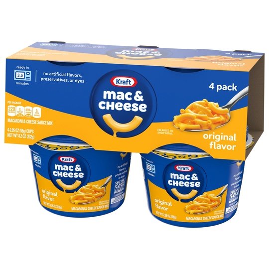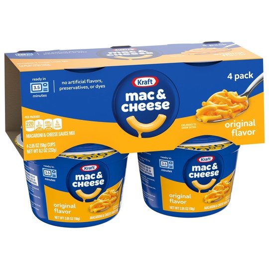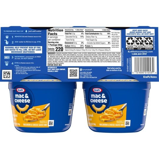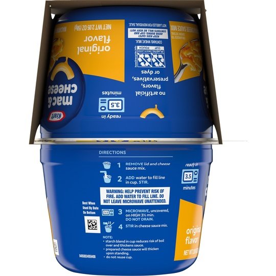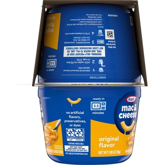 Each macaroni and cheese cup includes macaroni pasta and original flavor cheese sauce mix