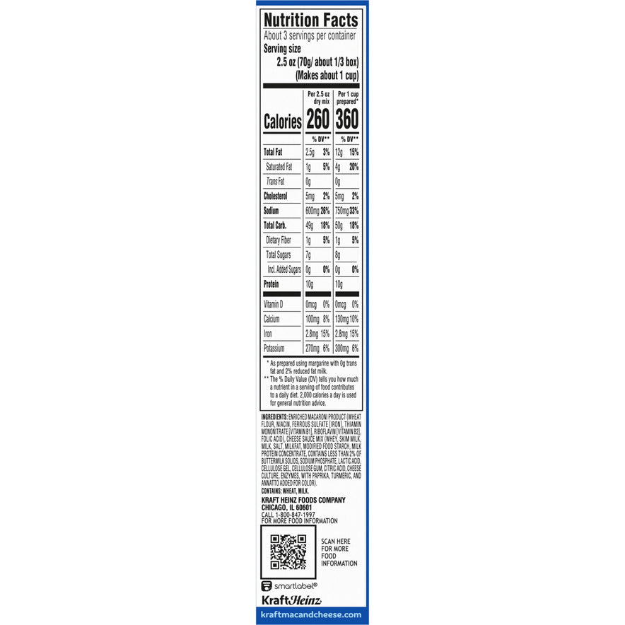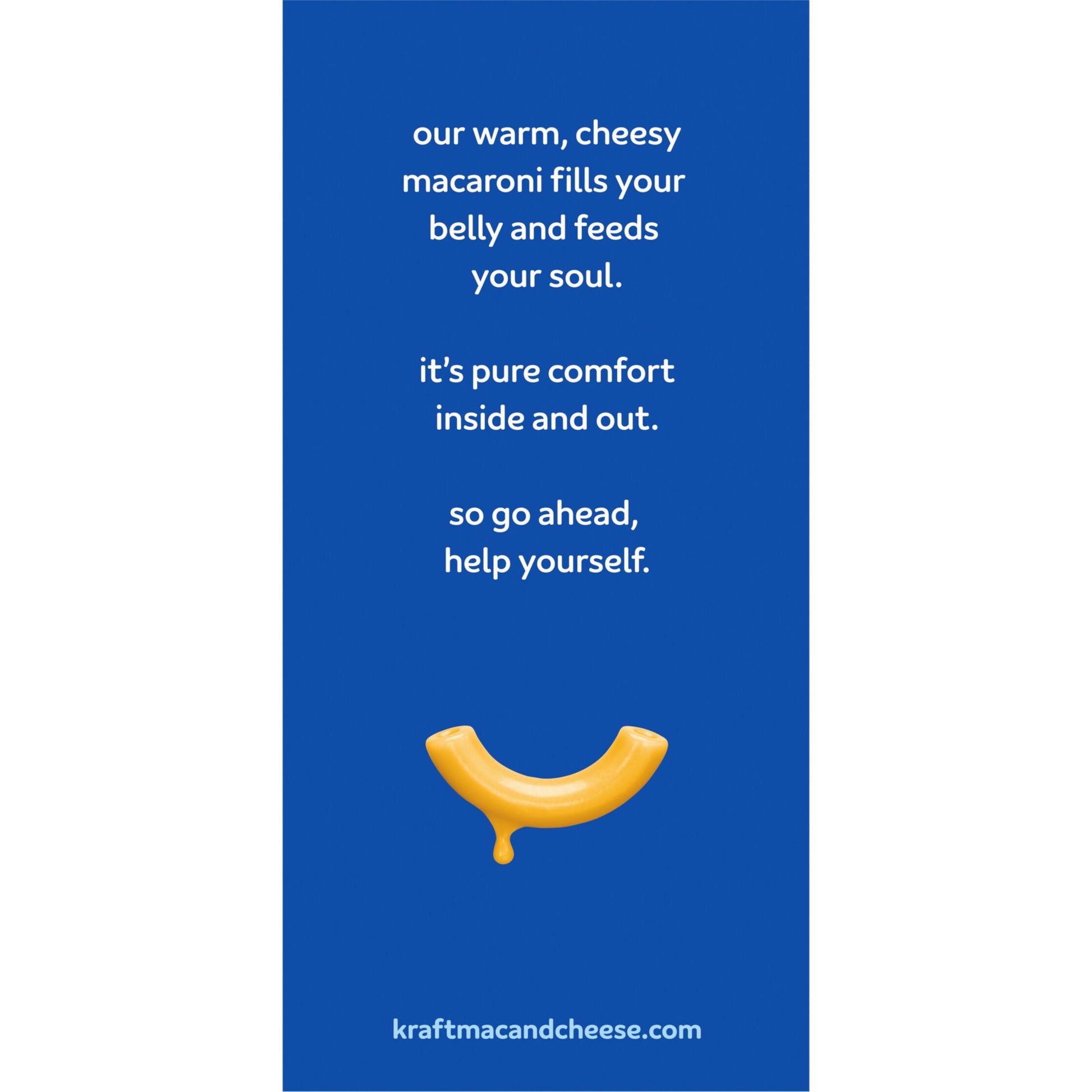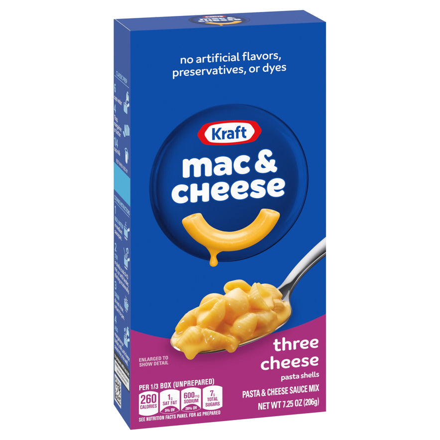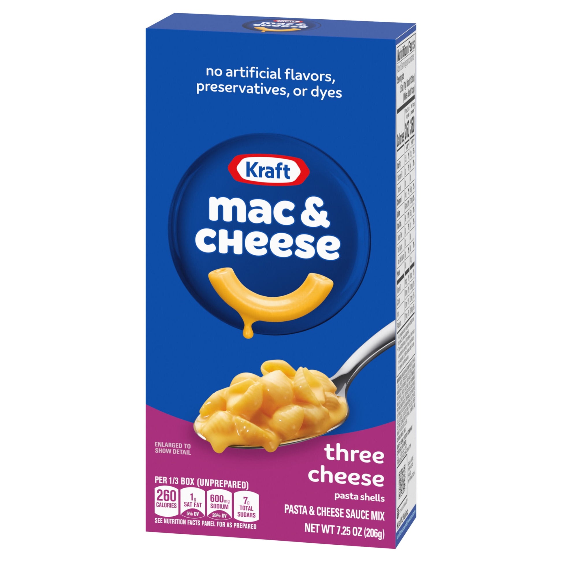 Help yourself to a bowl of comfort. Kraft Mac & Cheese Three Cheese is a convenient boxed dinner. Kids and adults love the delicious taste of mini-shell pasta with cheesy goodness. Our 7.25 ounce mac & cheese dinner includes mini-shell pasta and three cheese flavor cheese sauce mix, so you just need milk and margarine or butter to make a tasty mac and cheese. Macaroni and cheese is a quick dinner kids love. With no artificial flavors, preservatives or dyes, Kraft Mac & Cheese is always a great family dinner choice. Preparing macaroni and cheese is a breeze. Just boil the pasta for 8-10 minutes, drain the water and stir in the cheese mix, milk, and margarine or butter. Kraft Mac & Cheese inspires the positive power of comfort.