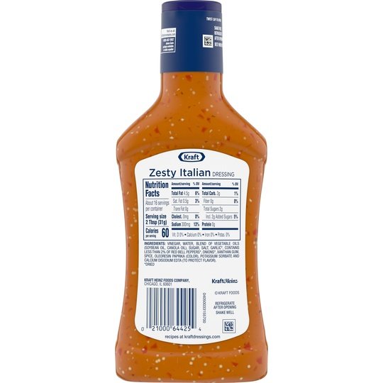 Kraft Zesty Italian Dressing adds delicious flavor to almost anything. Bursting with Italian seasonings and spices, our family favorite dressing delivers flavor in every bite. Pre-mixed for convenience, our Italian dressing is ready to enjoy after a quick shake. With no high fructose corn syrup and 60 calories per serving, you'll feel good about adding this zesty Italian dressing to salad mixes, pasta salads, sandwiches and all your favorite appetizers and entrees. This dressing also makes the perfect marinade for your favorite protein. Each 16 fluid ounce squeezable dressing bottle comes with a convenient applicator top so you can add the perfect amount to all your favorite dishes.