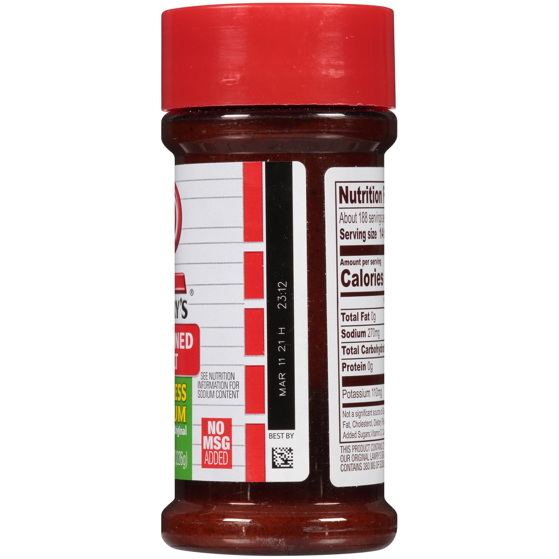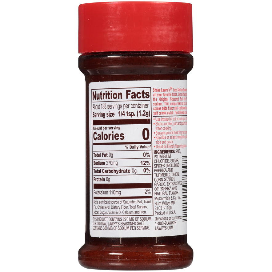 Lawry's Less Sodium Seasoned Salt delivers the same great taste as the Original Lawry's Seasoned Salt but with 25% less sodium. It's a simple way to add unique flavor to just about any meal or snack. Featuring a bold blend of natural herbs and spices, including paprika, turmeric, onion and garlic, seasoned salt pairs perfectly with baked chicken, hamburgers, fries, baked potatoes, mashed potatoes, or any potato side dish for great flavor you'll love. This Lawry's® 25% Less Sodium Seasoned Salt is in a Plastic bottle that is 8 ounces. Store this shelf-stable item at an ambient temperature.