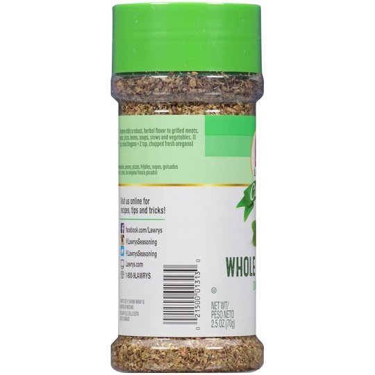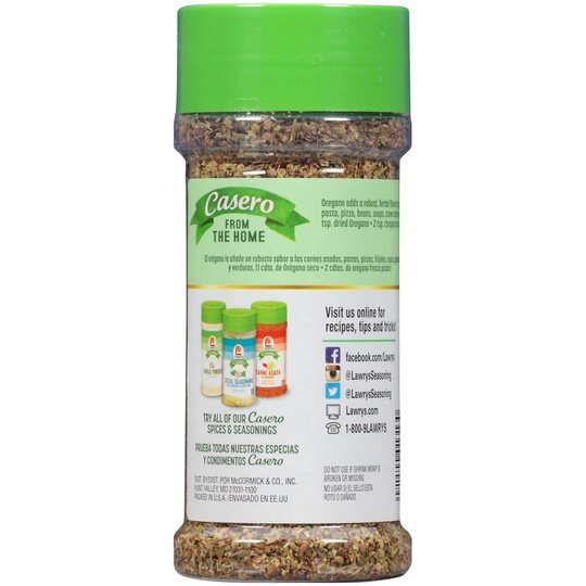 Lawry's Casero Whole Oregano (Orégano) has pungent aroma and bold flavor that's slightly lemony and peppery – a perfect complement to grilled meats, beans, soups and stews. Oregano is an essential ingredient in the cuisines of the Italy, Greece, Mexico and South America. The robust flavor of oregano enhances a wide variety of Latin American traditional dishes, including mole sauce; Ropa Vieja, Cuba’s well-loved dish of shredded beef and vegetables; Menudo, Mexico’s tripe soup; and Puerto Rican Sofrito, the aromatic starting point for many recipes. Oregano is also a favorite herb in Tex-Mex recipes for chili, tacos and refried beans. Since 1938, Lawry’s is the brand you know and trust for spices and seasonings that make a good meal great. This Lawry's® Casero Whole Oregano is in a Plastic bottle that is 2.5 ounces. Store this shelf-stable item at an ambient temperature.