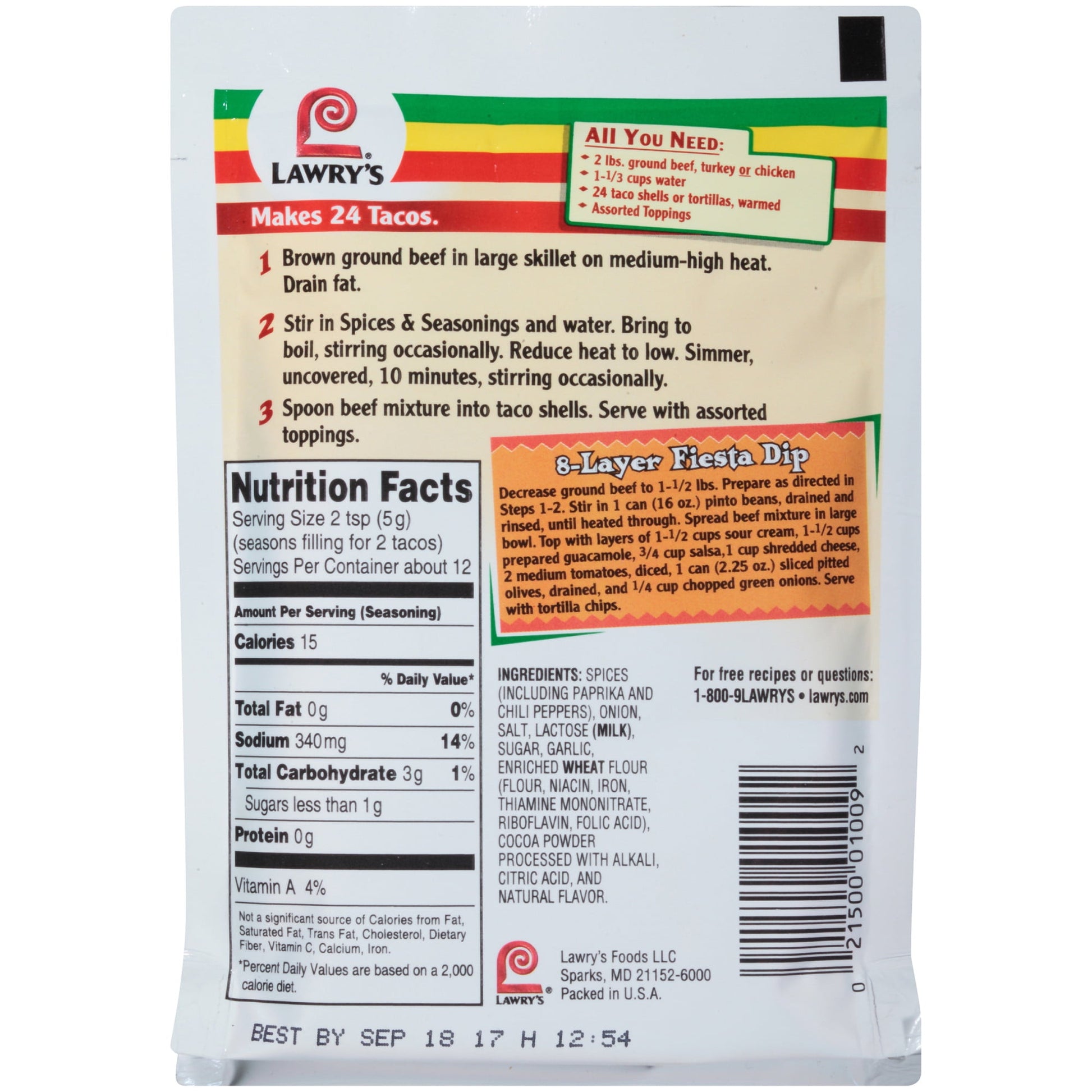 Lawry's Family Size Taco Seasoning Mix features paprika, cumin, oregano, chili peppers, onion and garlic to transform weeknight dinners or weekend get-togethers into fun-filled fiestas. All you need is ground beef, turkey or chicken, tortillas and Lawry’s Taco Seasoning Mix for the flavor of traditional tacos. Top off with guacamole! This easy-to-make seasoning mix is ideal for a quick family dinner or a taco night with friends. *Except naturally occurring glutamates This Lawry's® Family Size Original Taco Seasoning Mix is in a Plastic packet that is 2 ounces. Store this shelf-stable item at an ambient temperature.